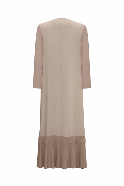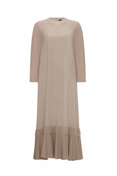 Yumuşak dokulu keten kumaşıyla nefes alabilen bir konfor sunan bu uzun elbise, etek ucundaki püskül detayları ve katmanlı görünümüyle fark yaratıyor. Uzun kolları ve sade formu, minimal bir şıklık arayanlar için ideal.