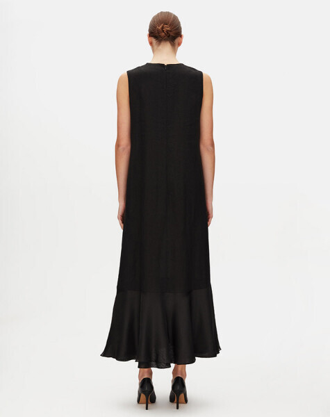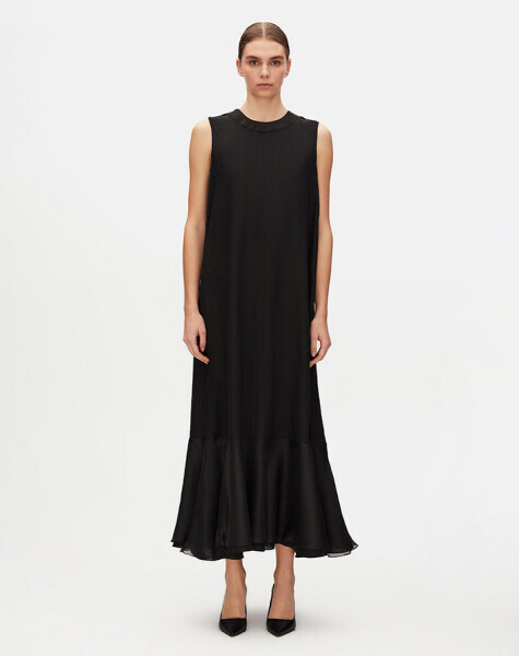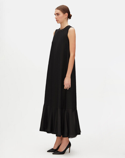 Zarif etek ucu volan detayları ve şık kolsuz tasarımıyla bu elbise, yaz şıklığınızı ön plana çıkarır. Hafif kumaşı sayesinde gün boyu rahatlık sağlar. Modern kesimi ve sade duruşuyla, özel davetler ya da günlük kullanım için mükemmeldir. Kombinlerinizi sade aksesuarlarla tamamlayarak şıklığınızı vurgulayabilirsiniz.