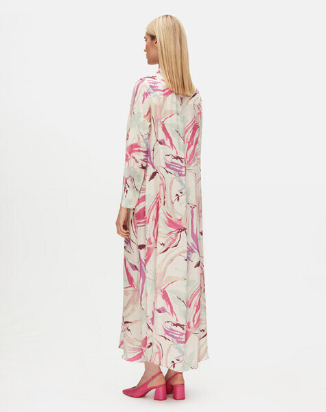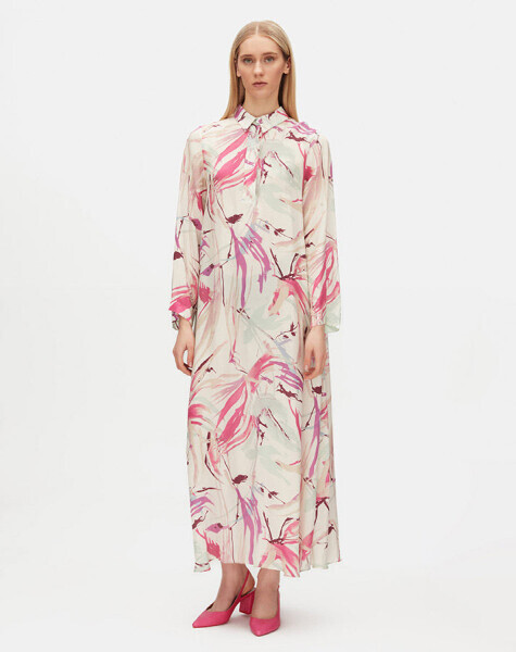 A kesim formu ile bedeni saran değil, nazikçe takip eden bir siluete sahip olan bu elbise, hareketli deseniyle enerjik ve modern bir duruş sunar. Gömlek yaka ve düğmeli ön detayıyla klasik şıklığı, uçuşan kumaş yapısıyla yaz konforunu bir arada sunar. Pastel pembe, lila ve beyaz tonlarının hâkim olduğu desen tasarımı ile hem gündüz hem akşam kombinlerinde fark yaratır.