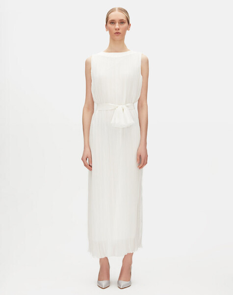 Kuşak Detaylı Tül Kolsuz Ekru Elbise