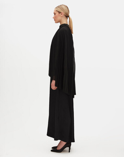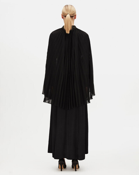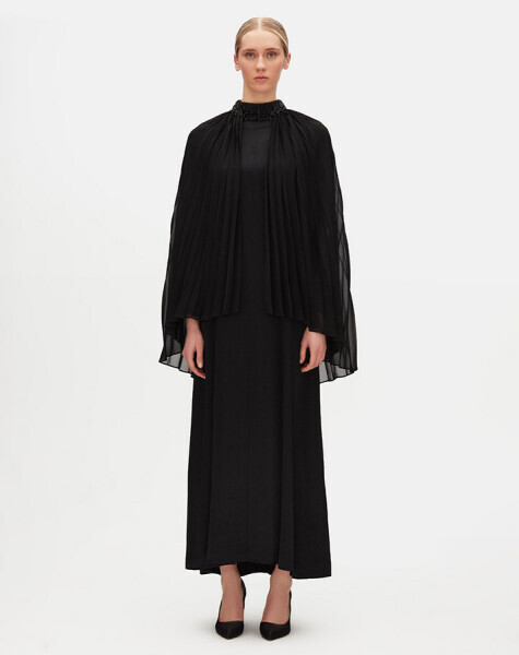Işıltılı taş süslemeleri ve zarif pelerin detayıyla dikkat çeken bu elbise, davetler ve özel anlar için ideal bir tercihtir. Akışkan yapısı ve omuzlardan aşağı süzülen pelerin tasarımı, asil bir duruş kazandırırken