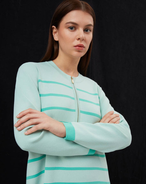 Yakası Fermuarlı Çizgili Triko Açık Yeşil Tunik