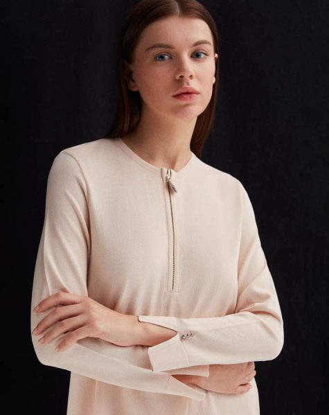 T25Y-6014 Yakası Fermuarlı Düz Renk Triko Tunik 1021-SAND