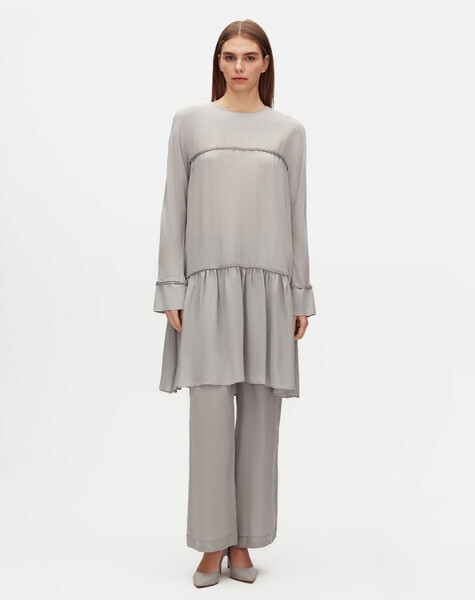 Tiktak Detaylı Rahat Kesim Cupro Gri Tunik