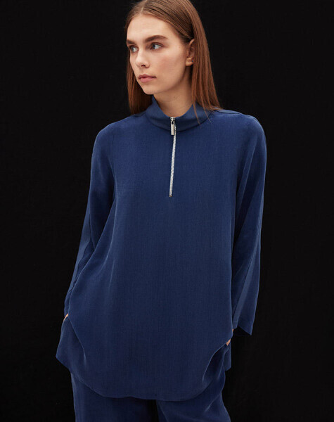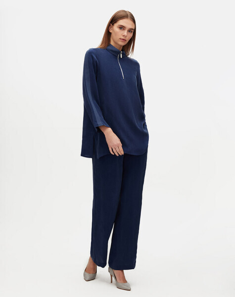 Dik Yaka Fermuarlı Uzun Kollu Cupra Lacivert Tunik