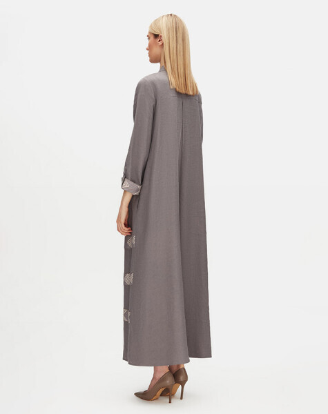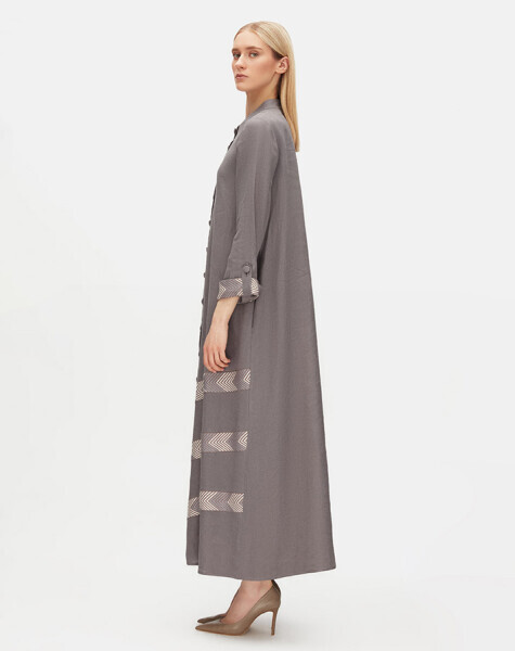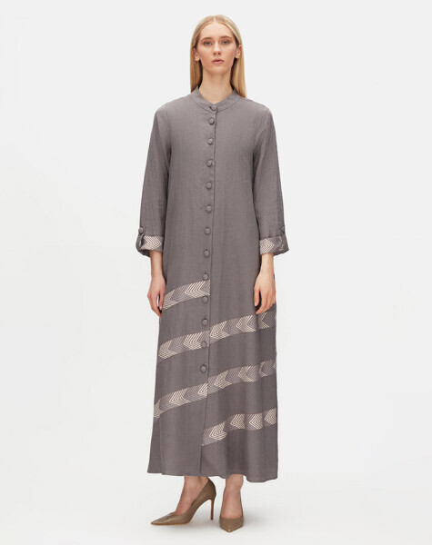 Desen Detaylı Yuvarlak Yaka Uzun Keten Antrasit Ceket