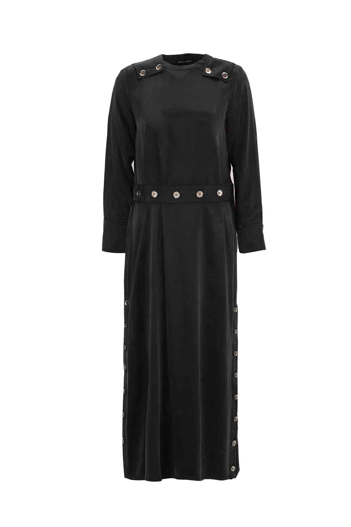 T26K-4020 Düğme Detaylı Düz Renk Elbise BLACK