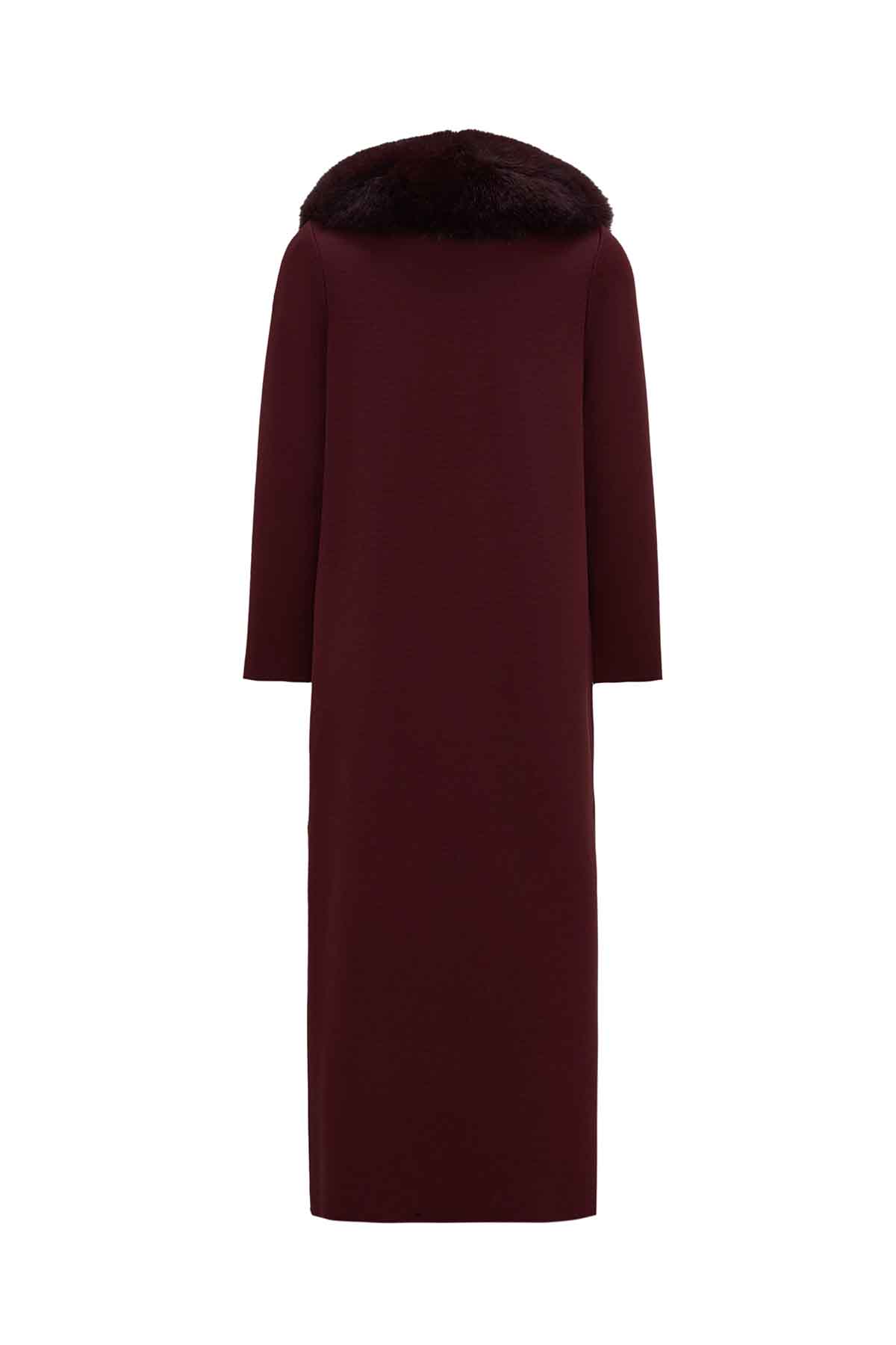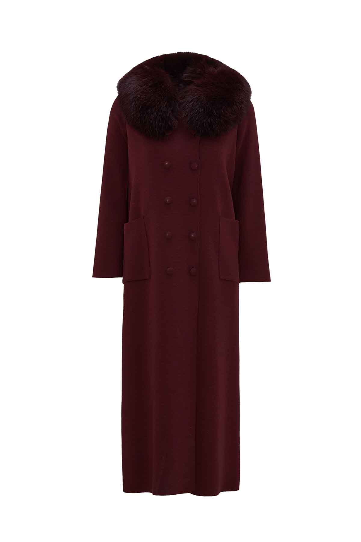 T26K-8001 Yakası Kürklü Uzun Kruvaze Triko Ceket TOGA-BORDO