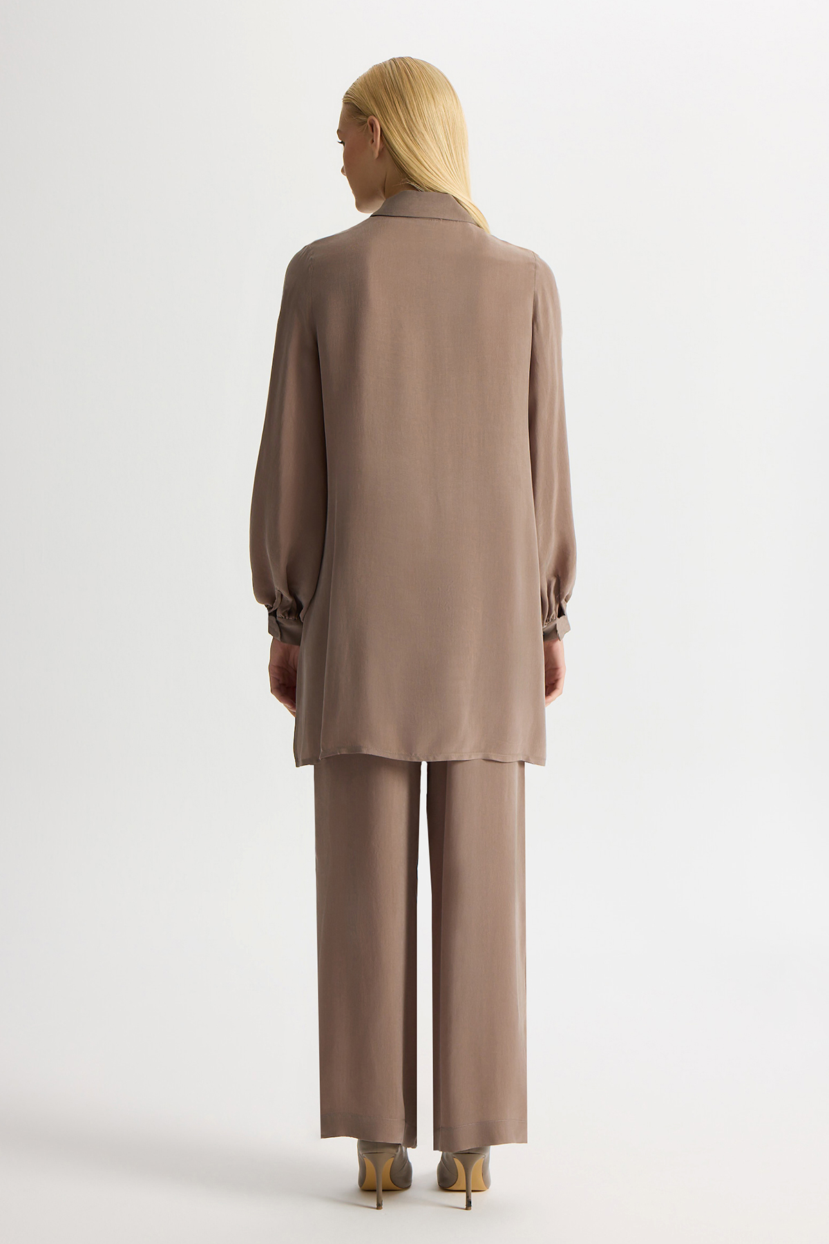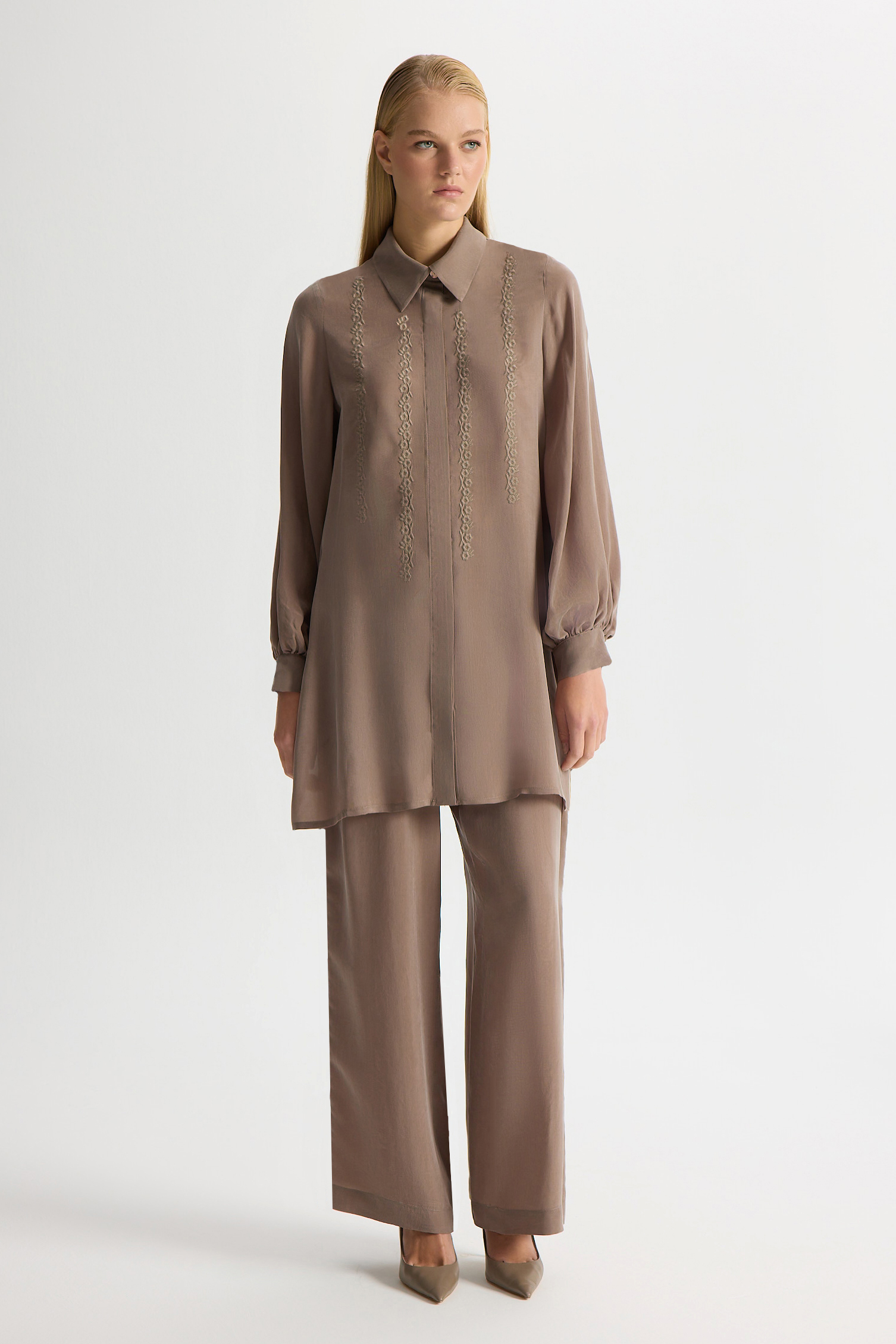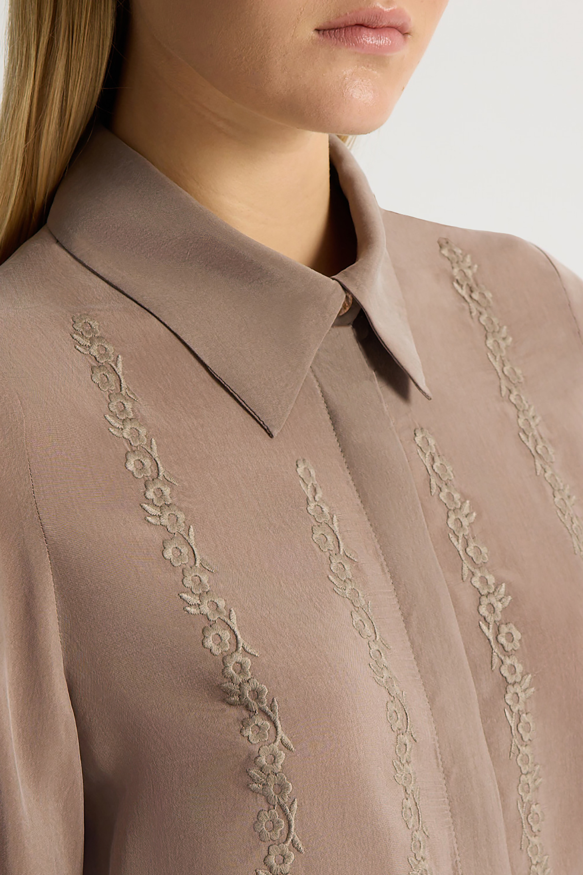 Nakış Detaylı Cupro Gömlek Kahverengi Pudra
