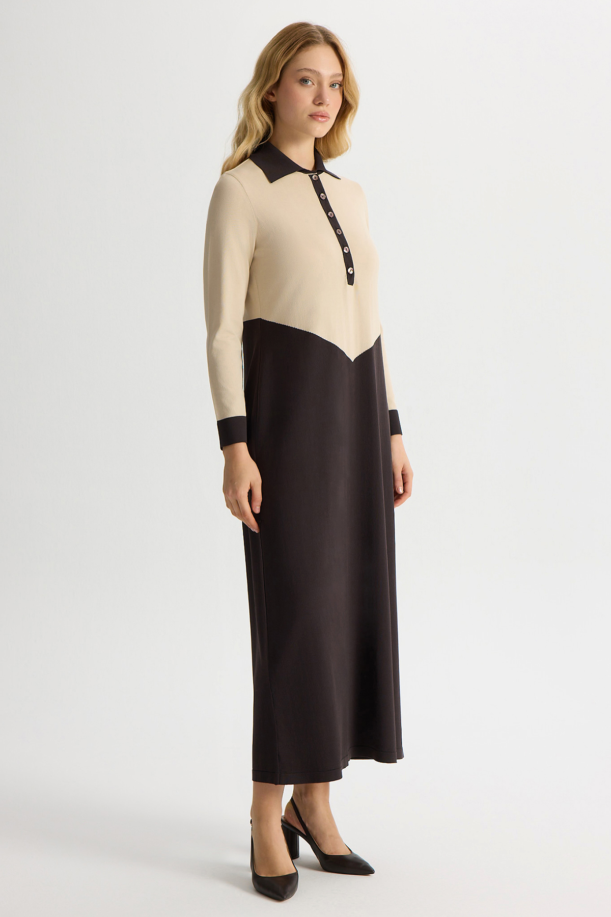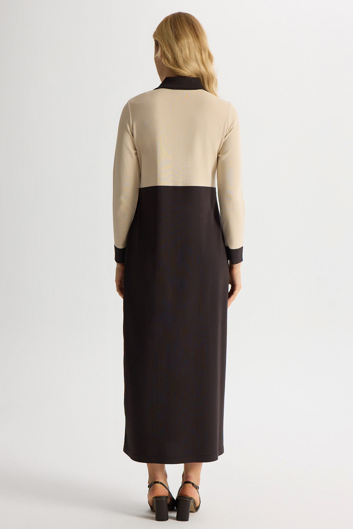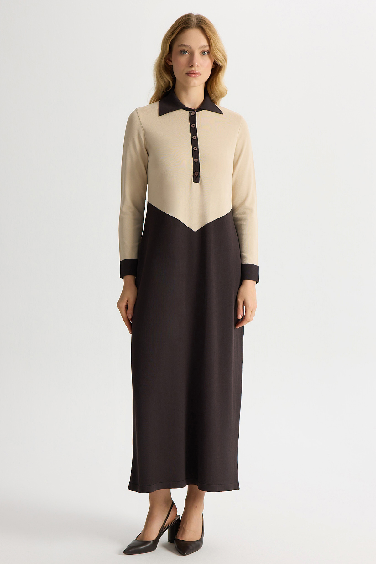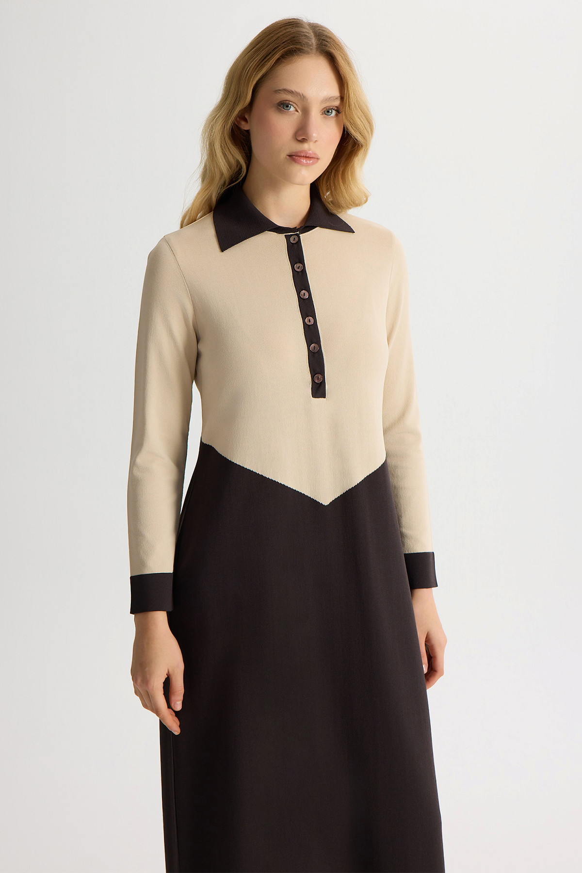 Renk Bloklu Gömlek Yaka Triko Elbise Kahverengi Pudra