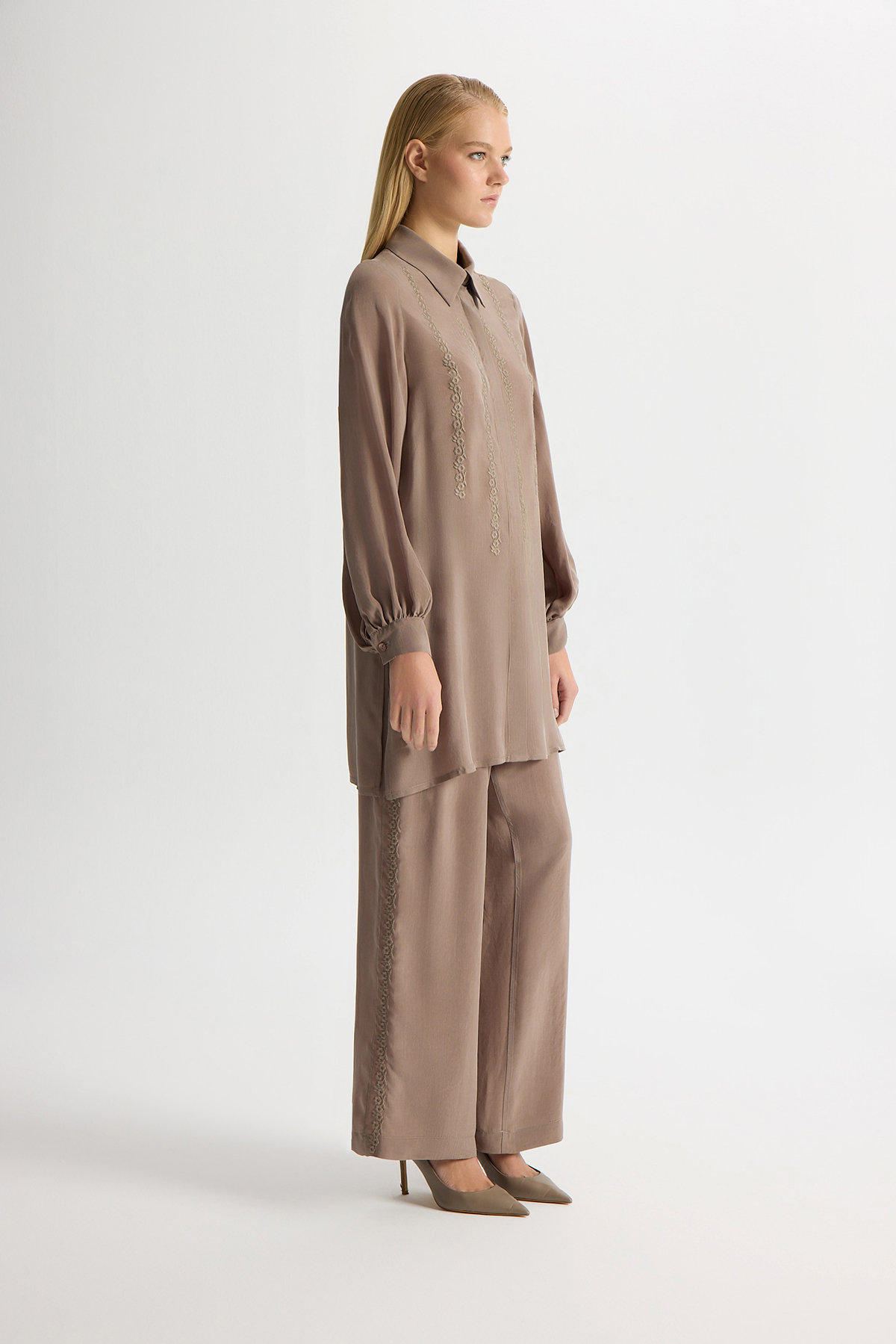 Yanları Nakışlı Bol Paça Cupro Pantolon Kahverengi Pudra