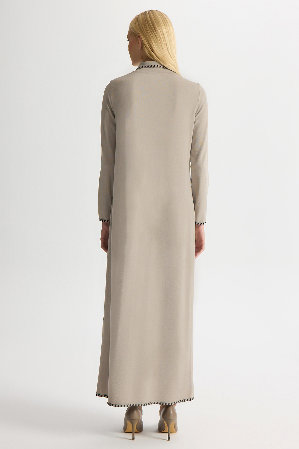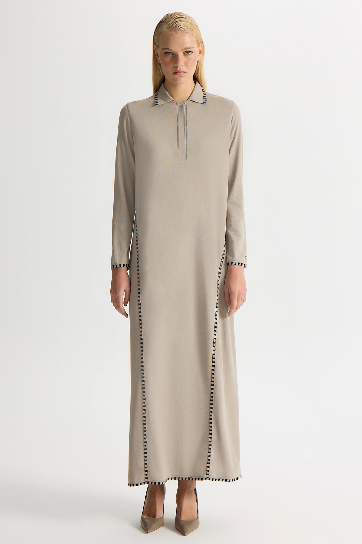 Tiktak Detaylı Gömlek Yaka Triko Elbise Stone