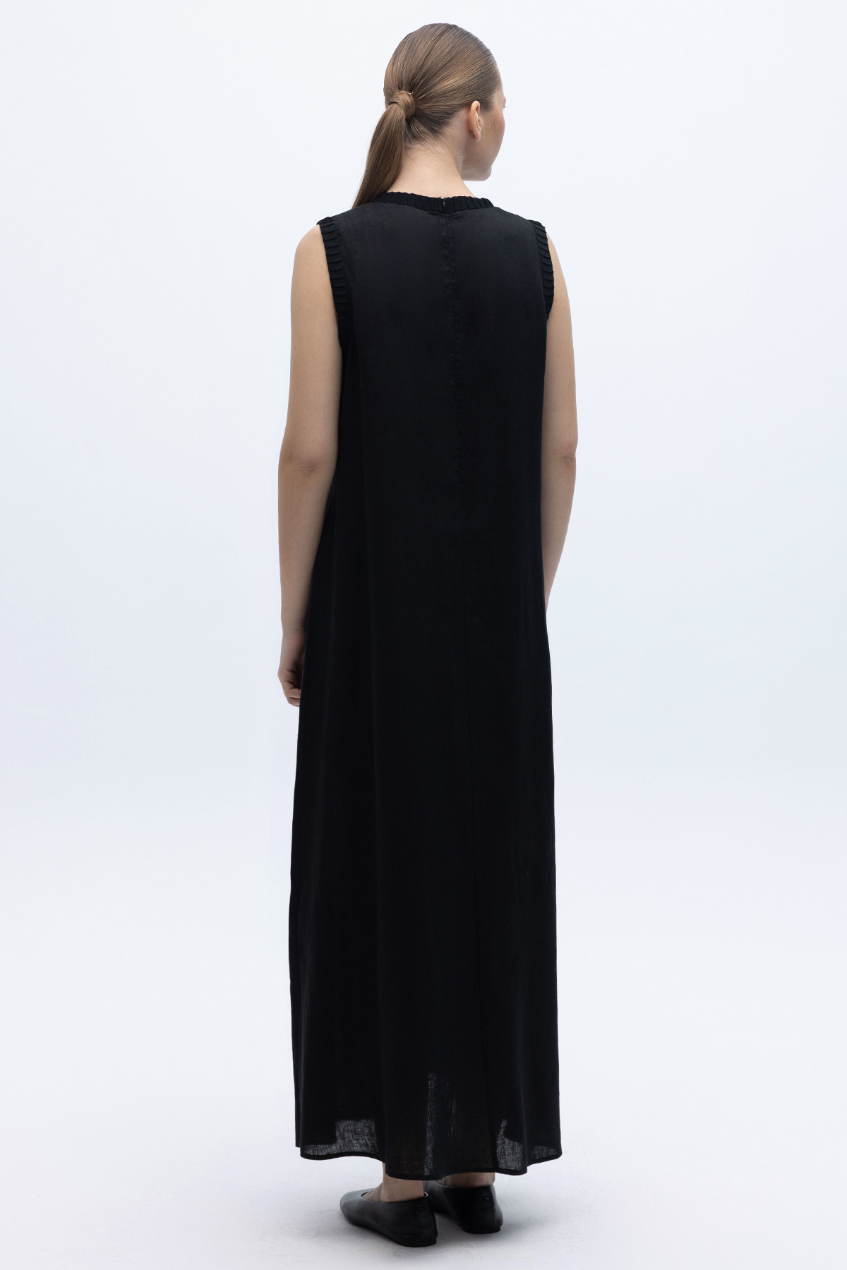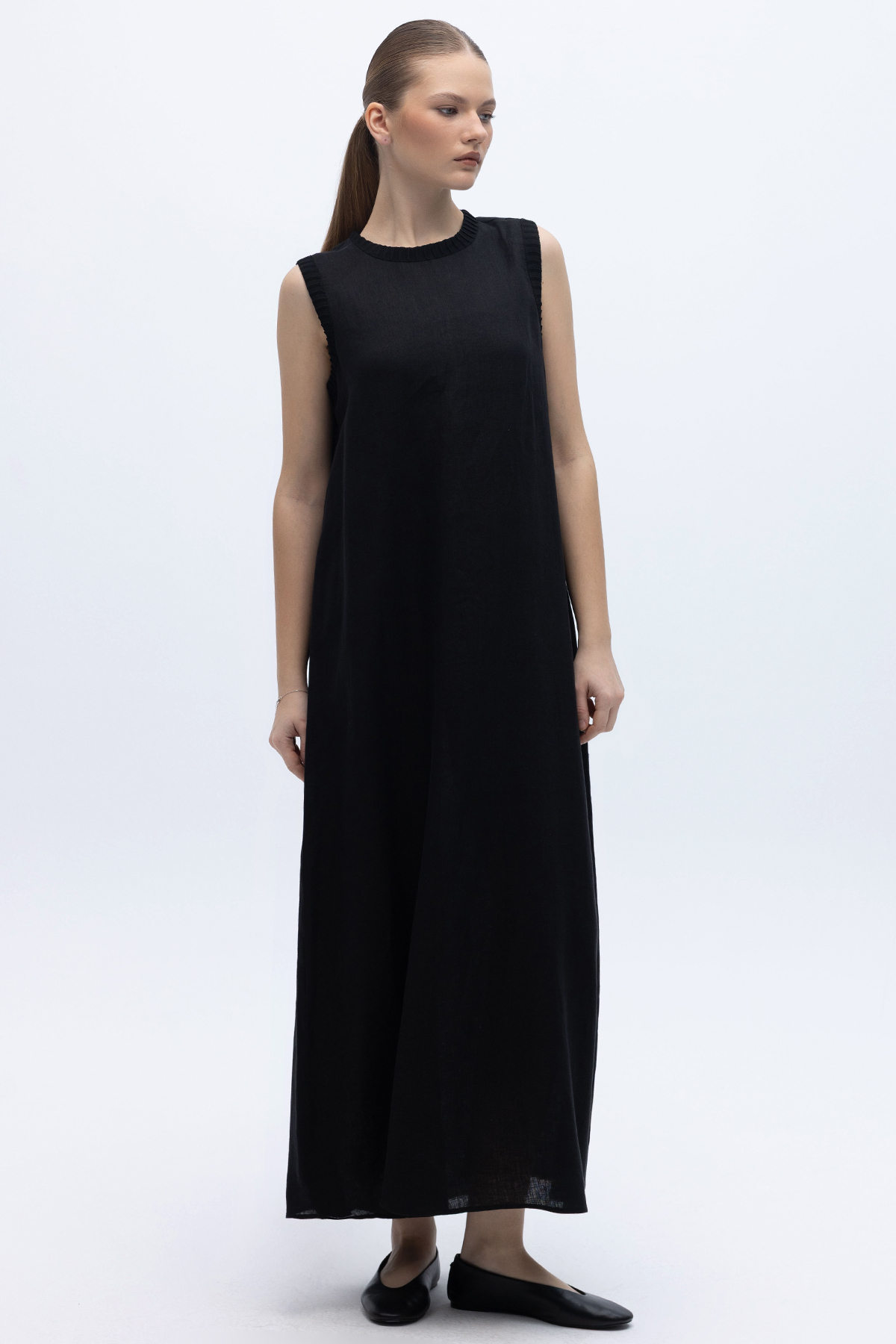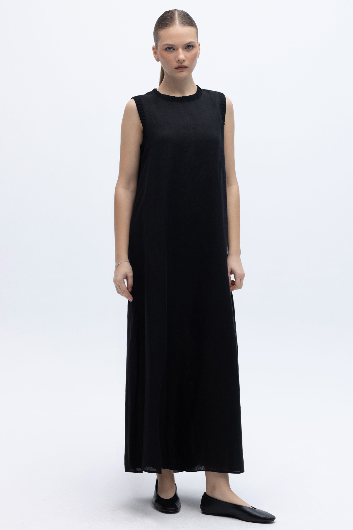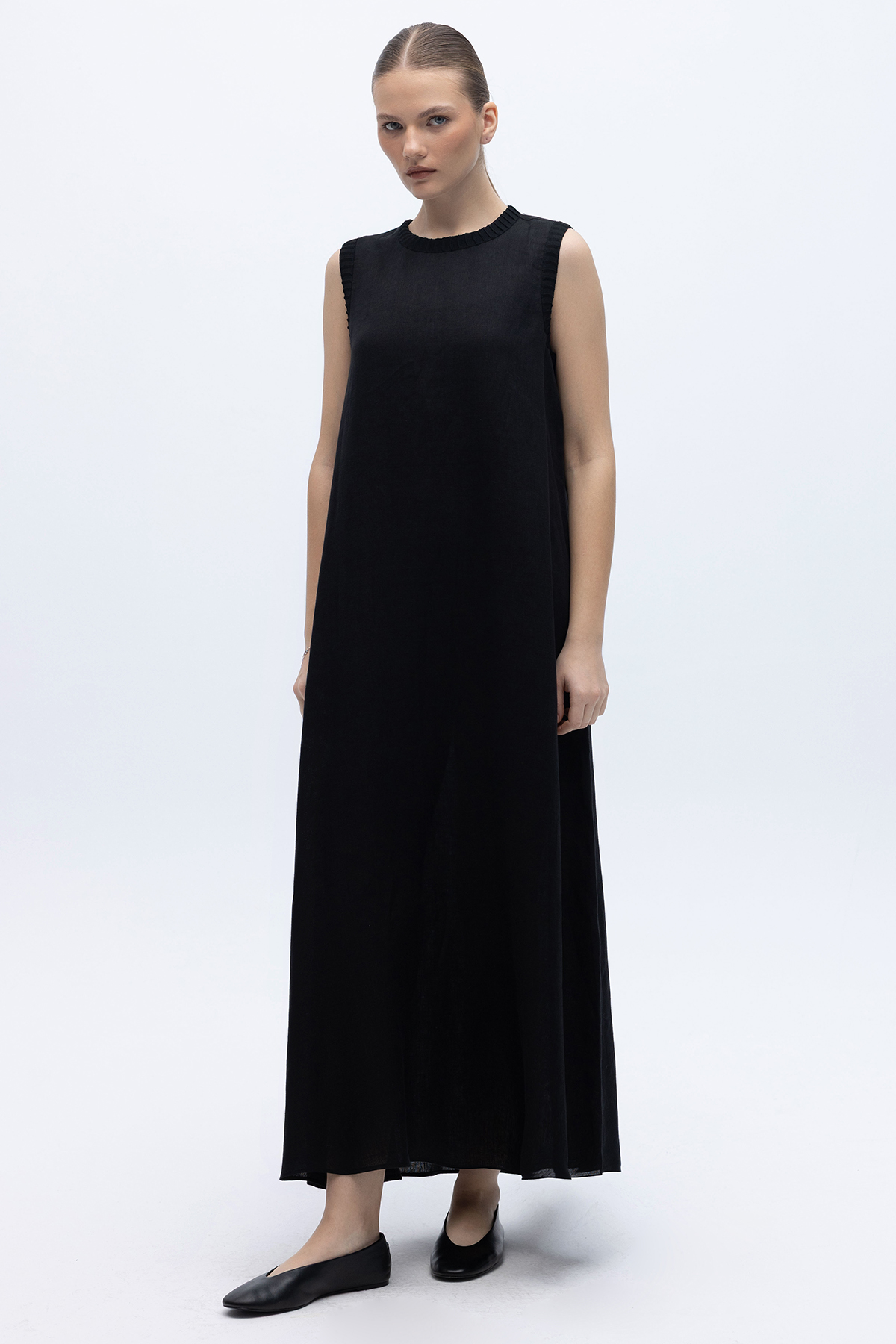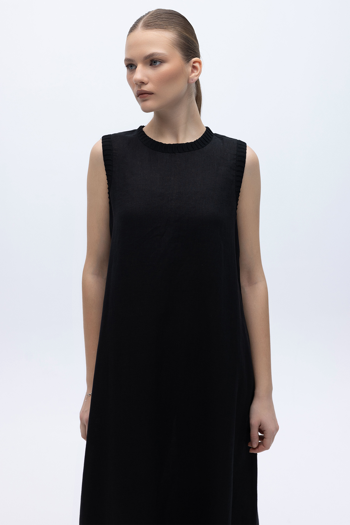 Triko Bantlı Kolsuz Keten Elbise Siyah