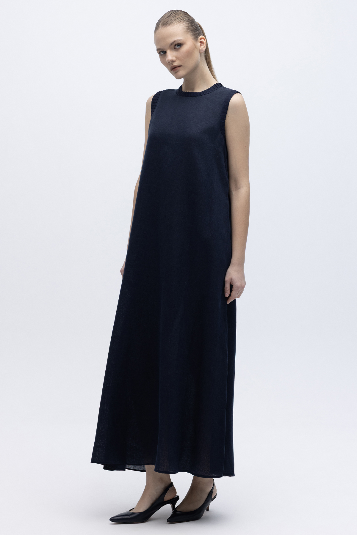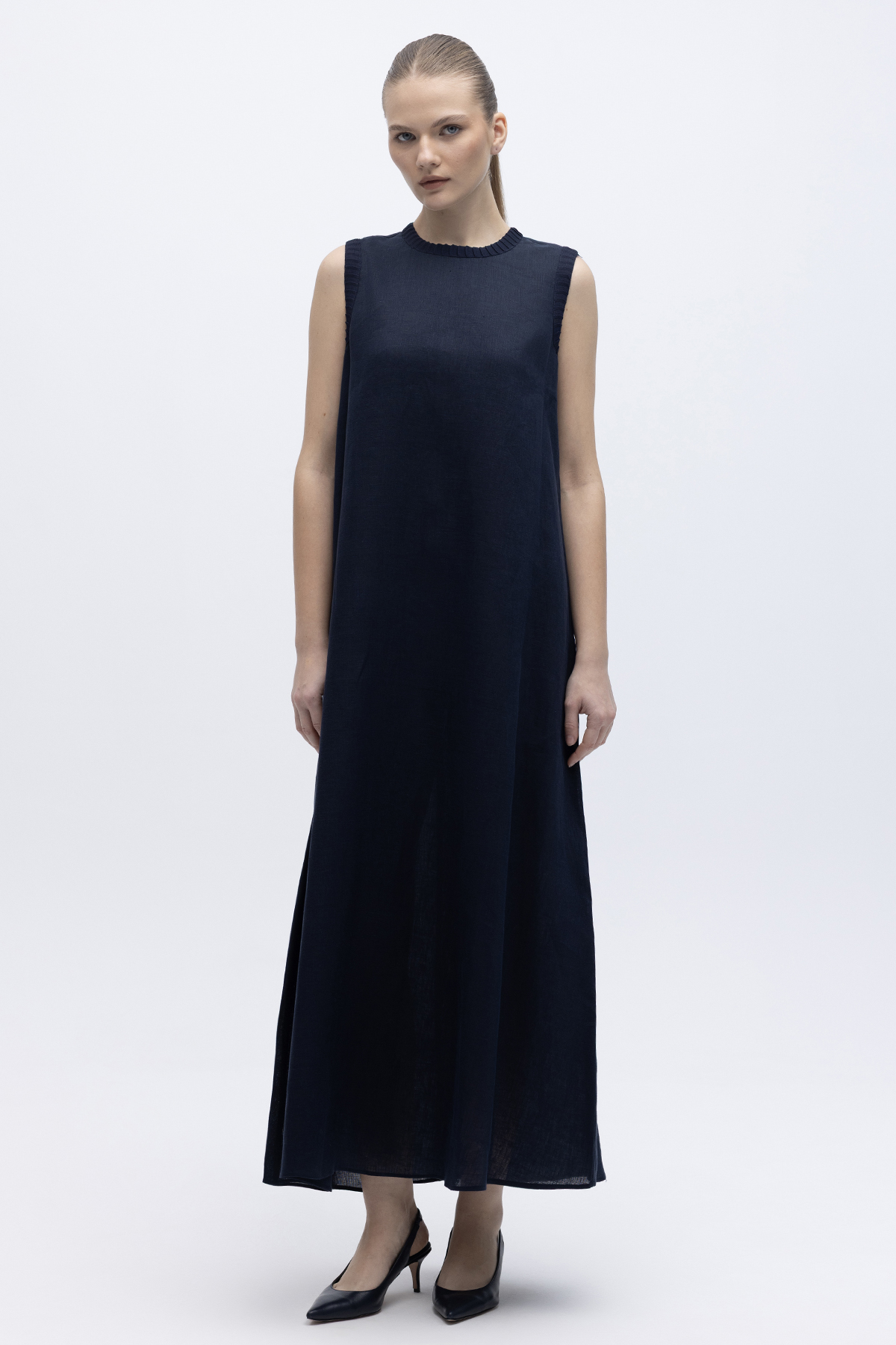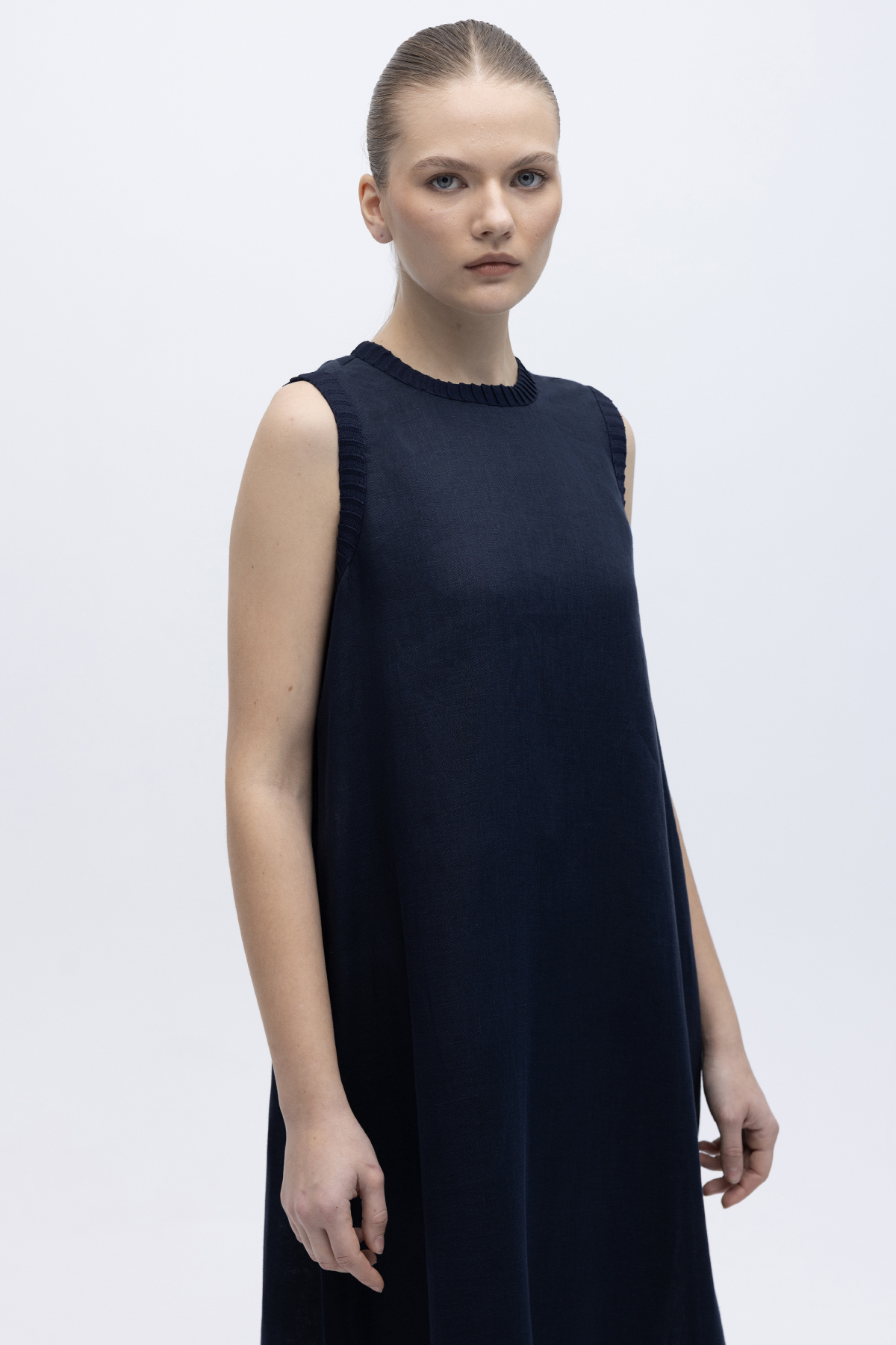 Triko Bantlı Kolsuz Keten Elbise Lacivert