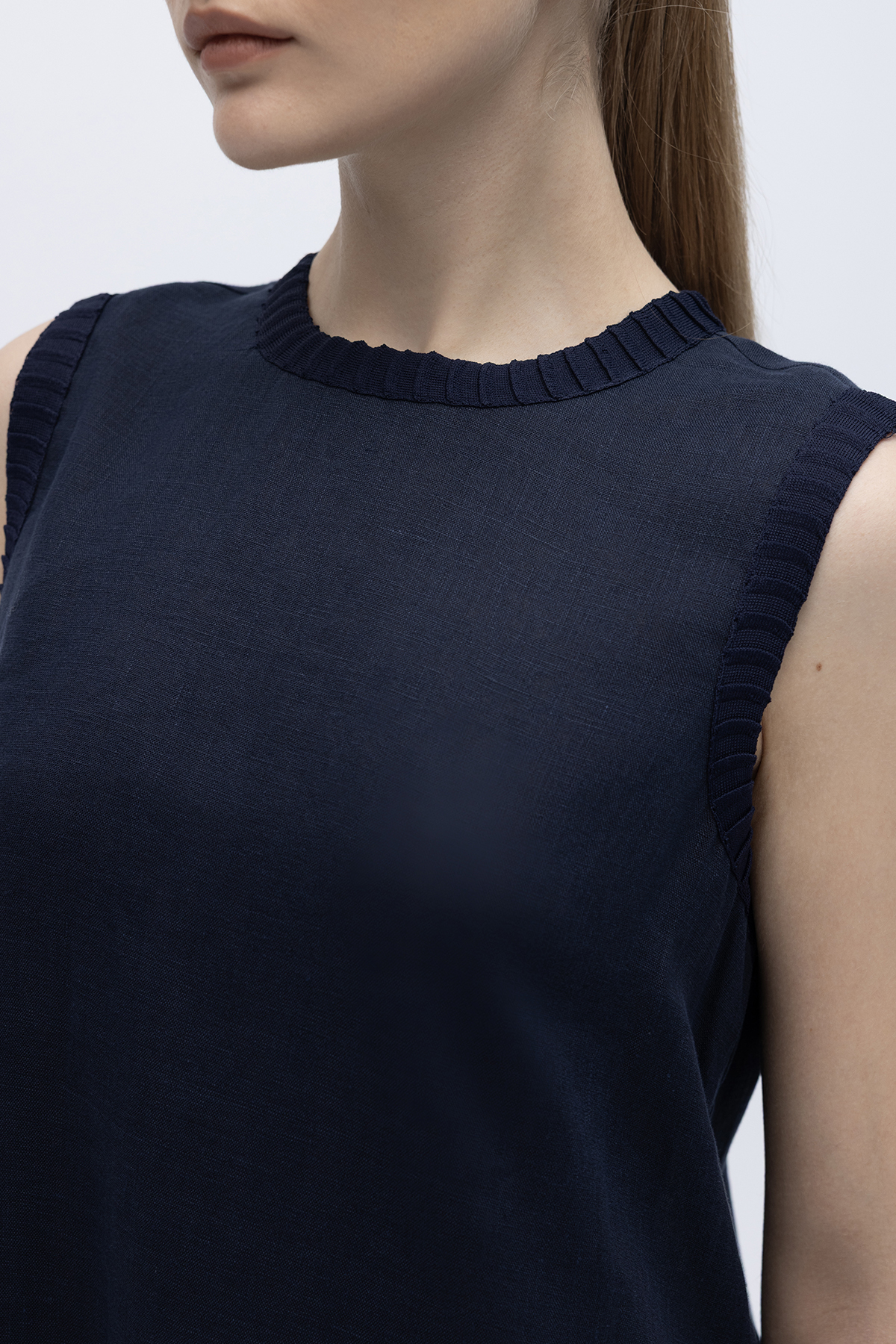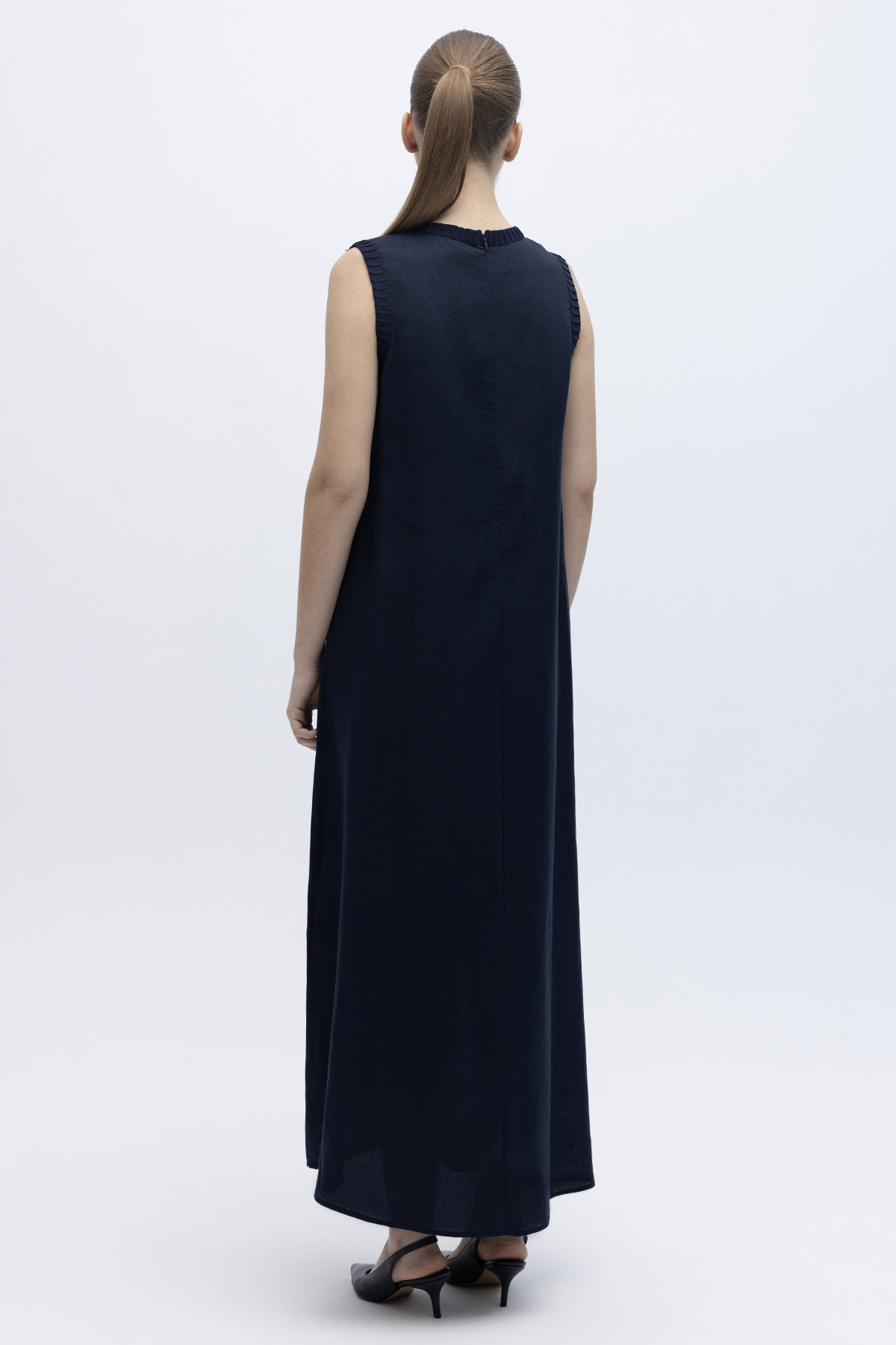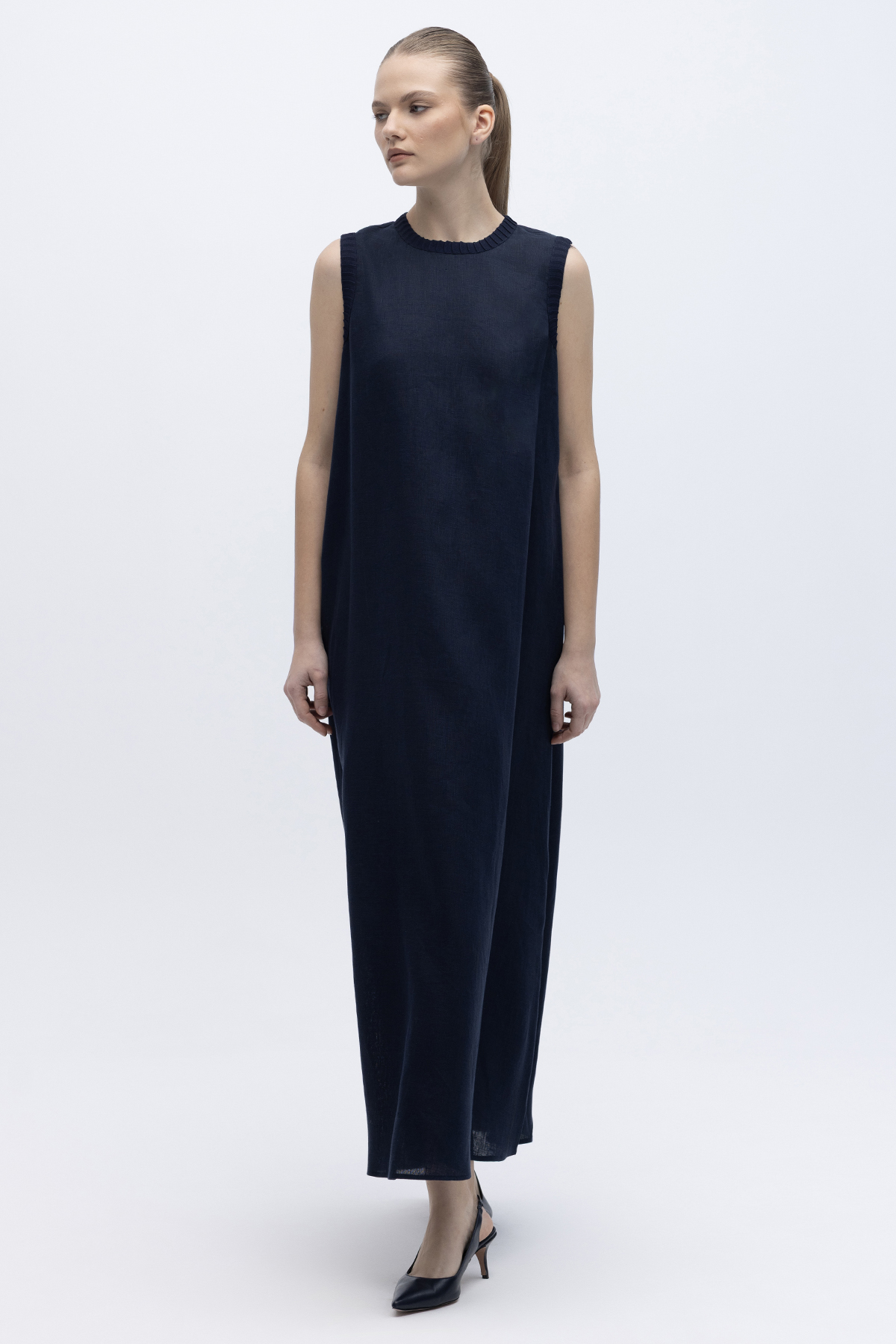 Triko Bantlı Kolsuz Keten Elbise Lacivert