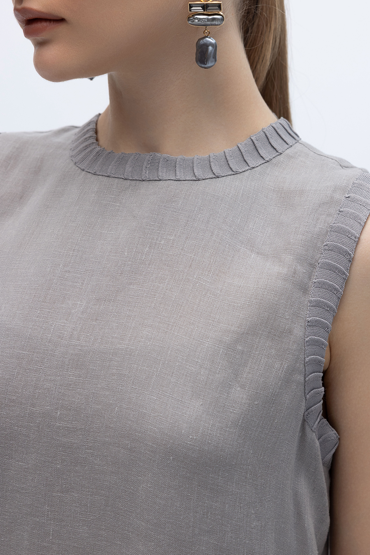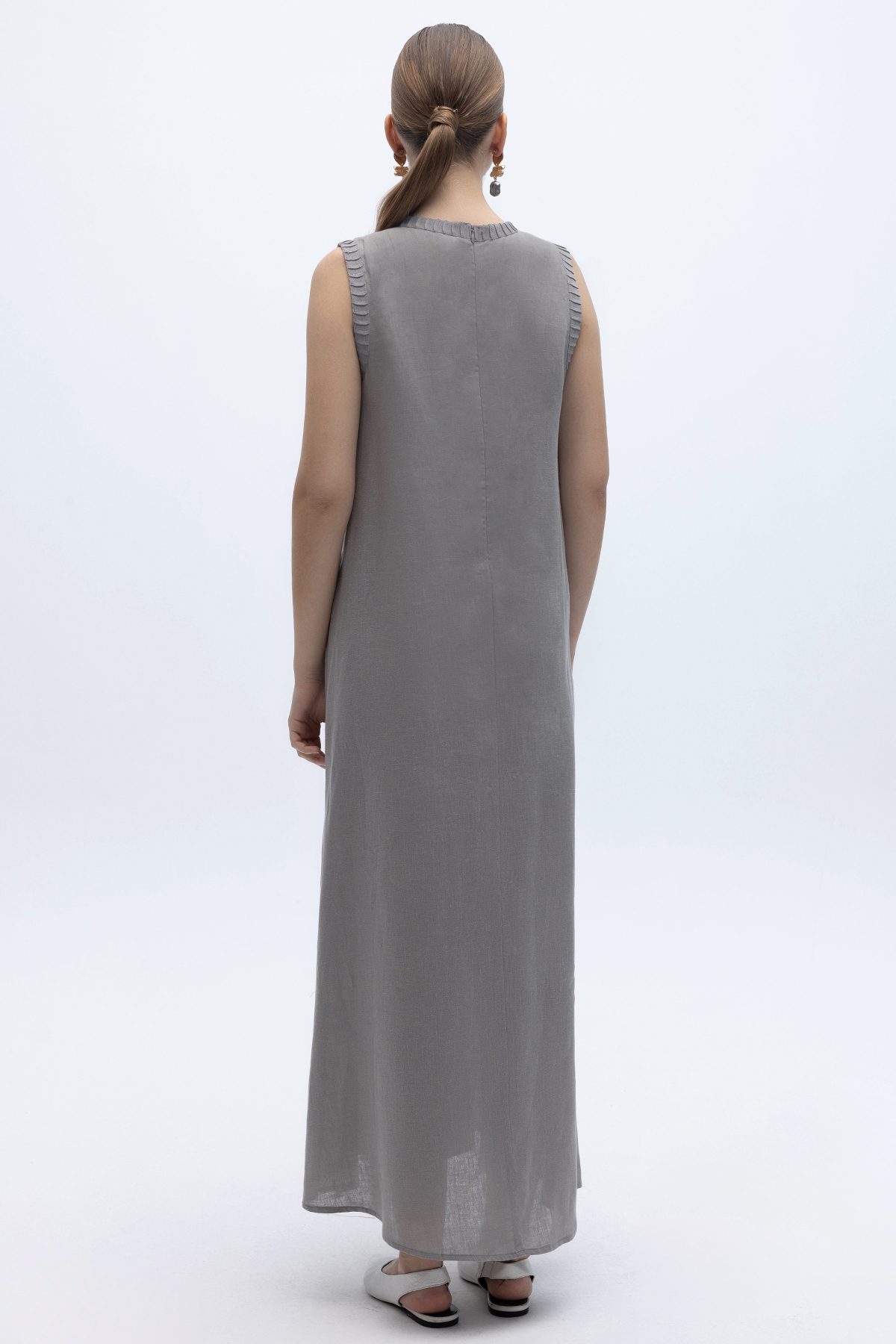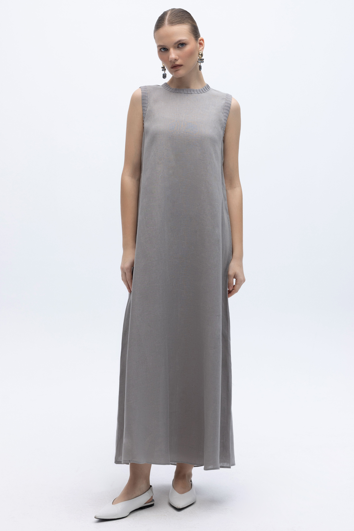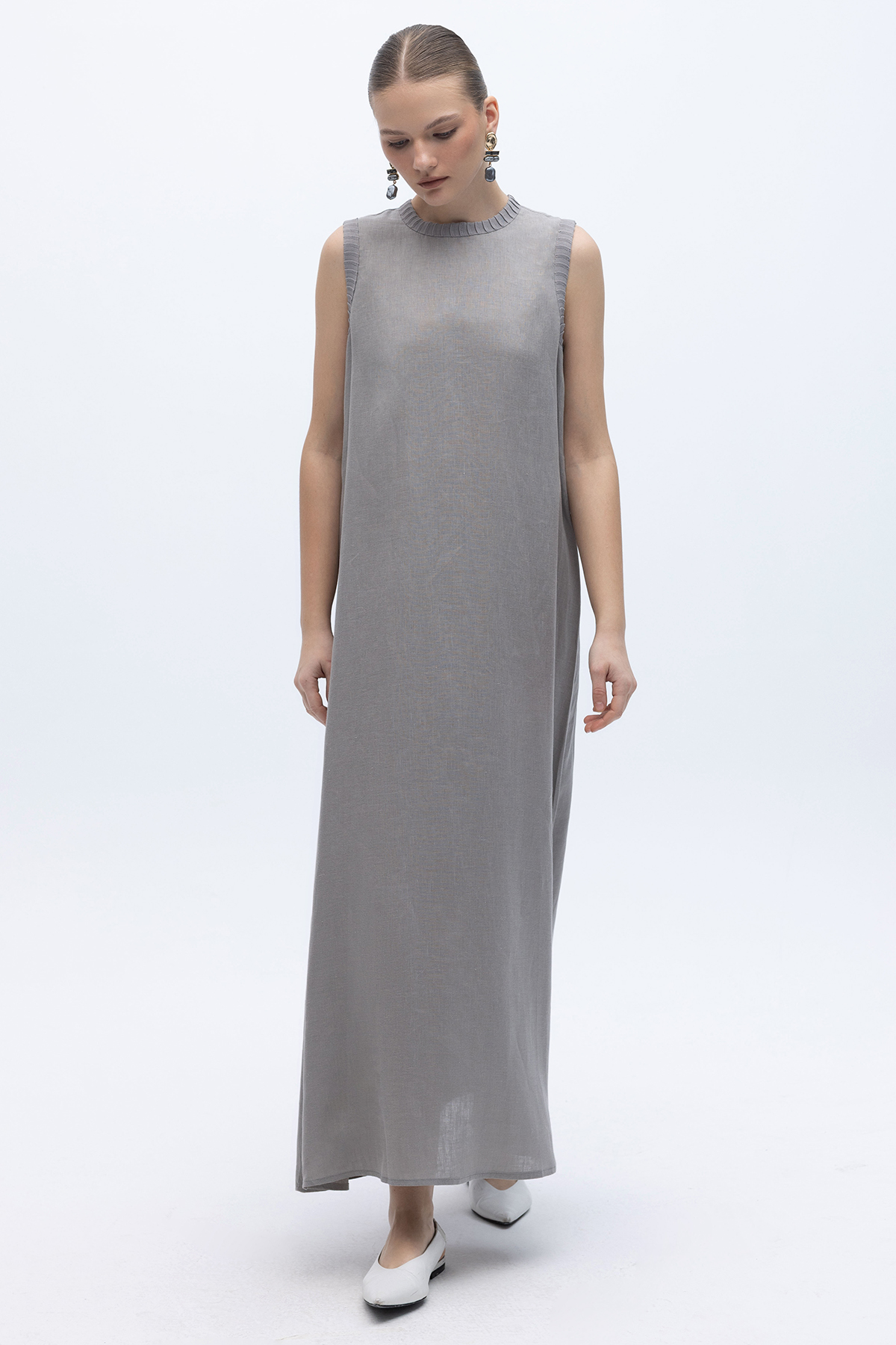 Triko Bantlı Kolsuz Keten Elbise Gri
