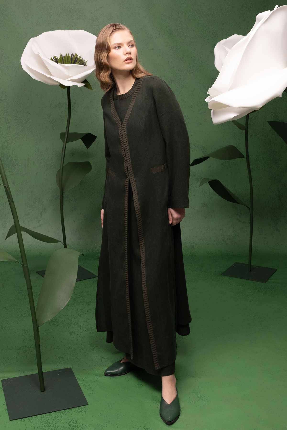 Kruvaze Kesim Keten Uzun Ceket Cherry