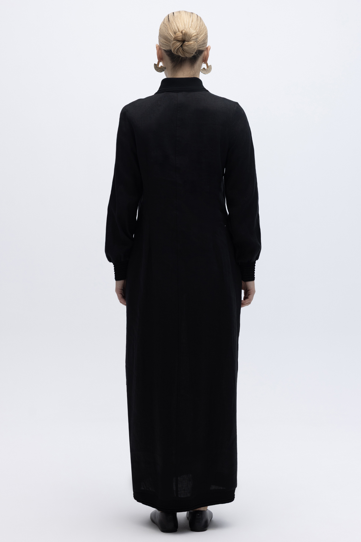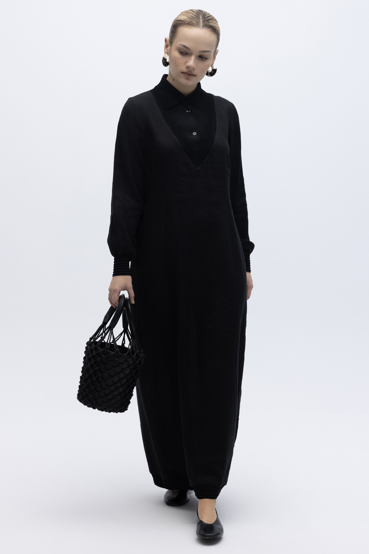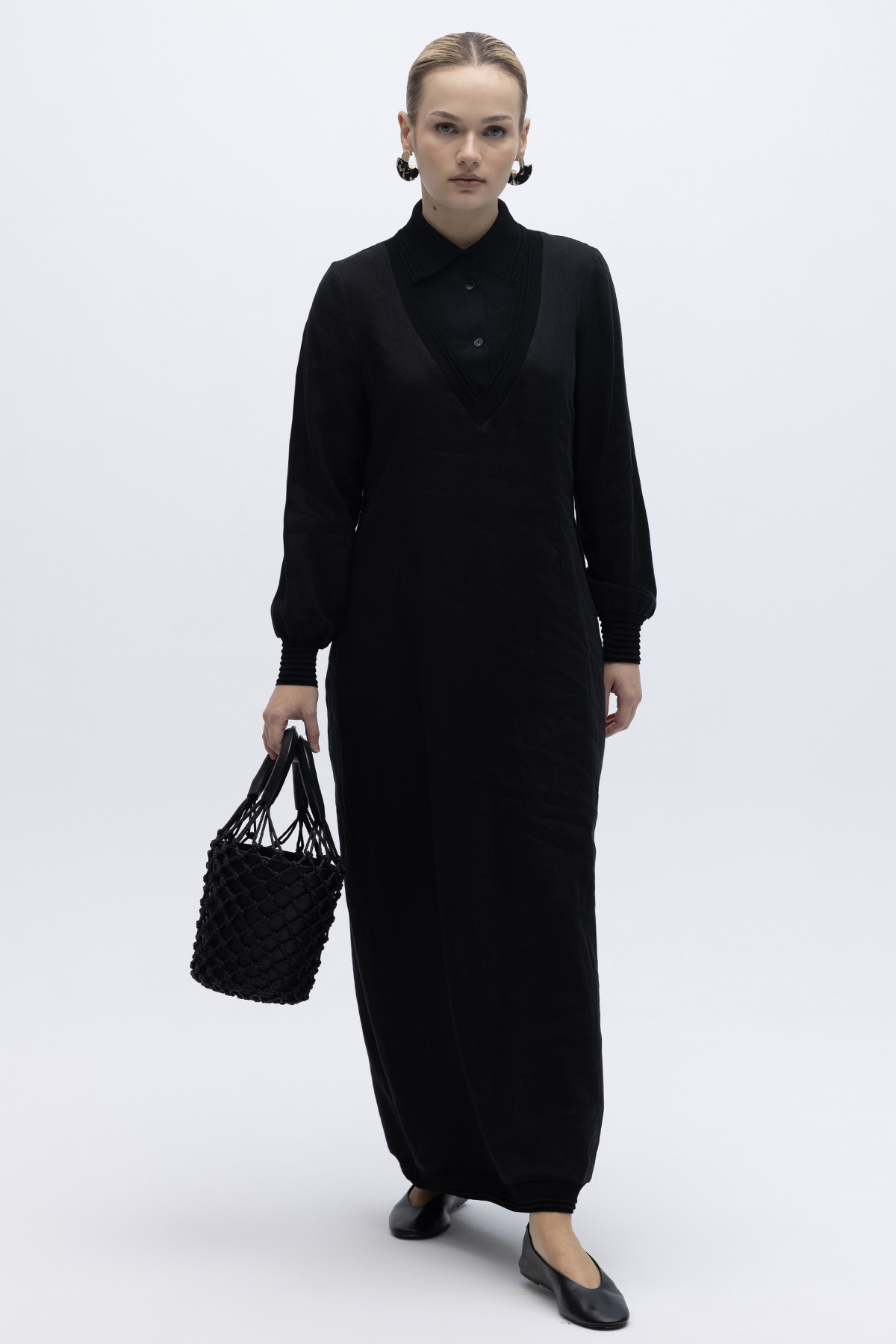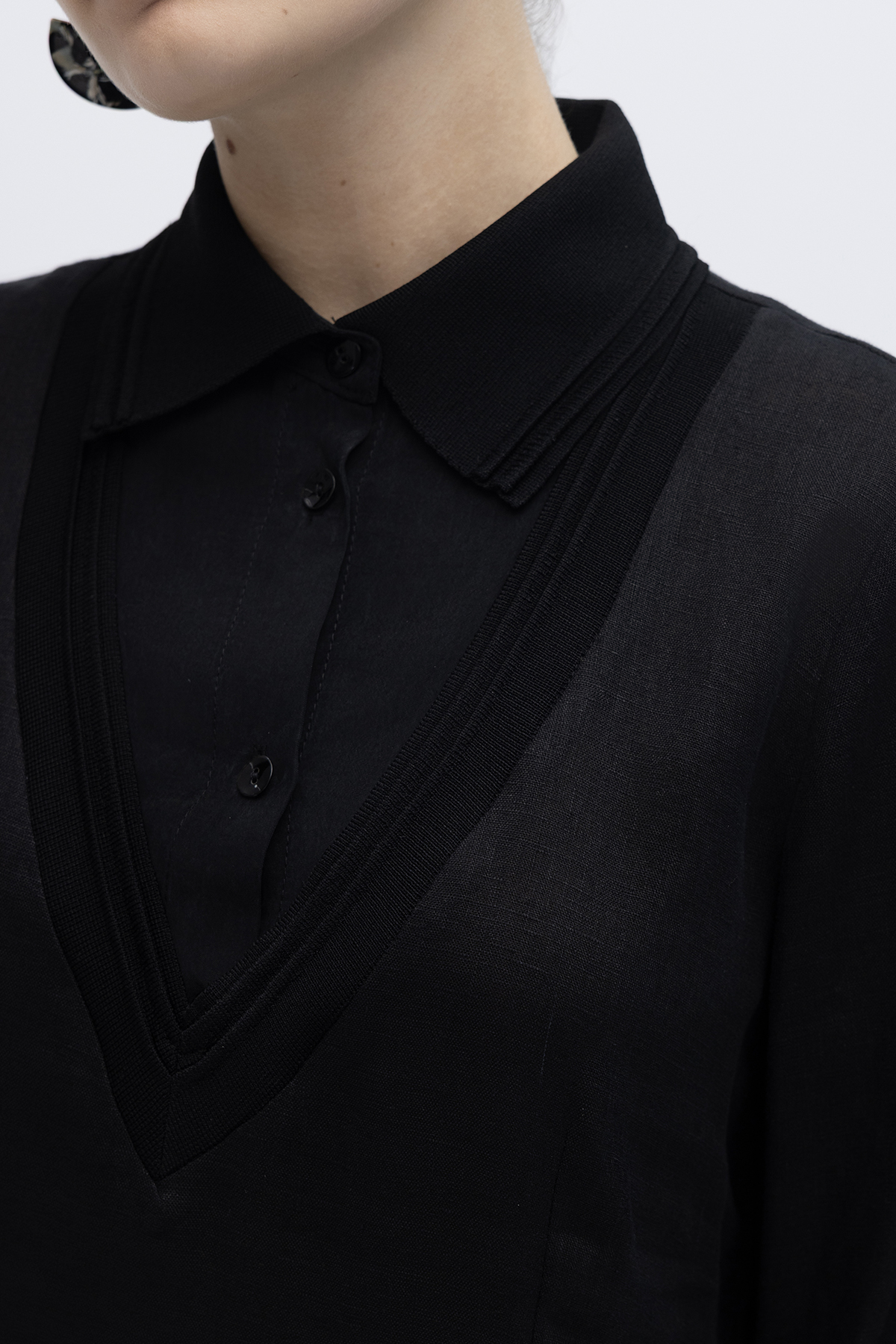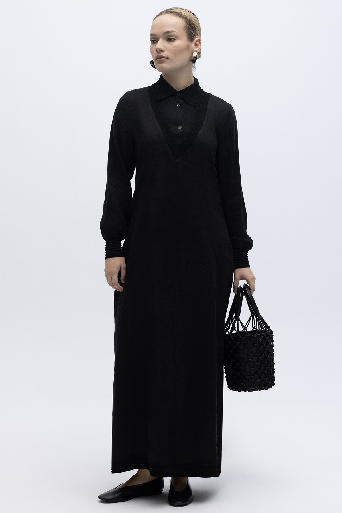 Triko Detaylı V Yaka Keten Elbise Siyah