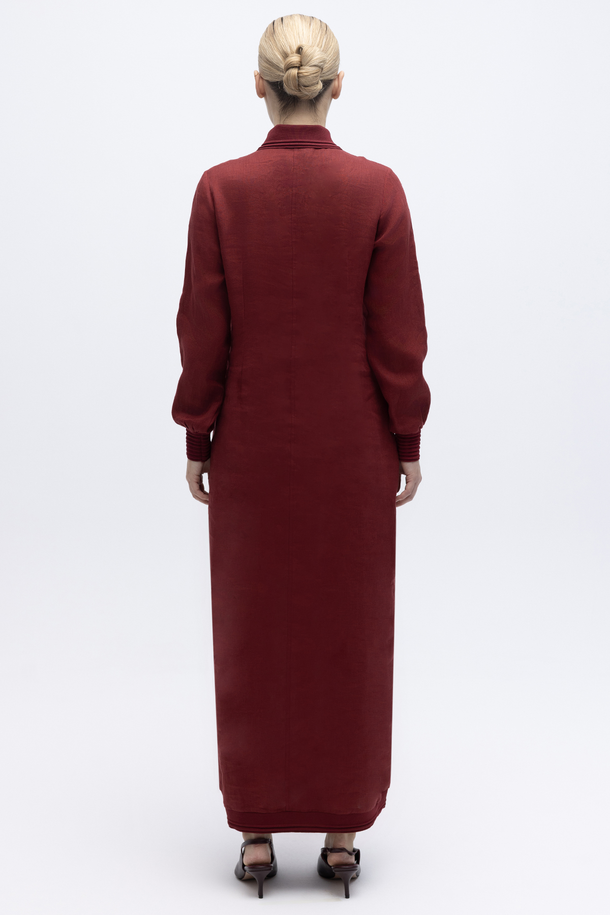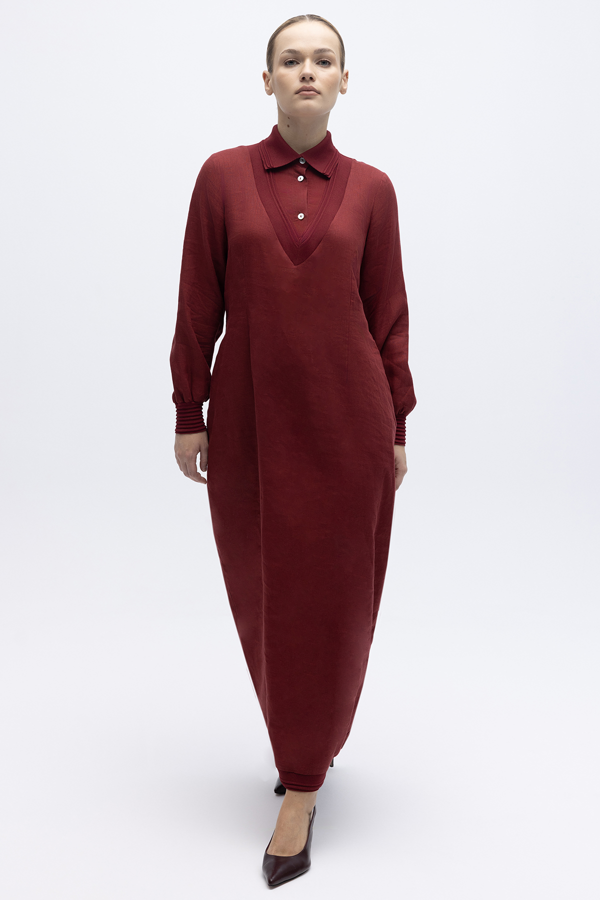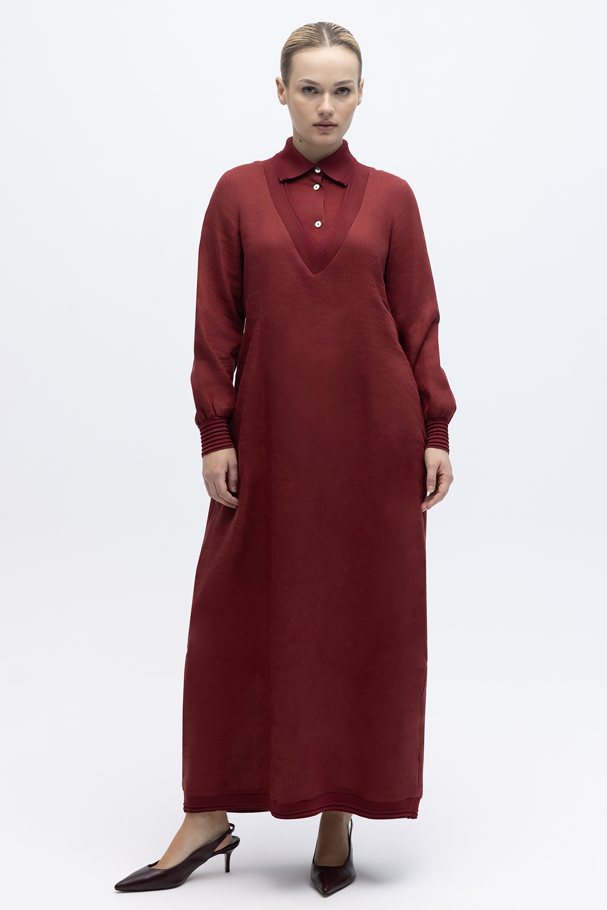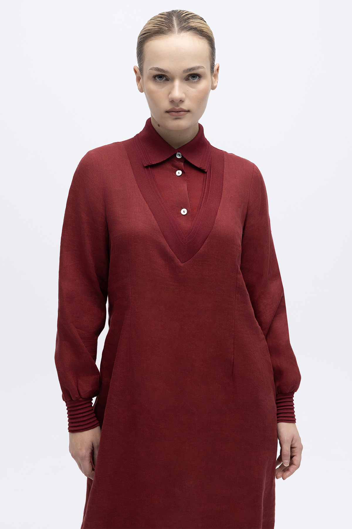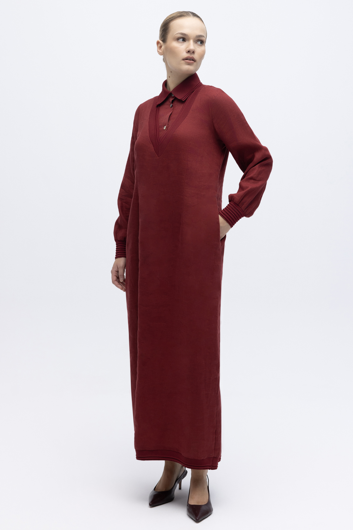 Triko Detaylı V Yaka Keten Elbise Cherry