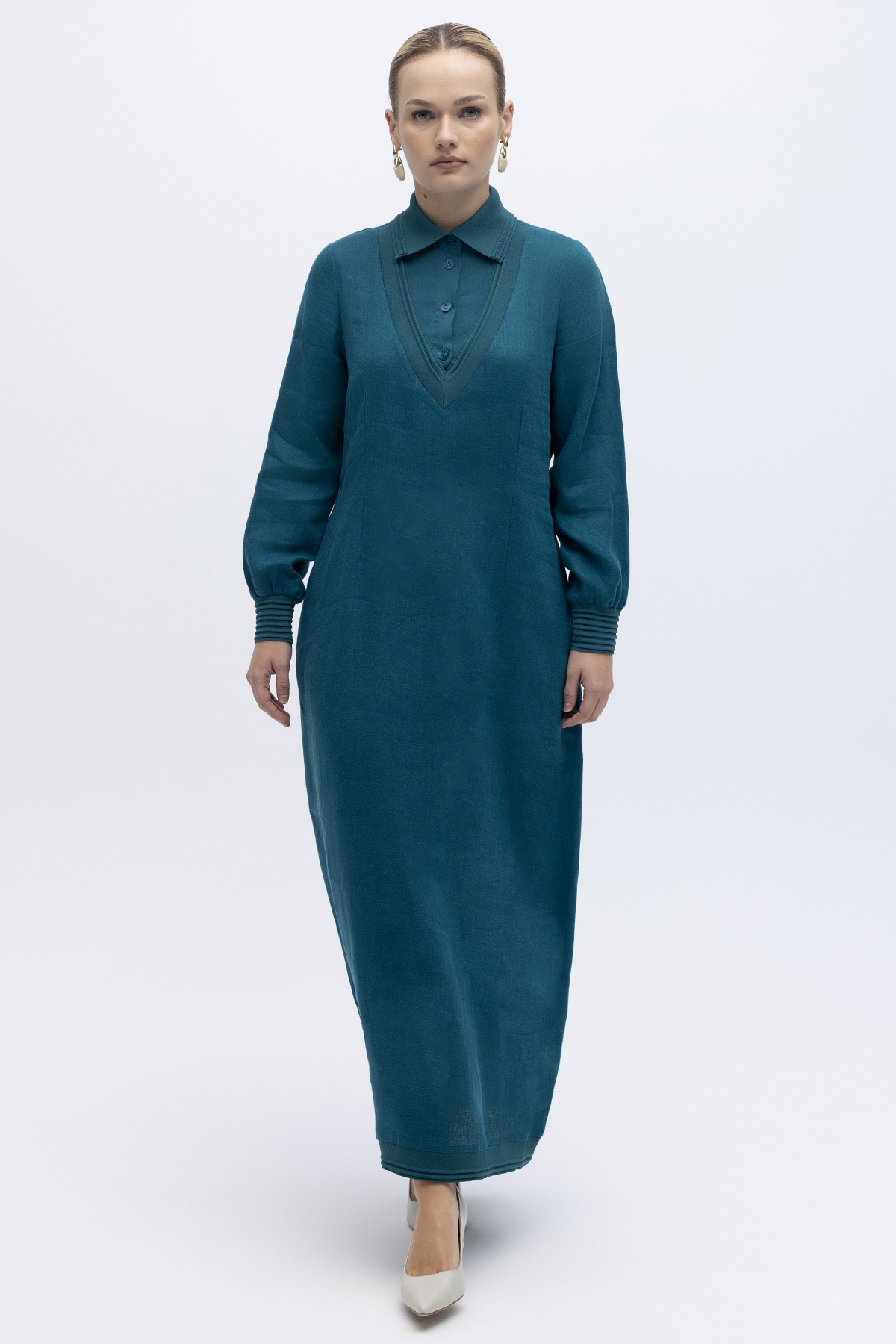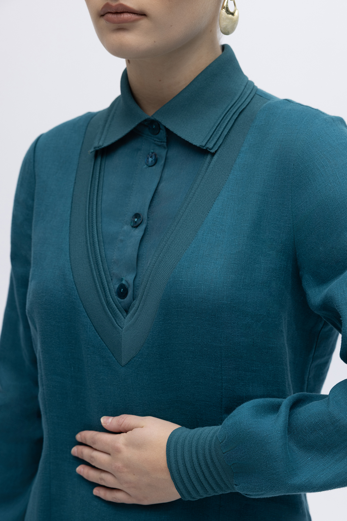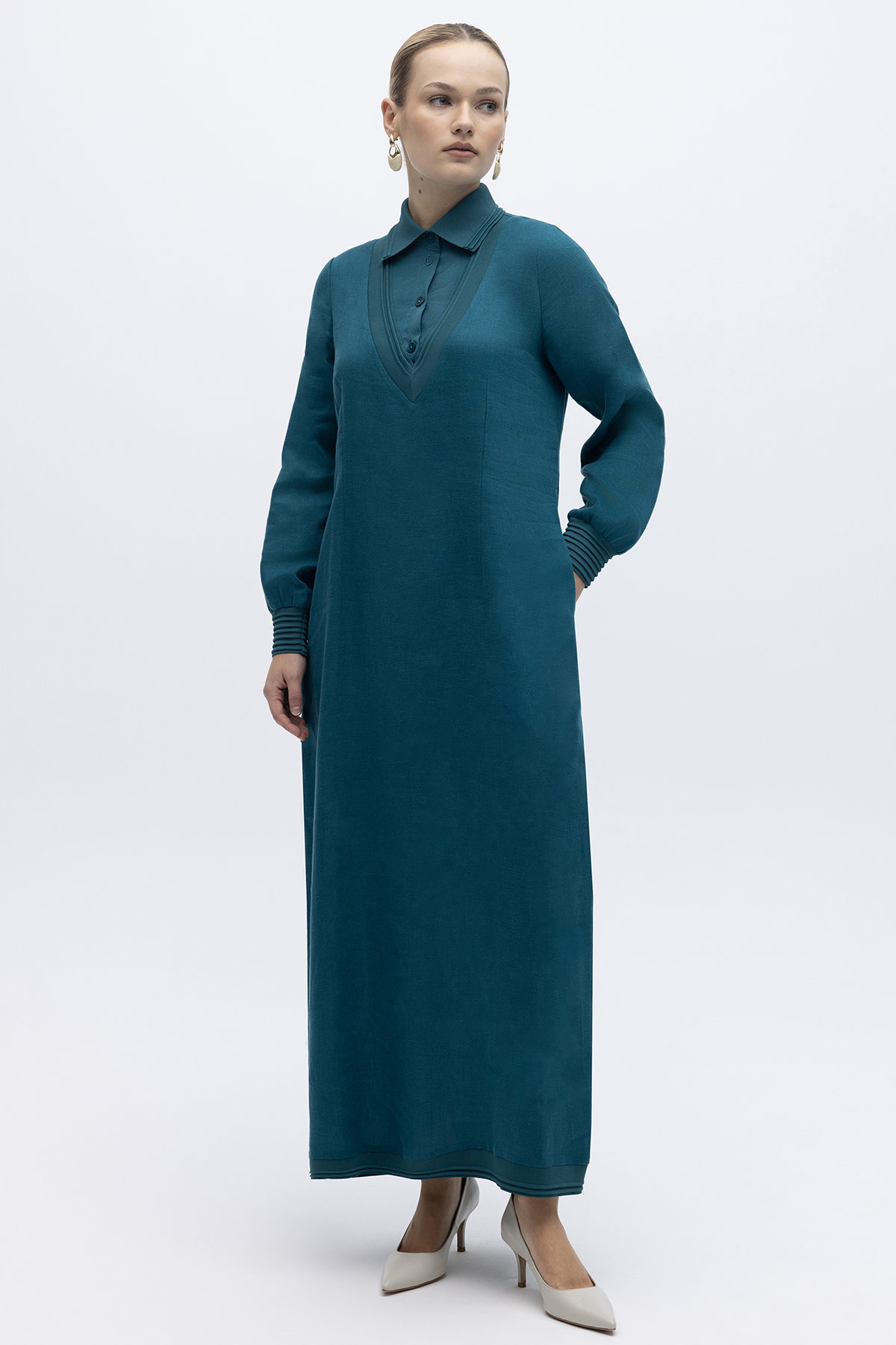 Triko Detaylı V Yaka Keten Elbise North Sea