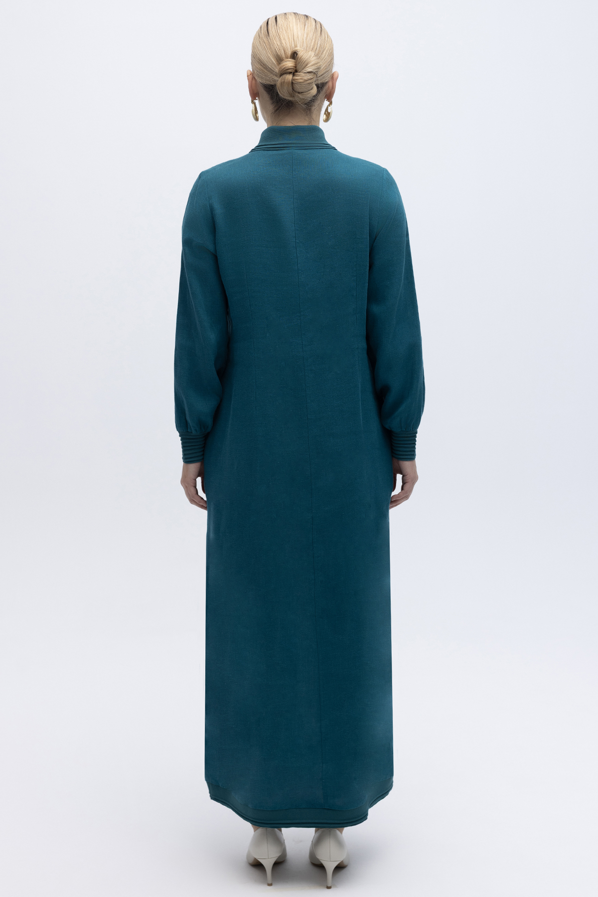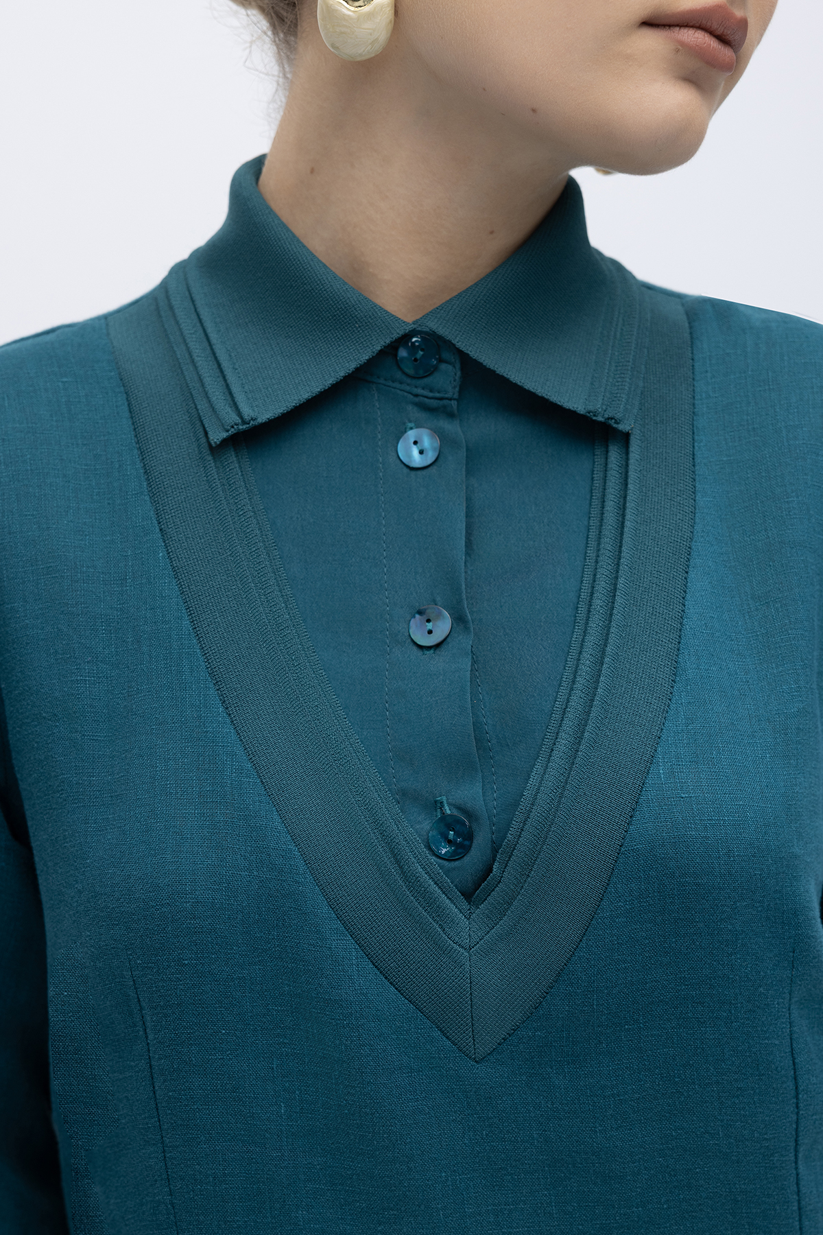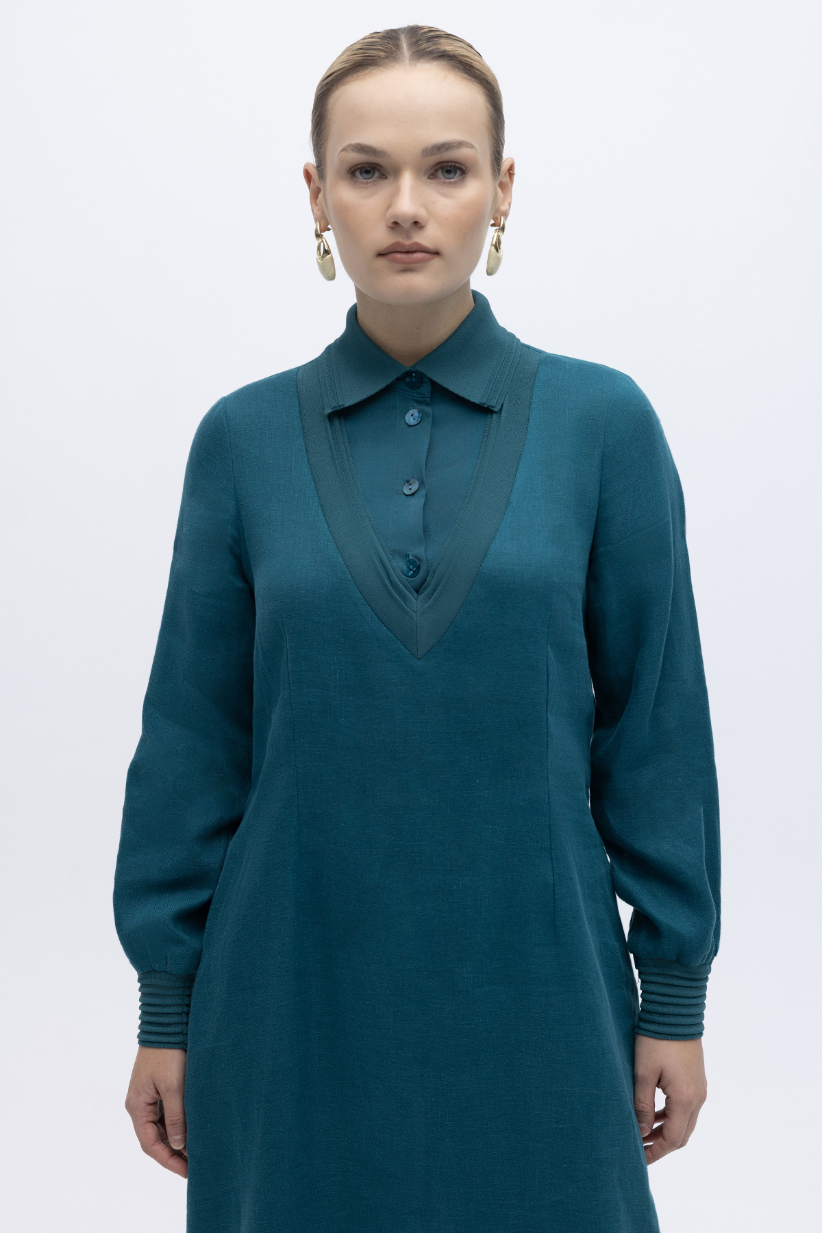 Triko Detaylı V Yaka Keten Elbise North Sea
