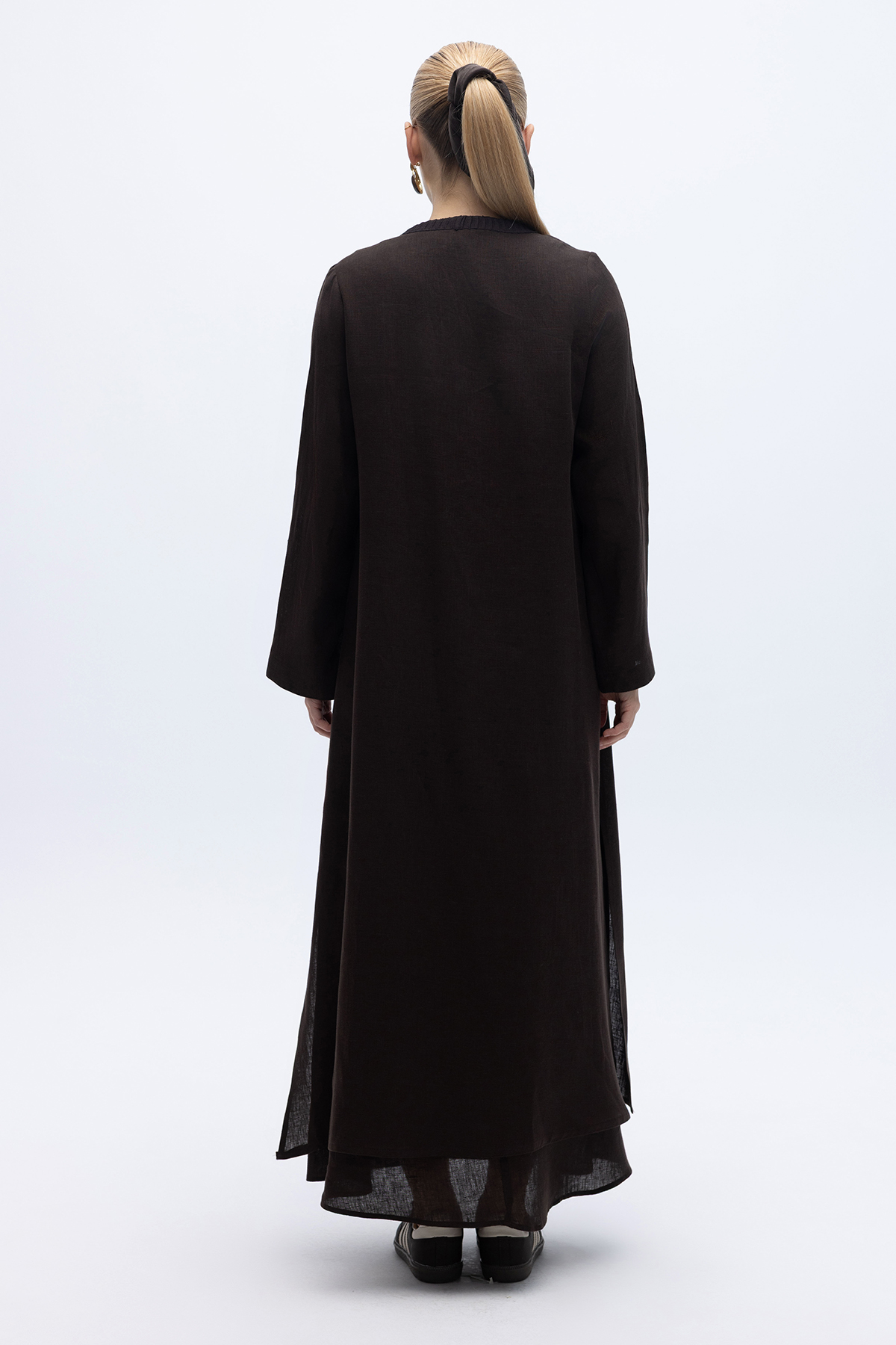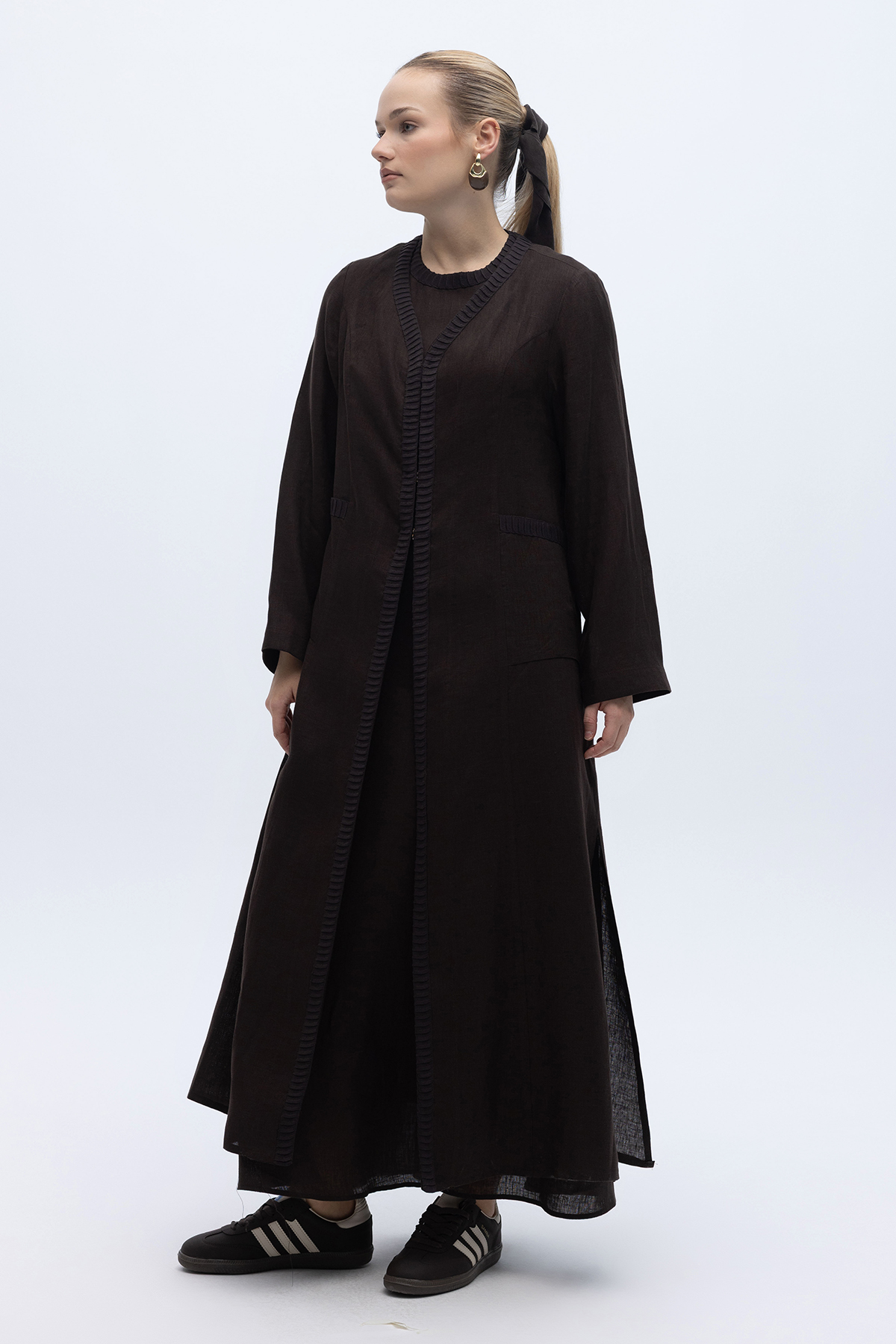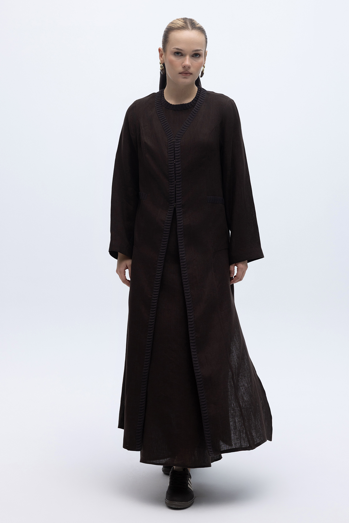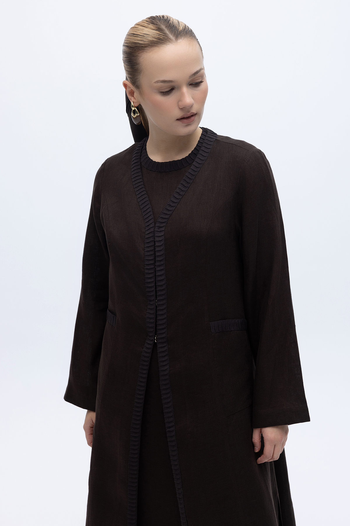 Triko Detaylı V Yaka Keten Kap Kahverengi
