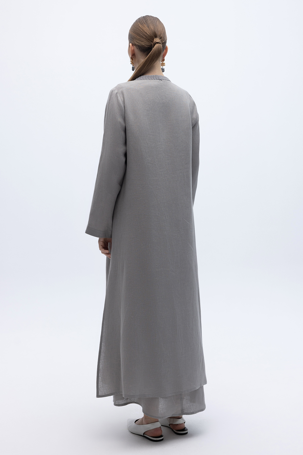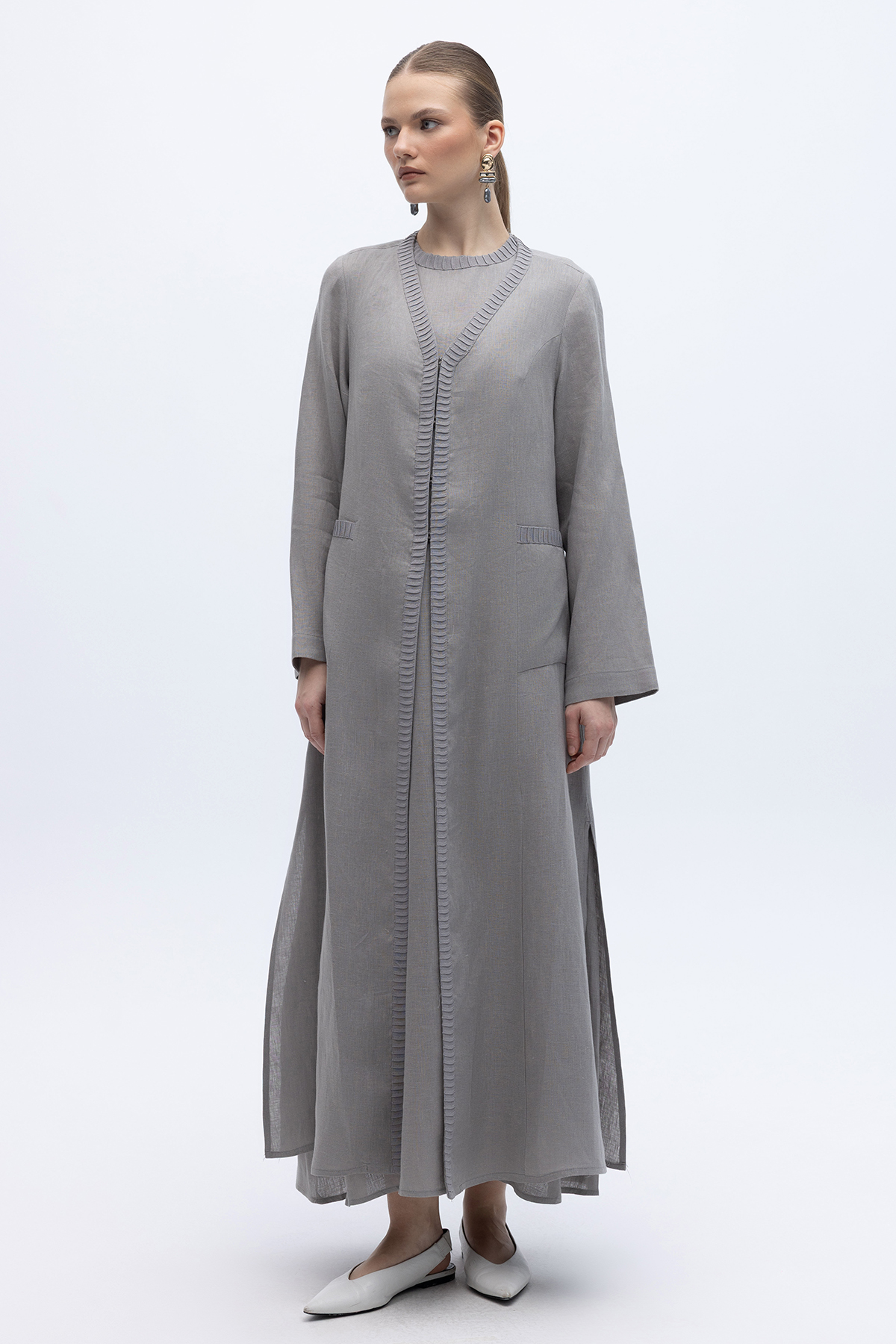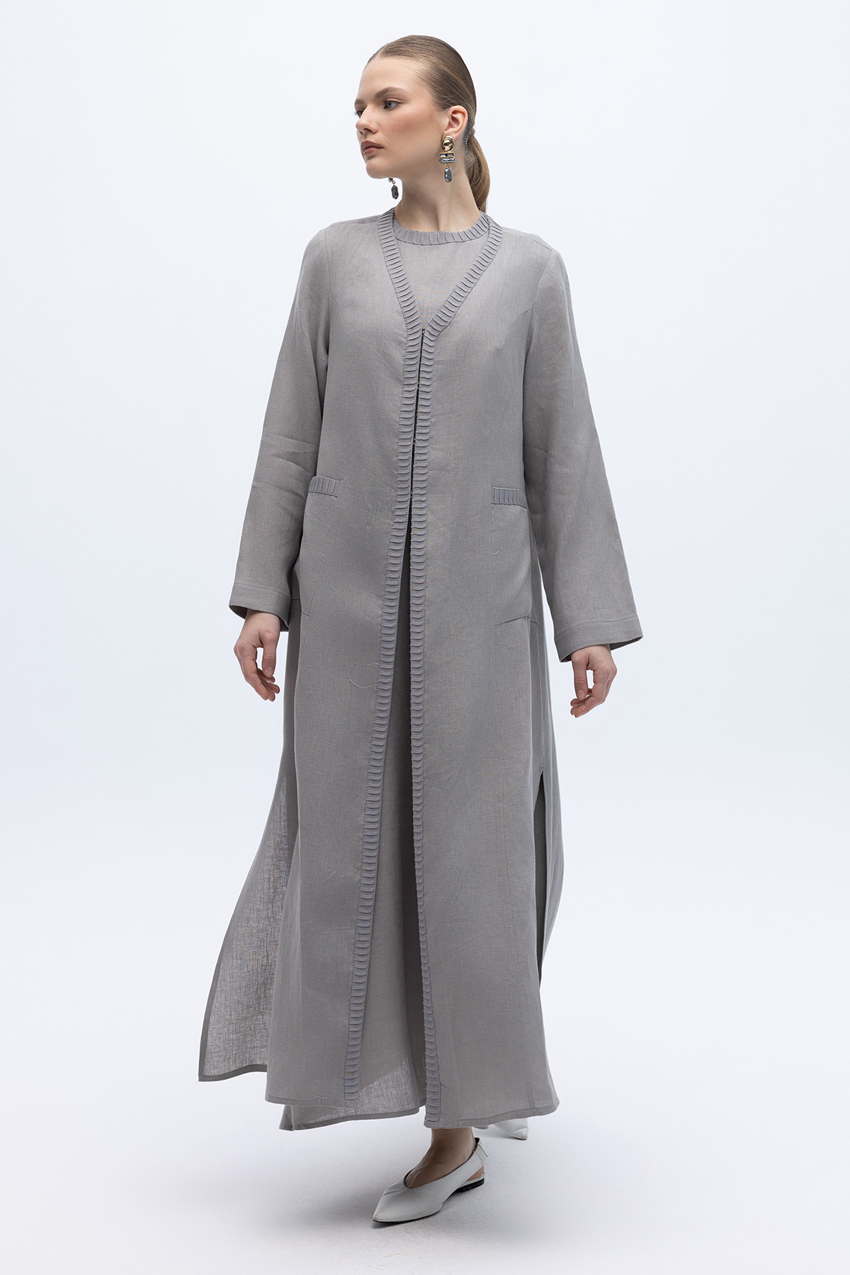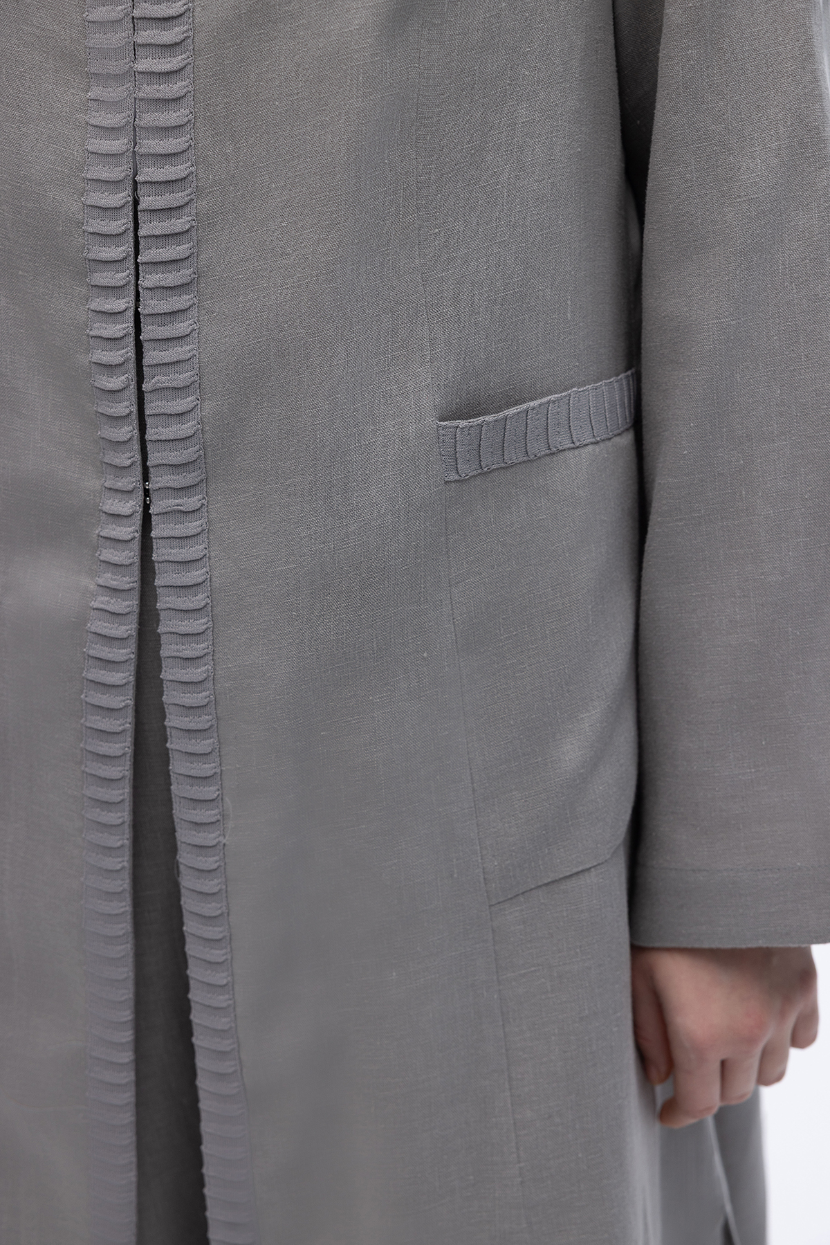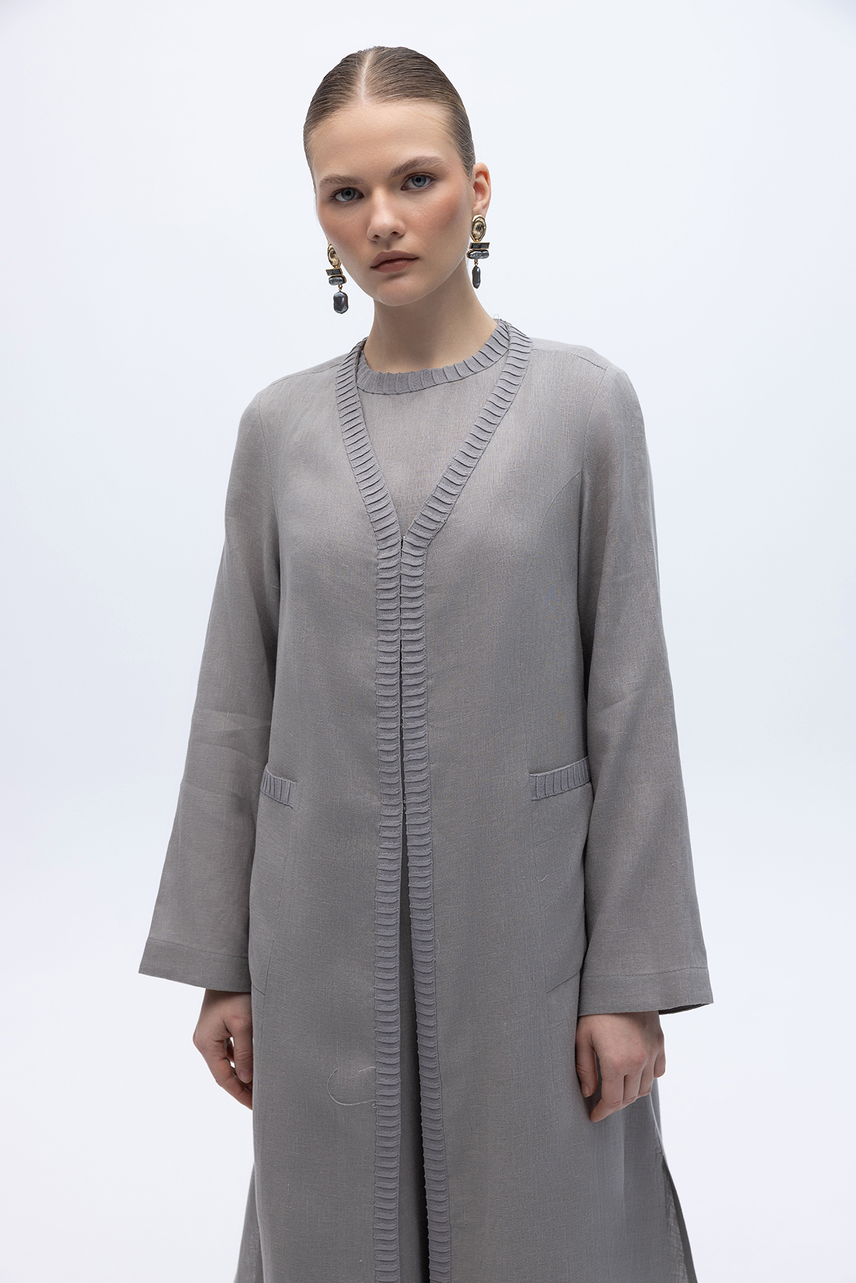 Önü Nervürlü Uzun Keten Kap Kahverengi