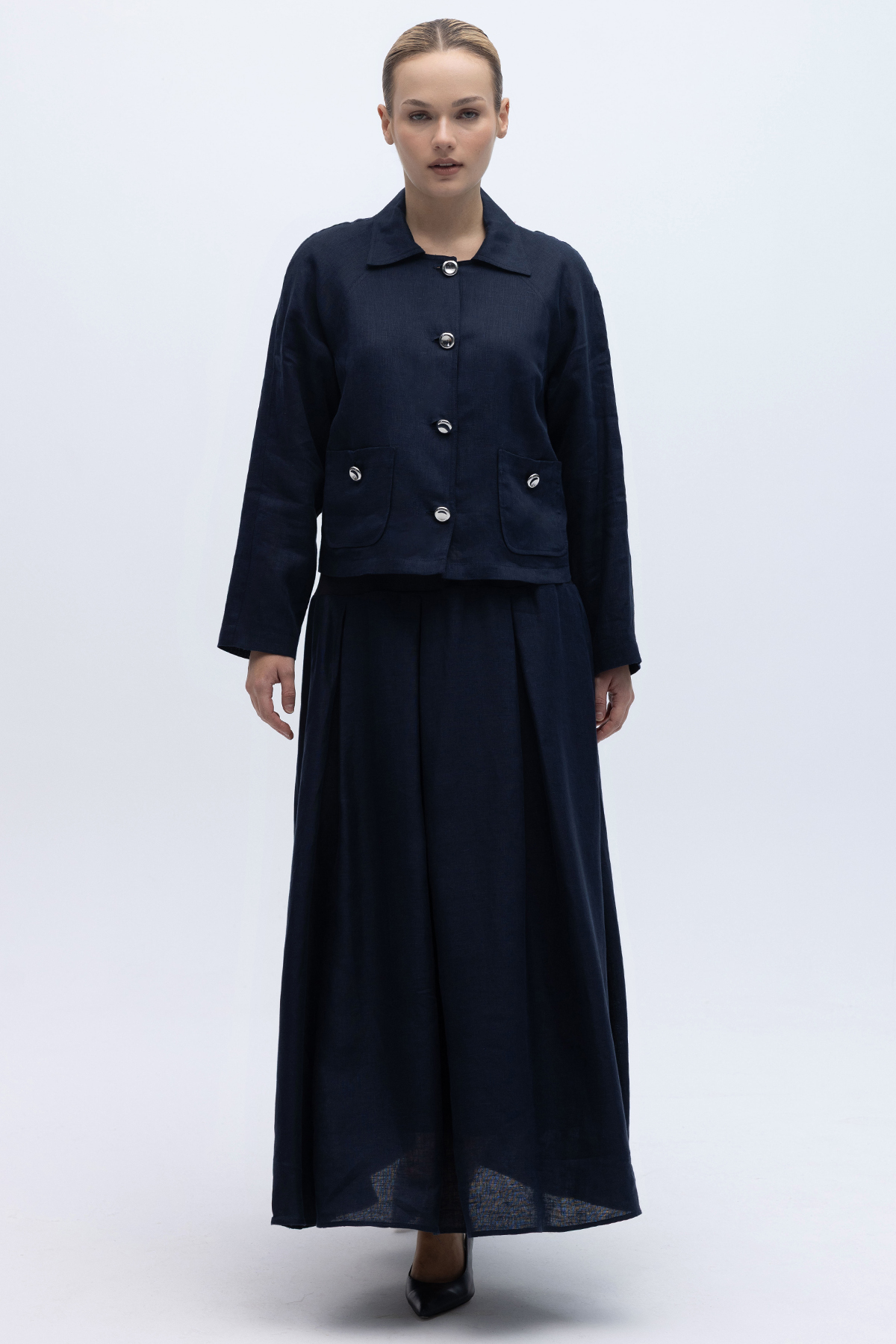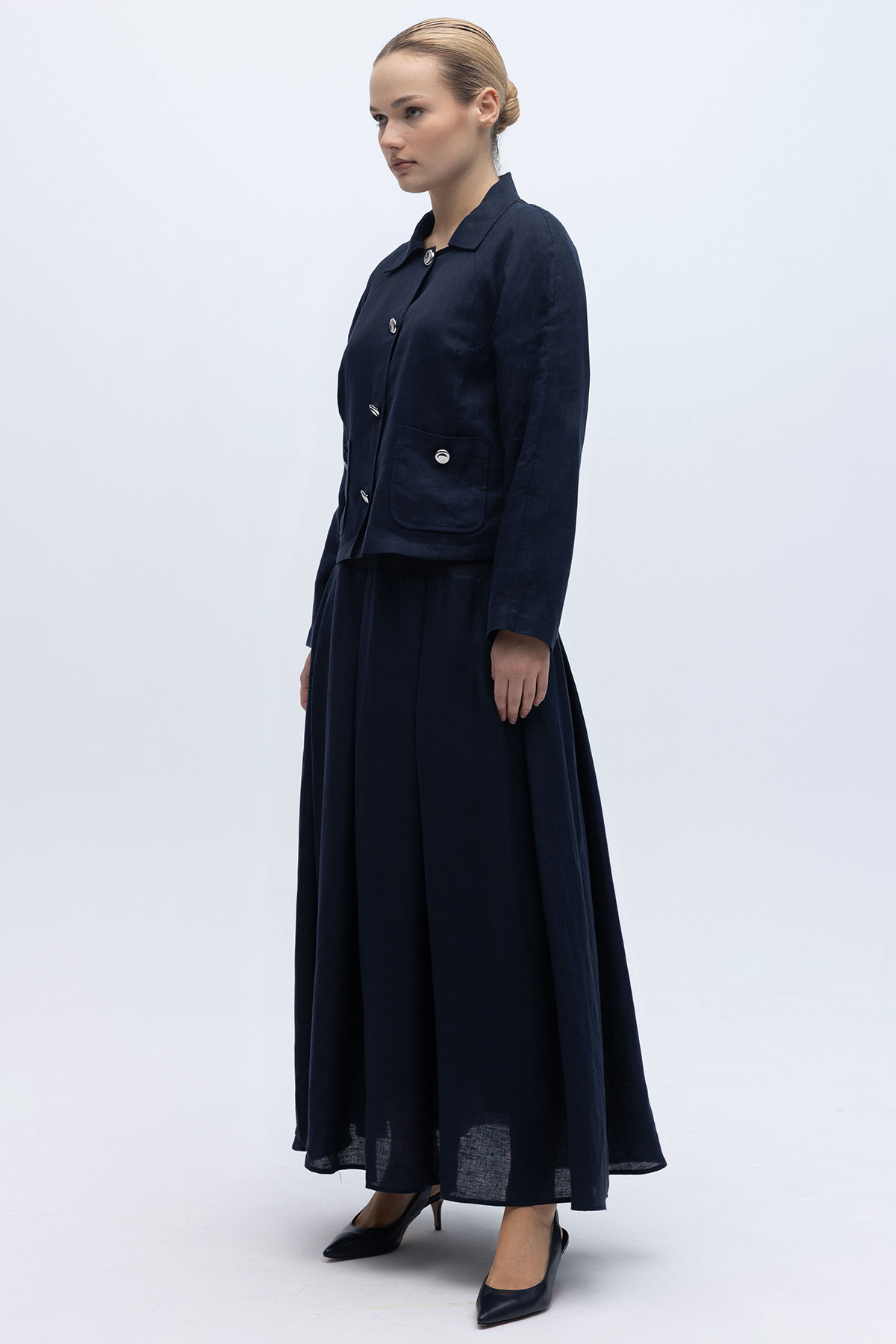 Triko Korsajlı Rahat Kesim Keten Etek Lacivert