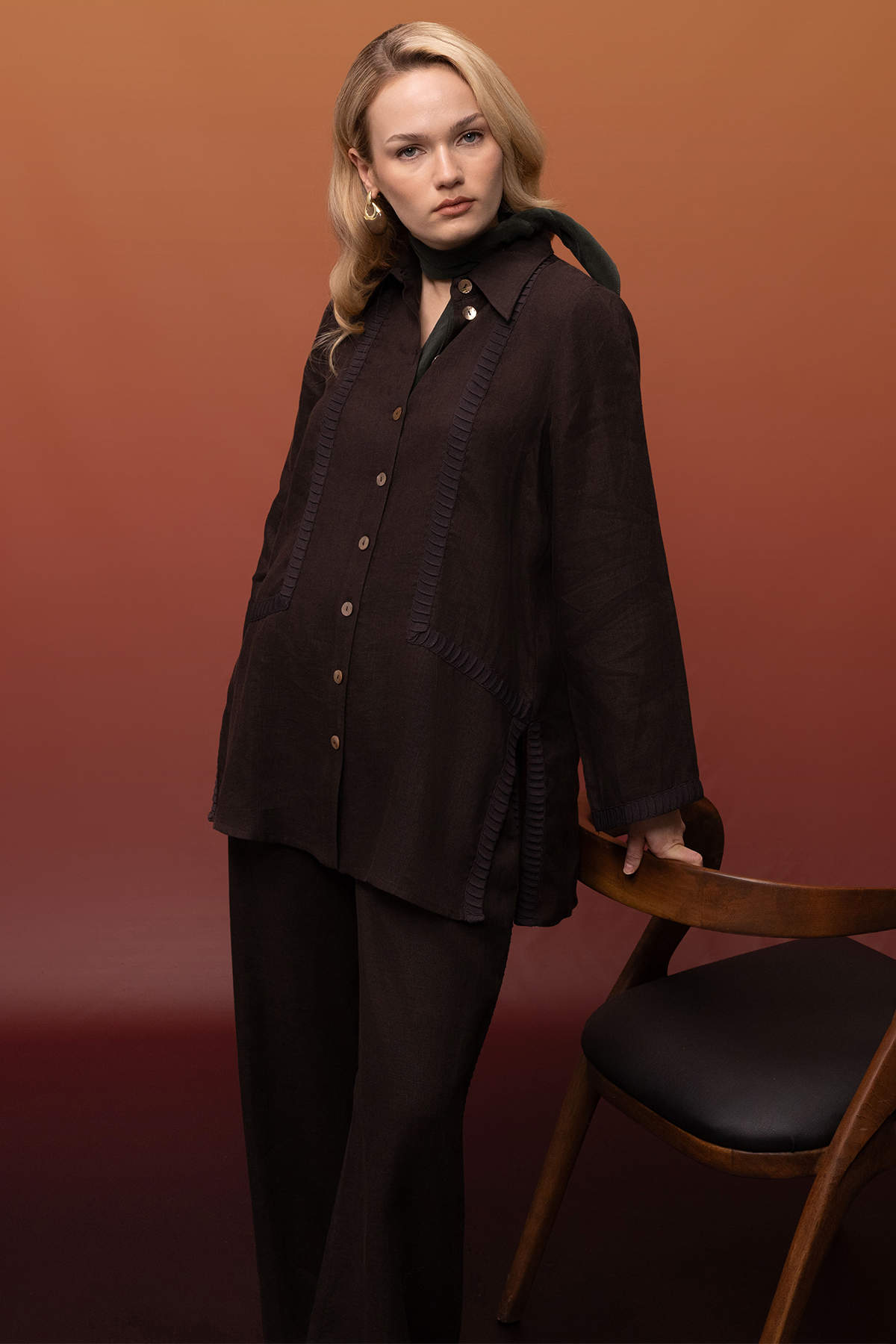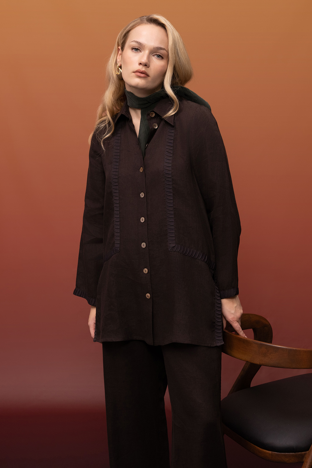 Triko Tiktaklı Keten Gömlek Kahverengi