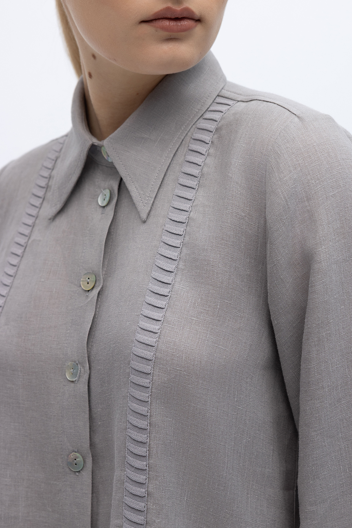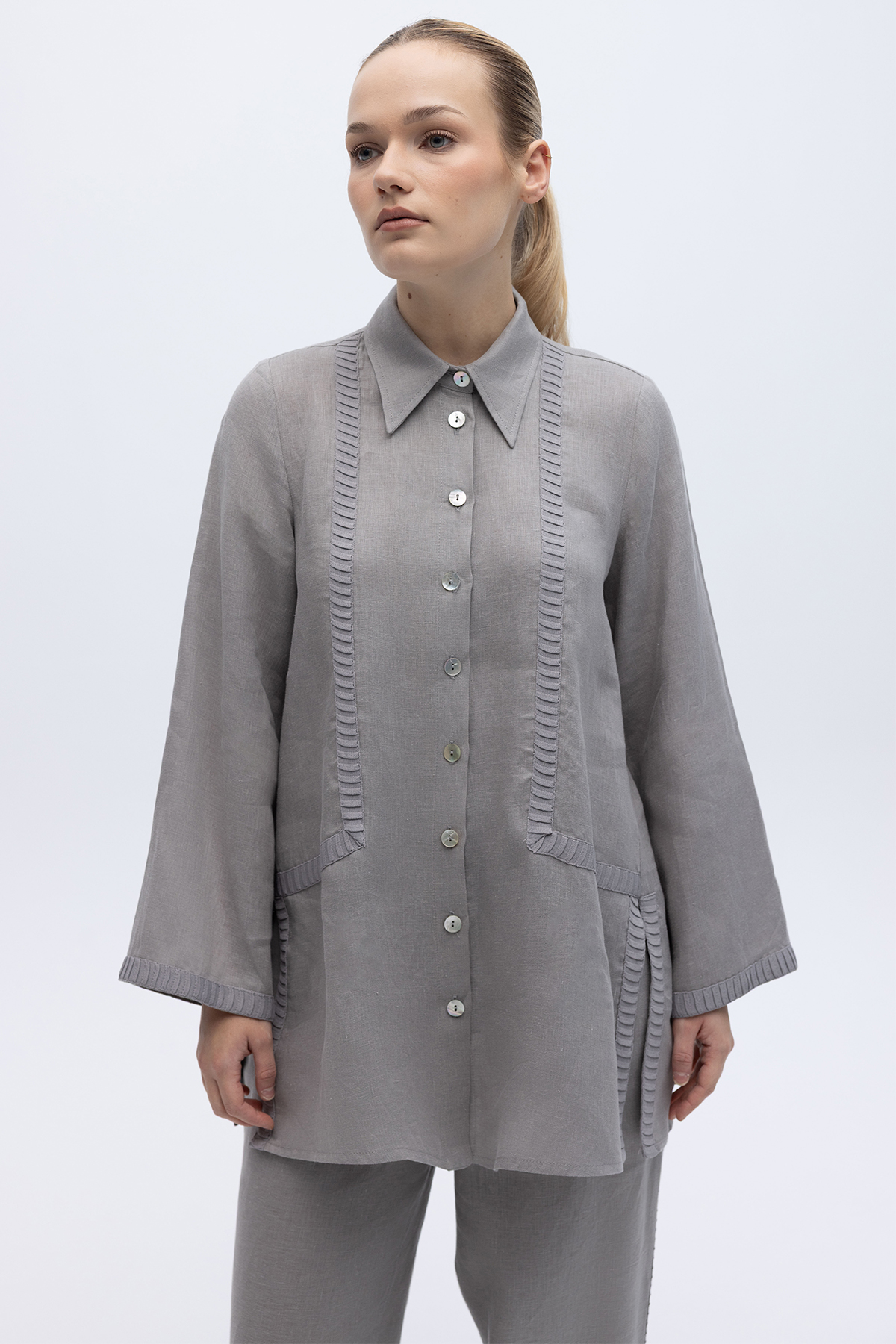 Triko Tiktaklı Keten Gömlek Gri