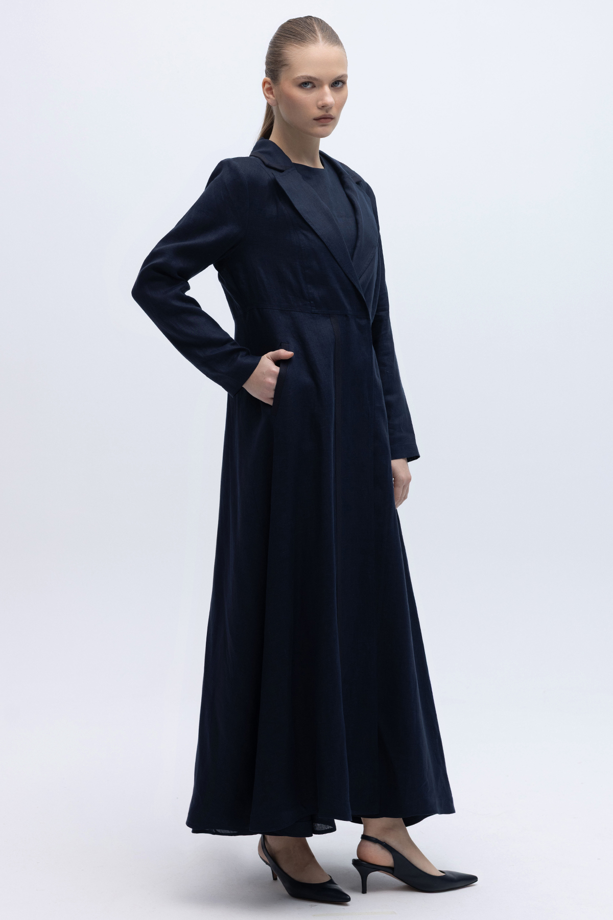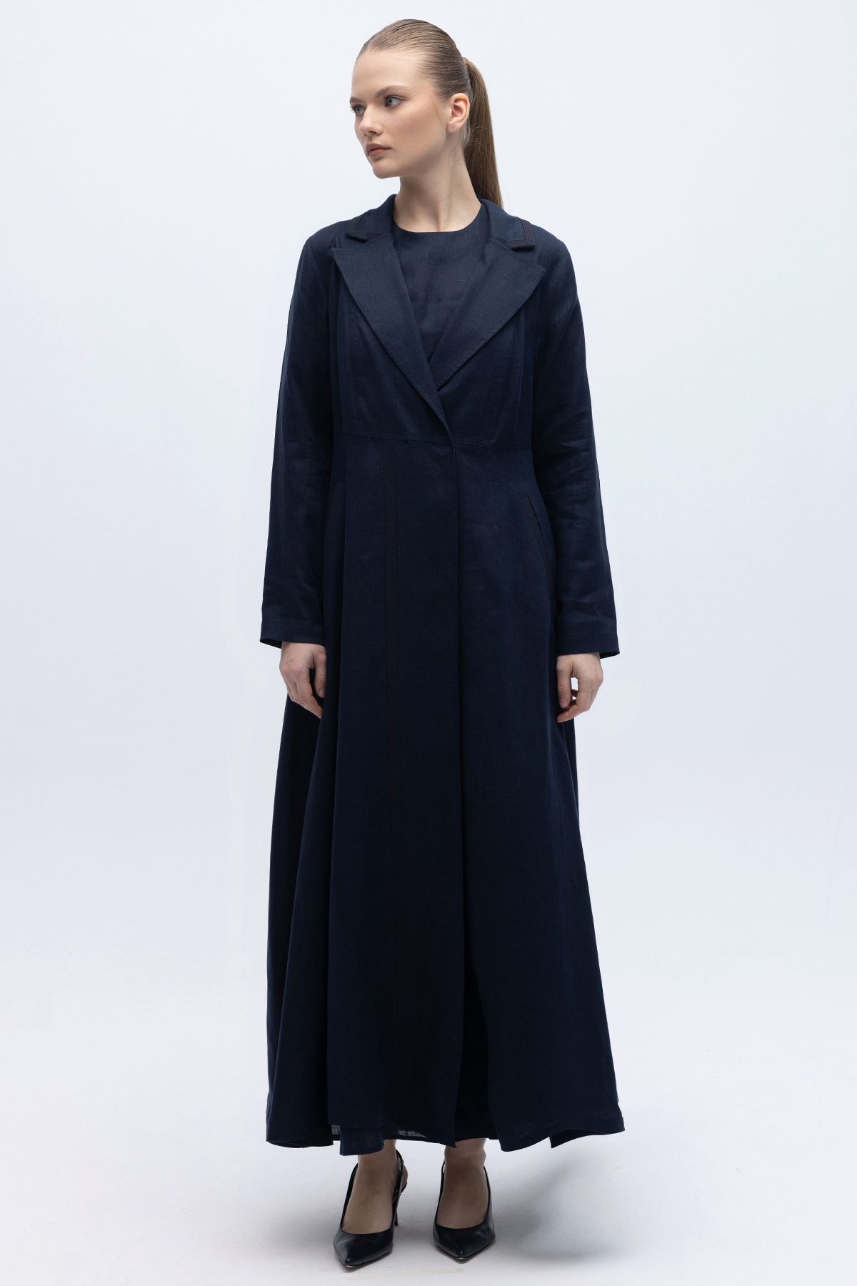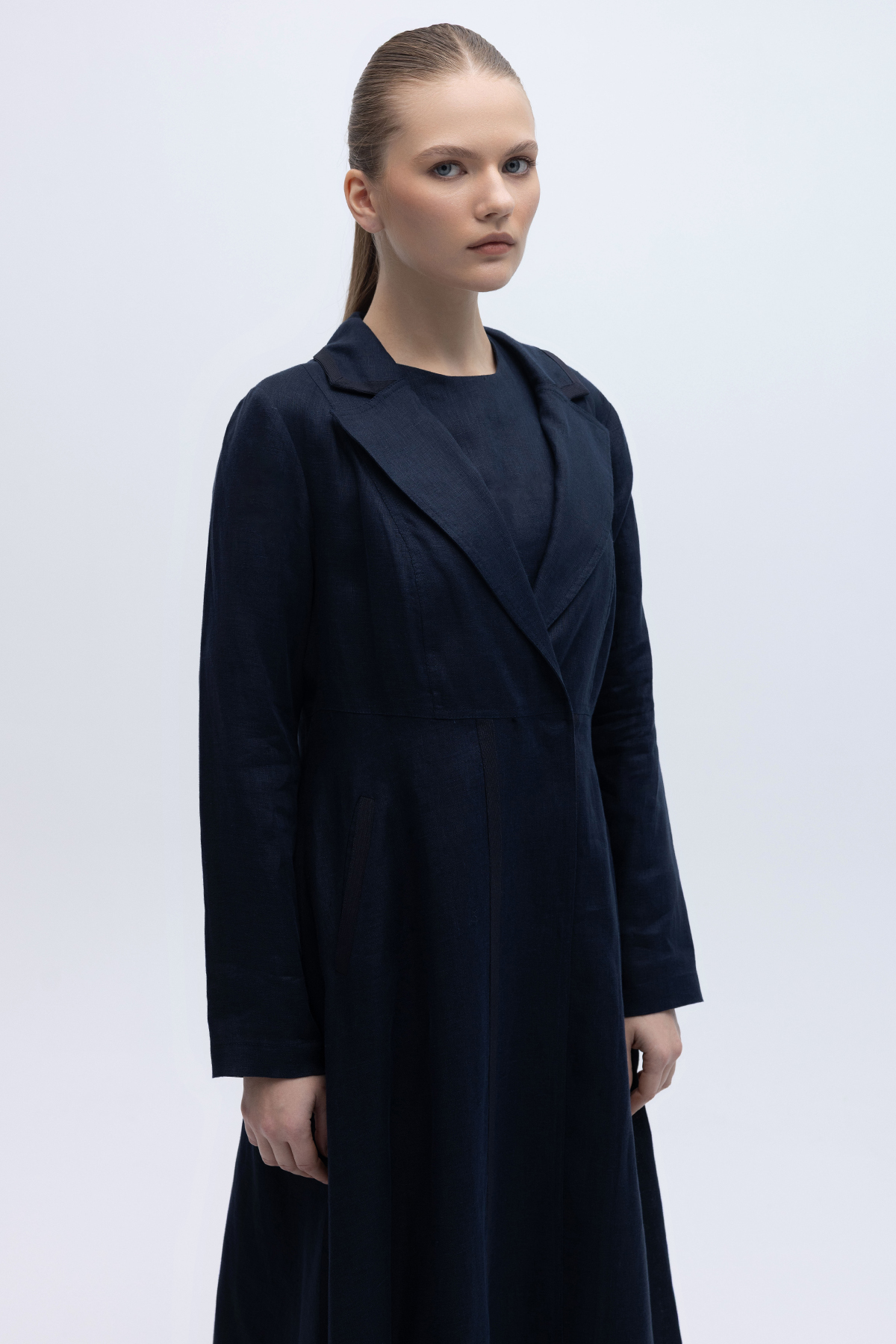 Triko Tiktaklı Uzun Keten Ceket Siyah