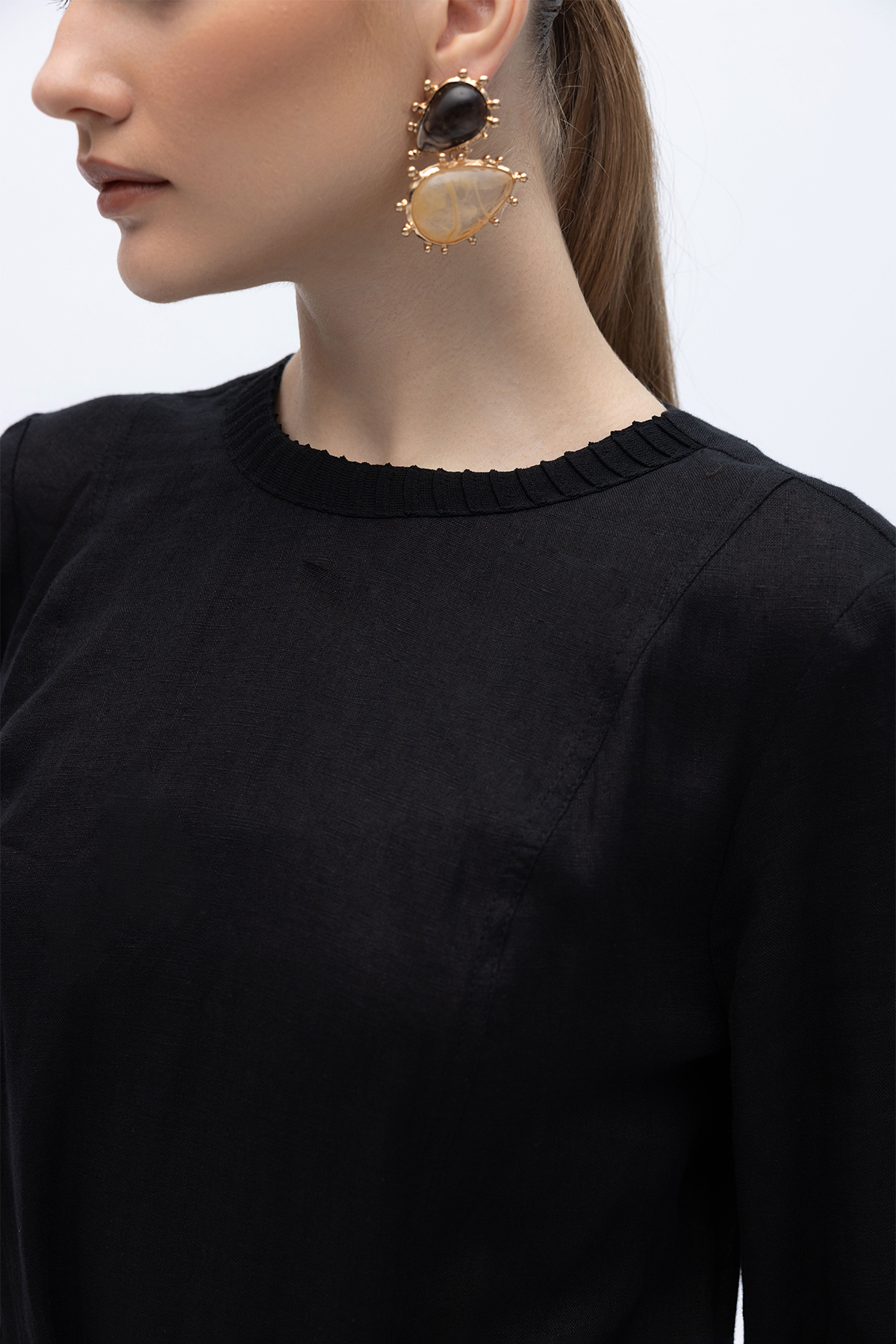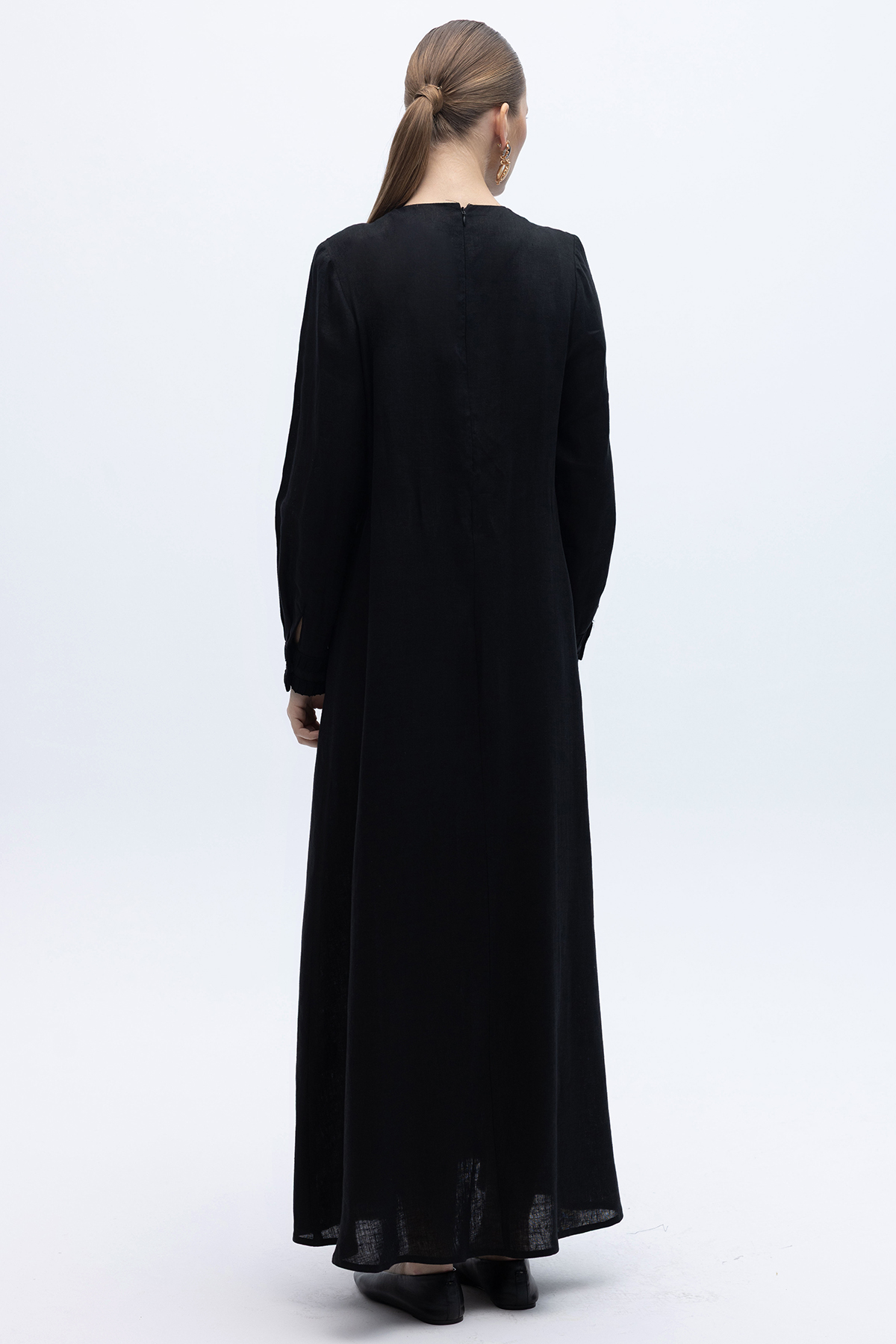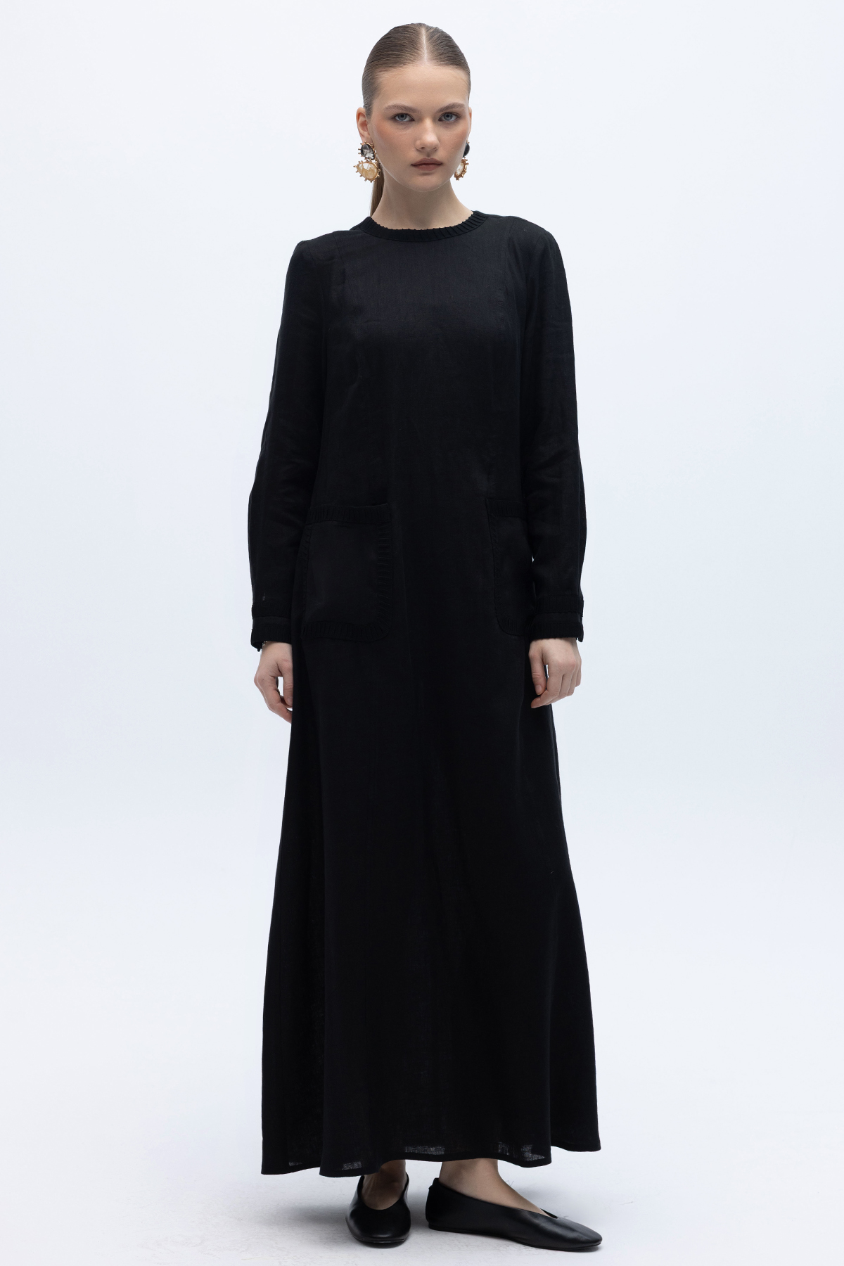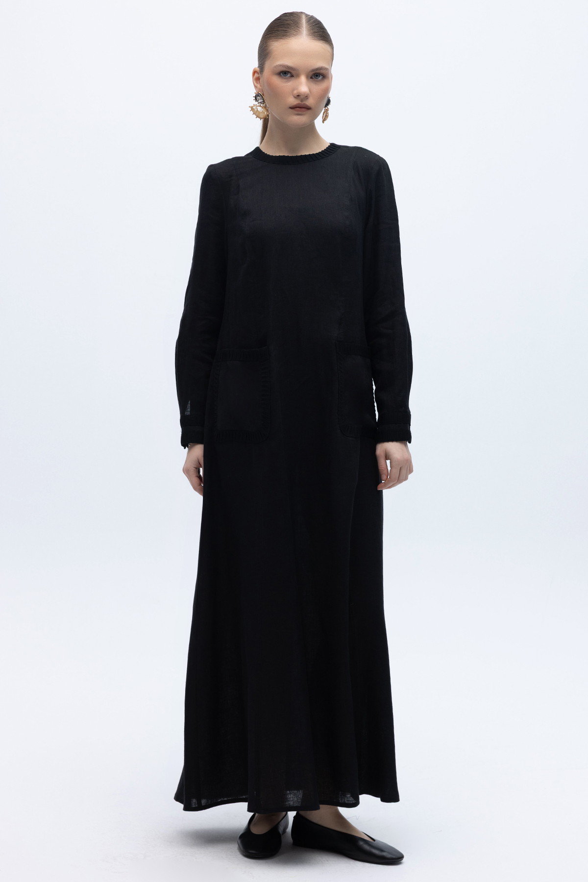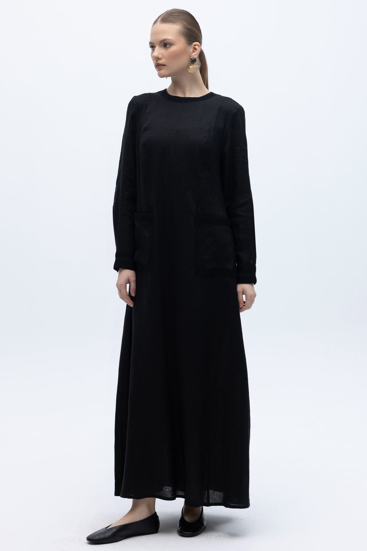 Uzun Kollu Cepli Keten Elbise Siyah