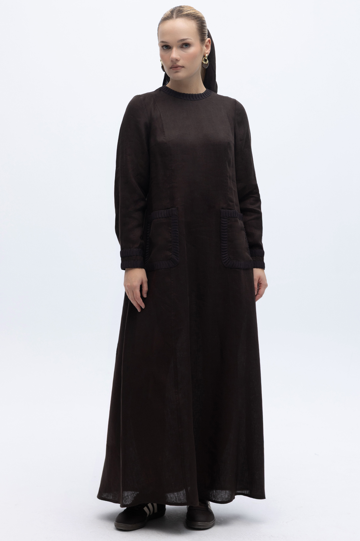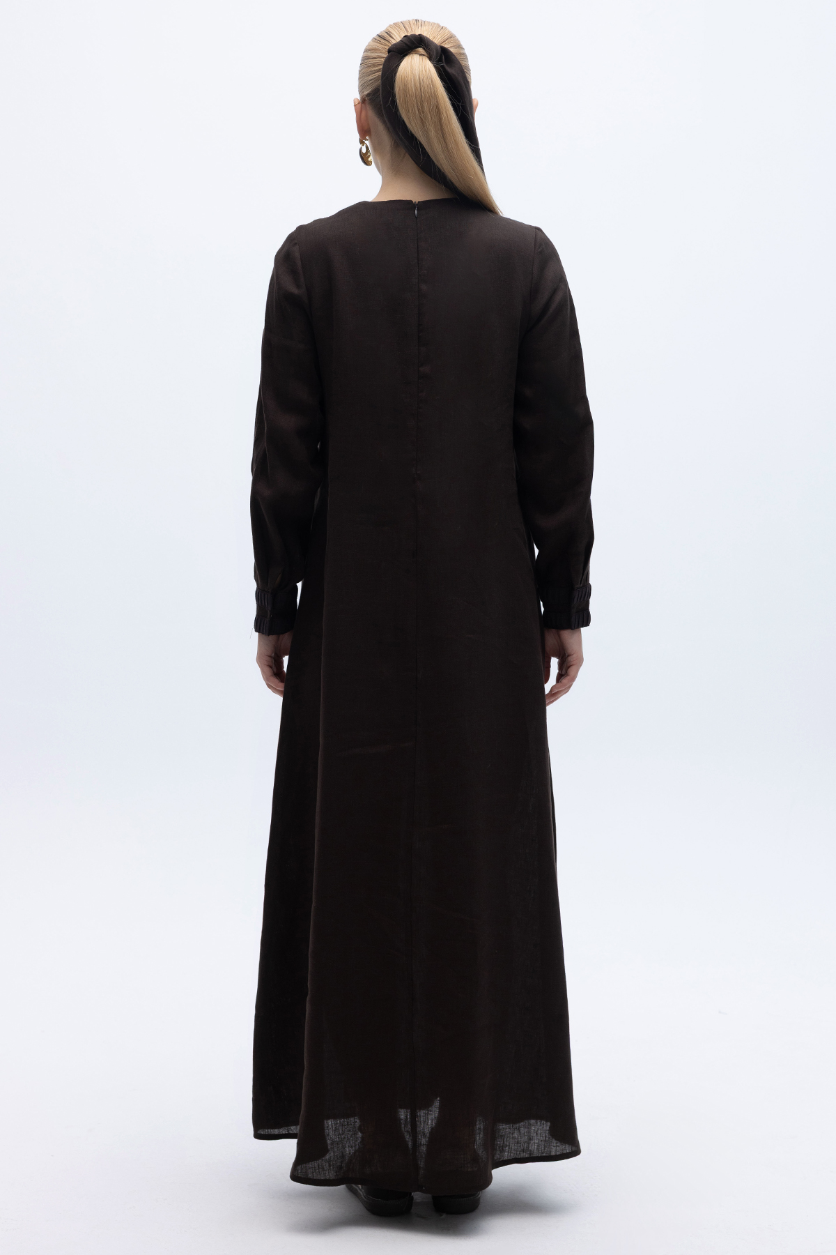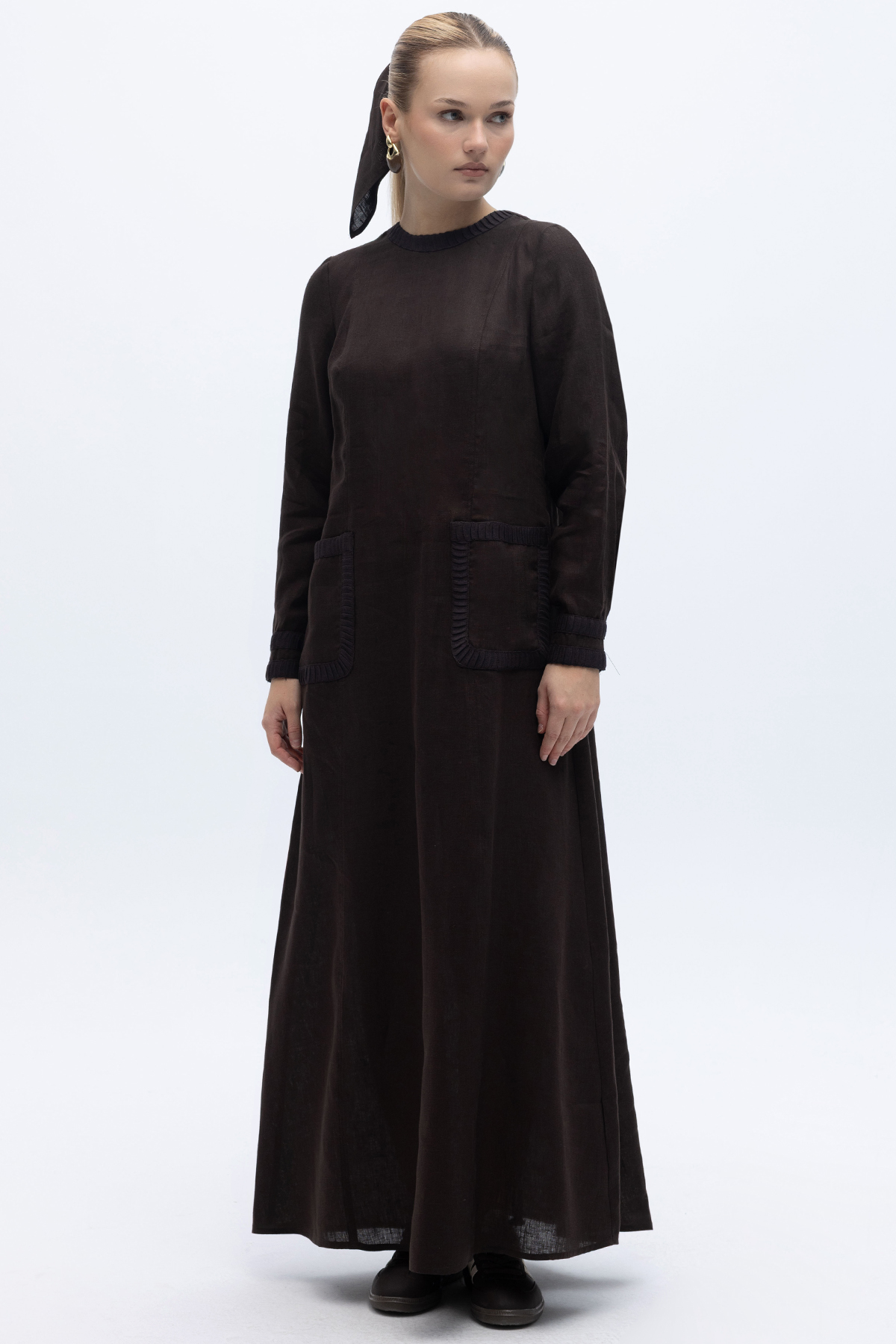 Uzun Kollu Cepli Keten Elbise Kahverengi
