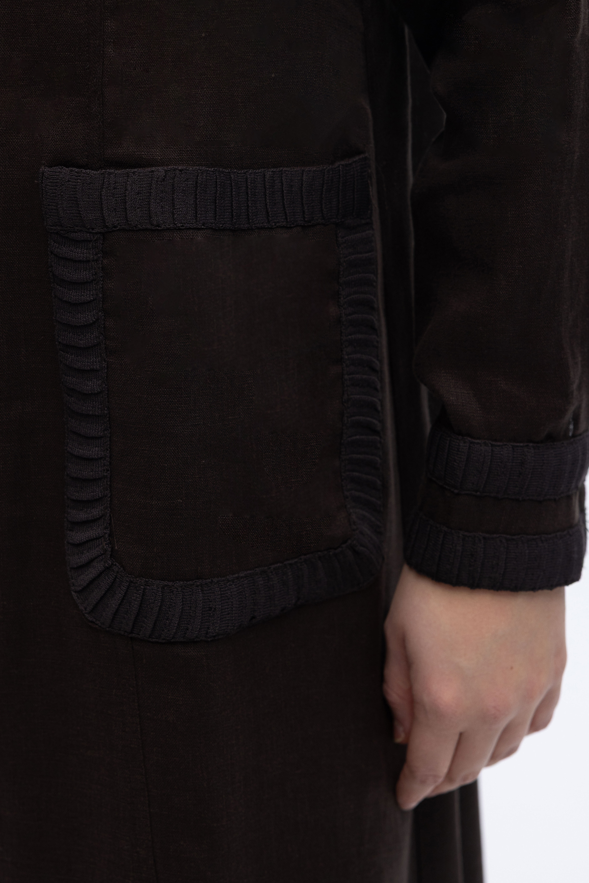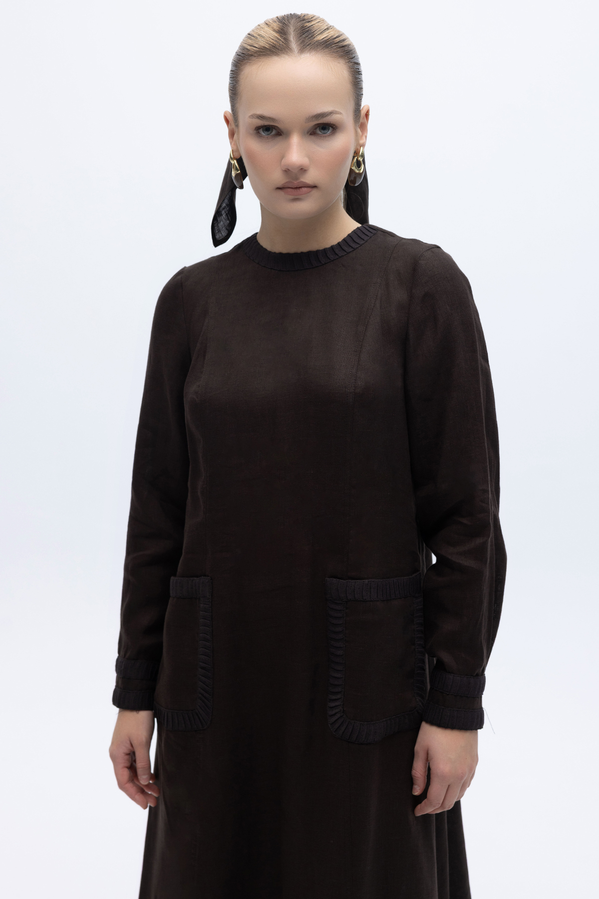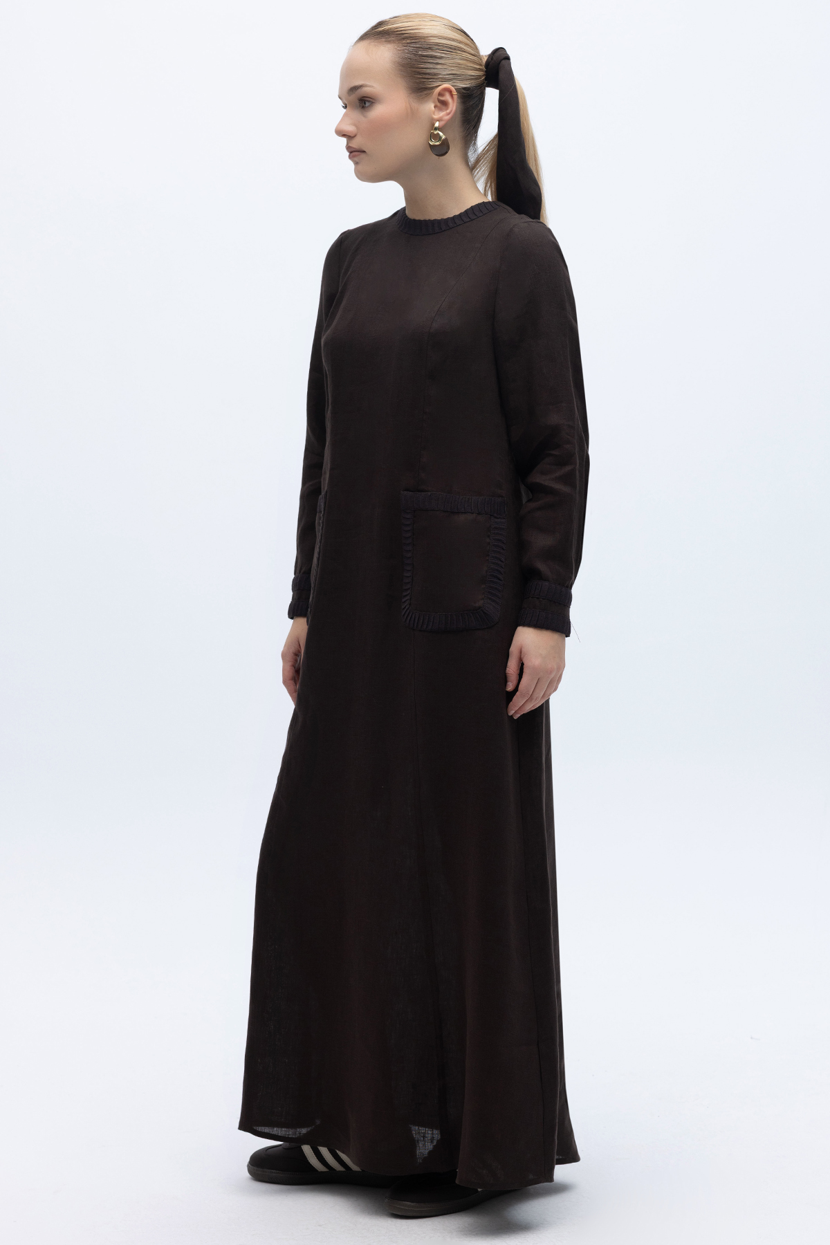 Uzun Kollu Cepli Keten Elbise Kahverengi