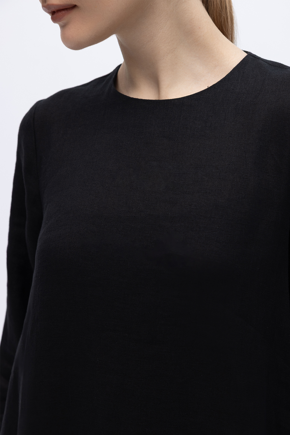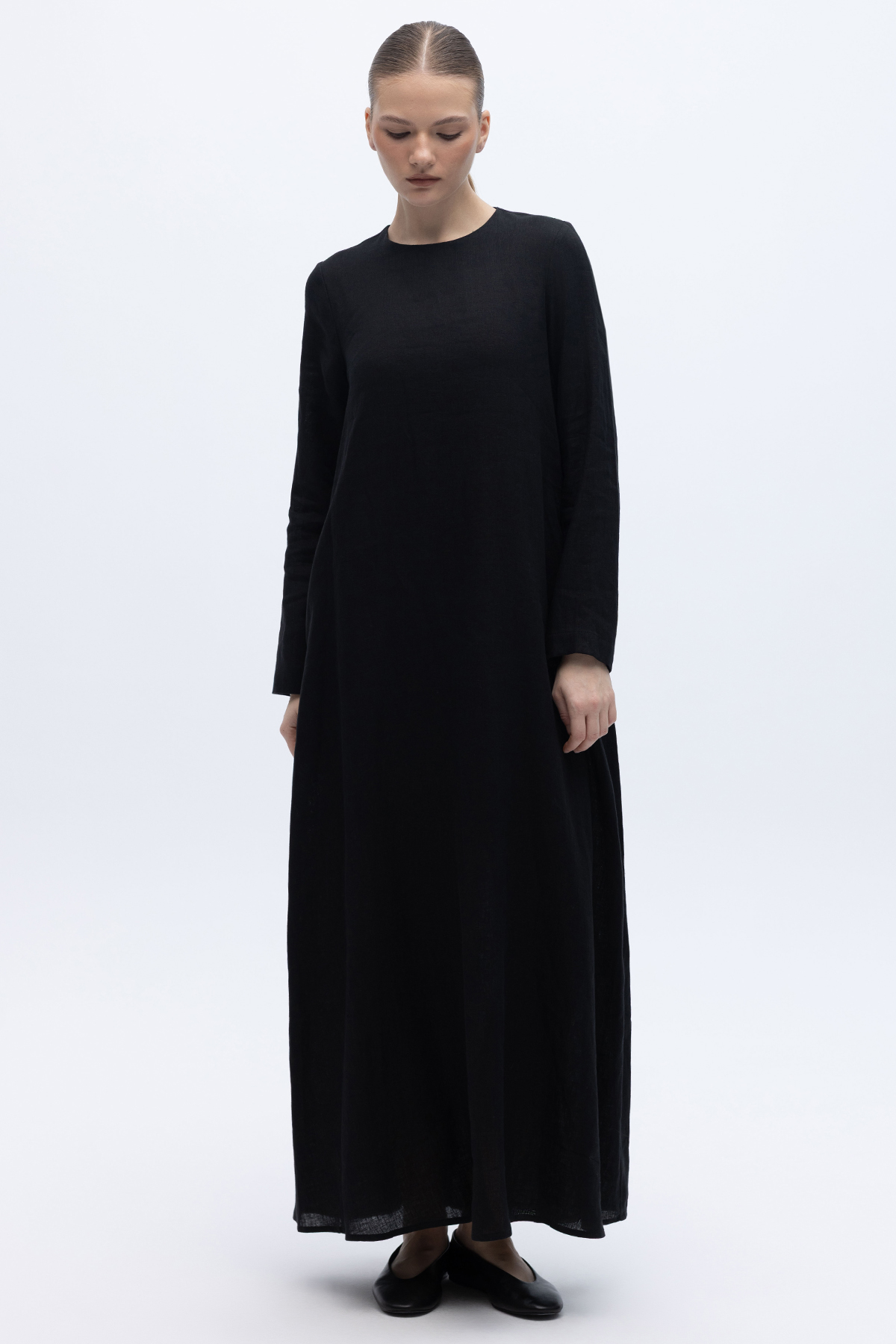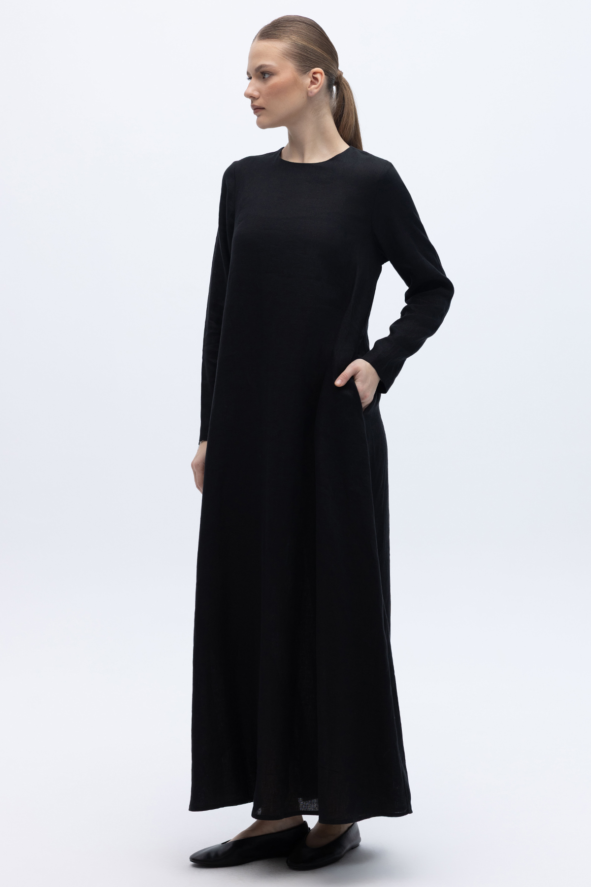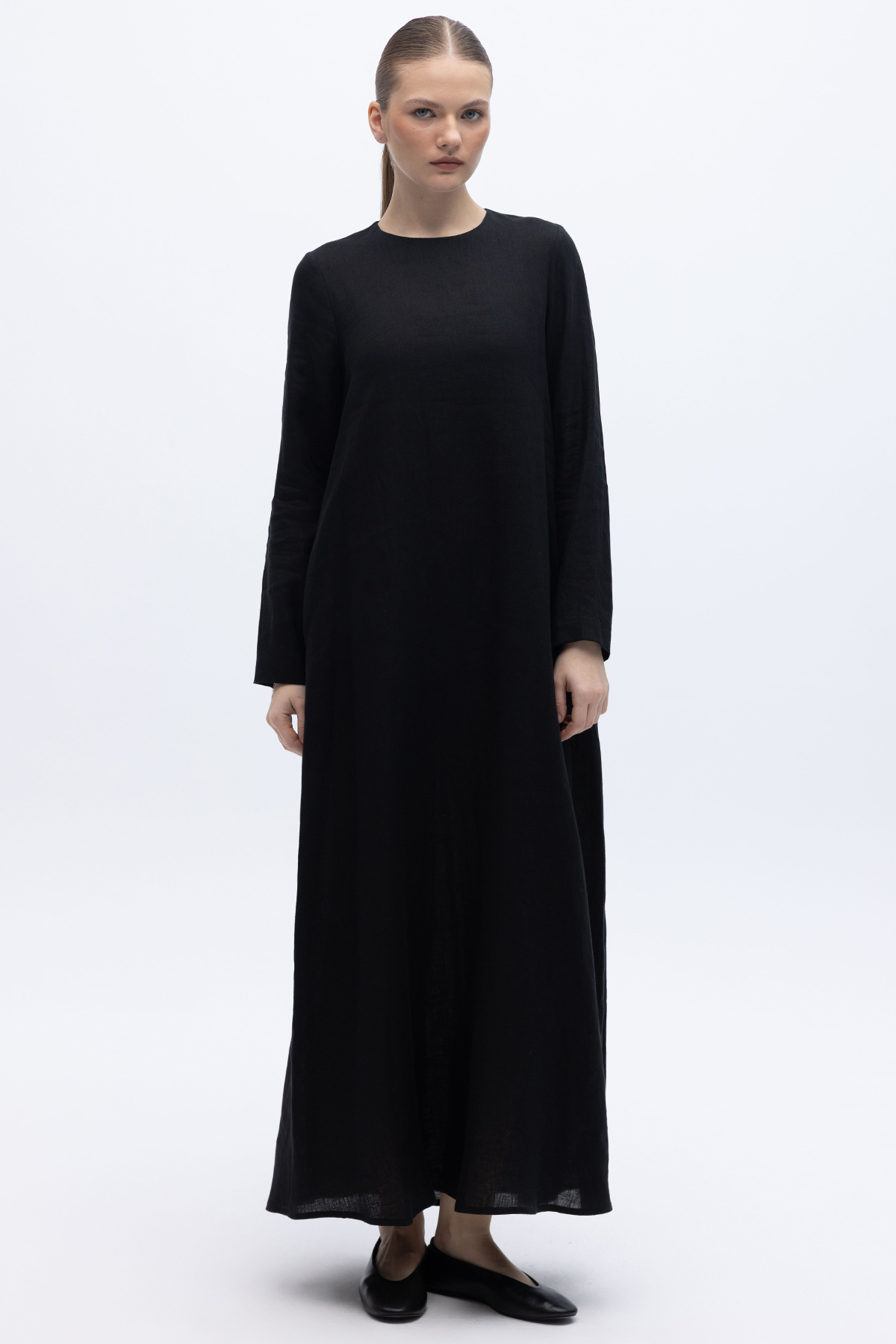Uzun Kollu Düz Renk Keten Elbise Siyah