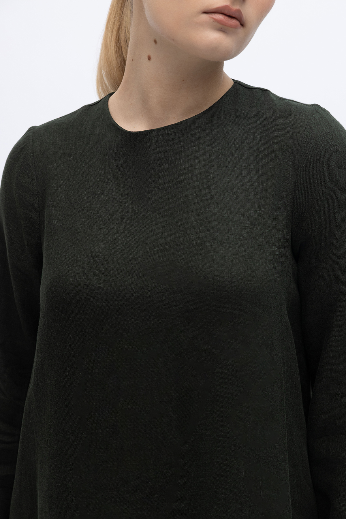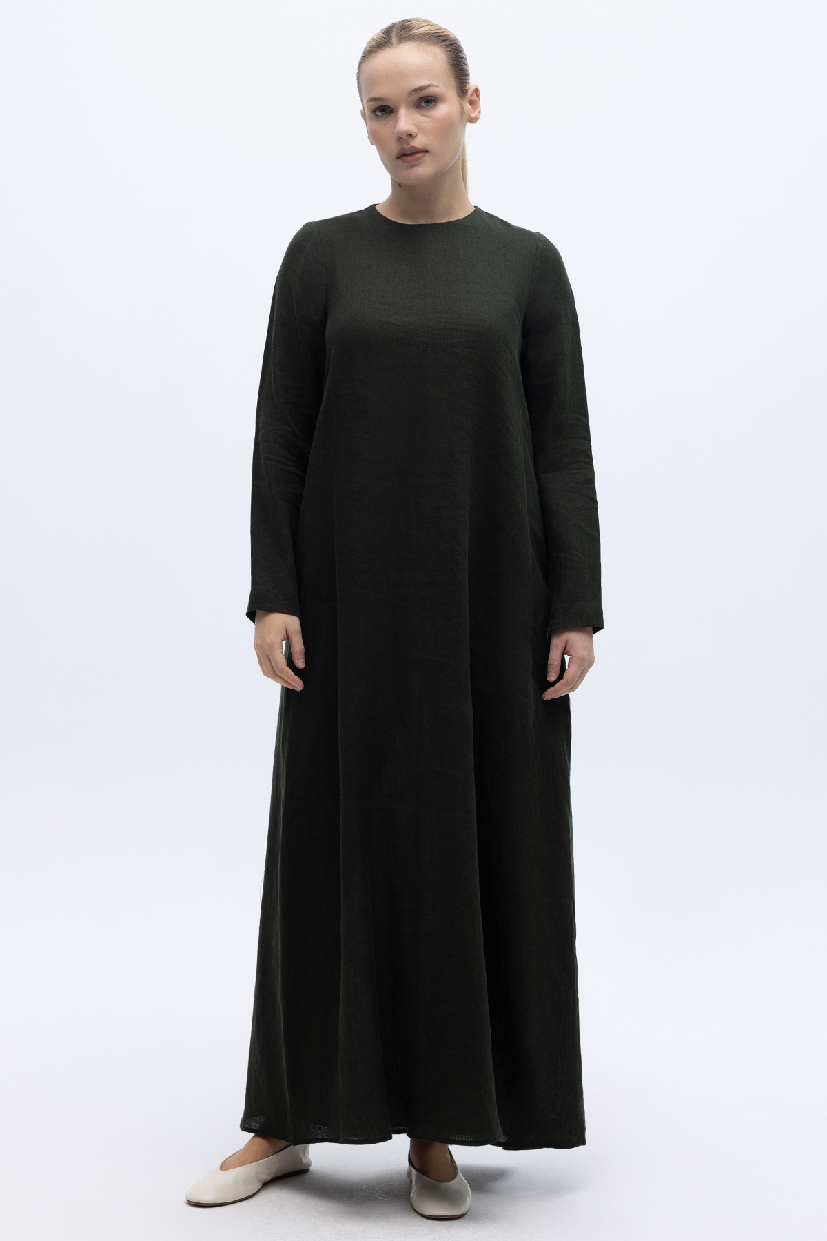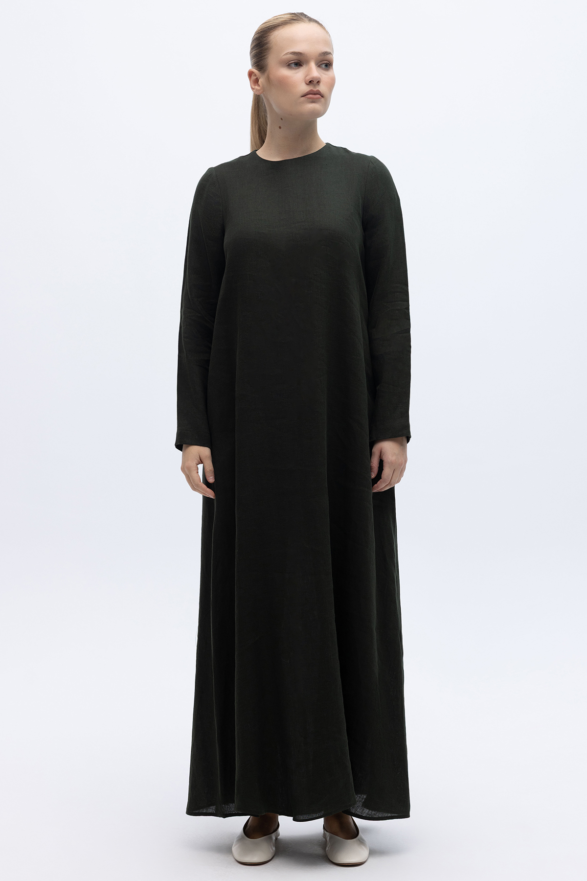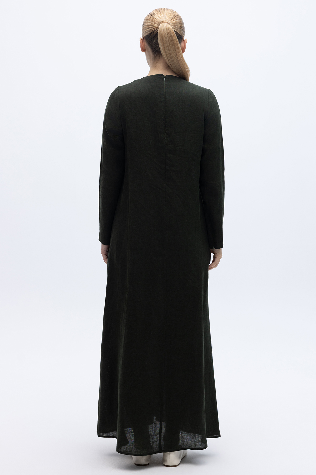 Uzun Kollu Düz Renk Keten Elbise Haki