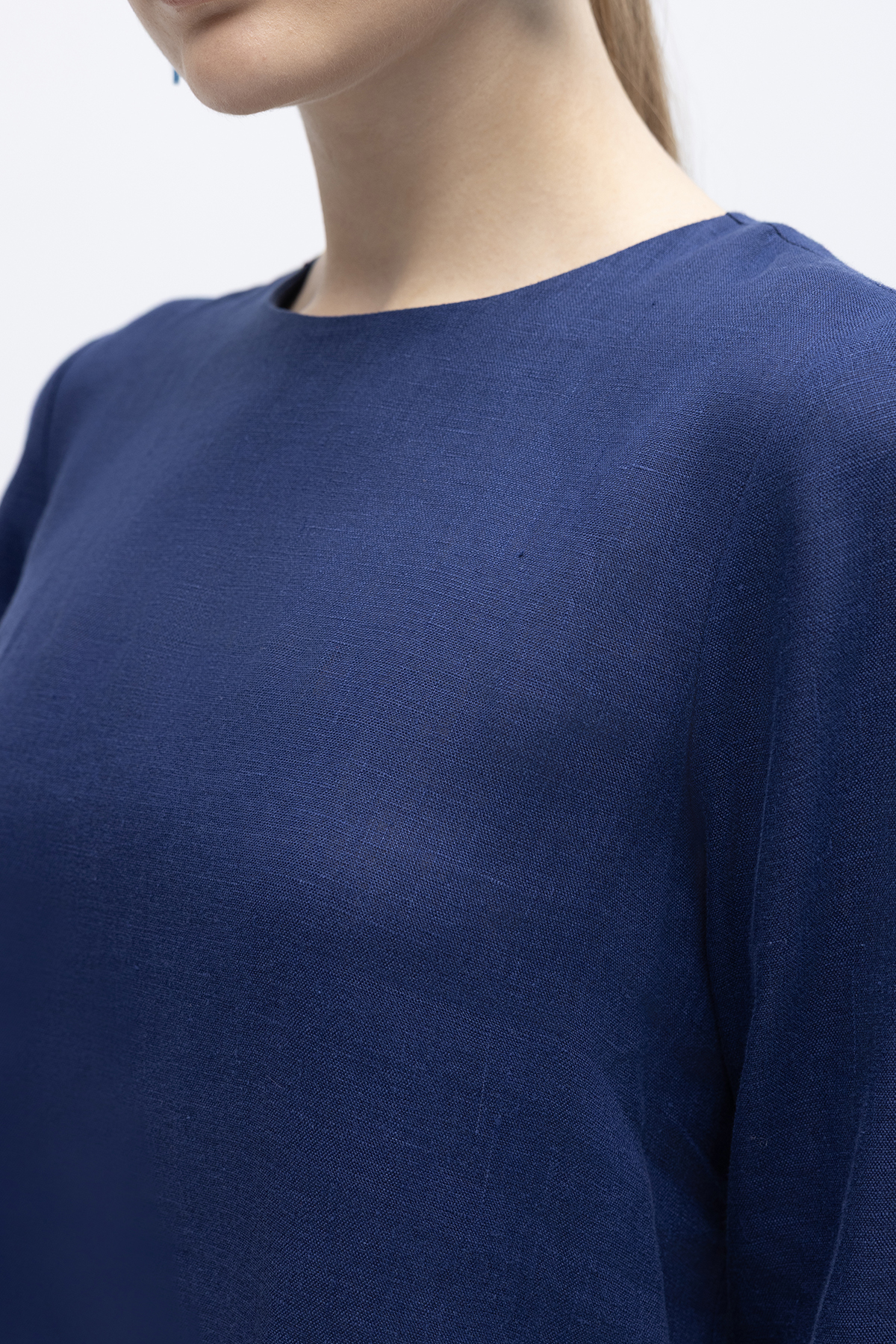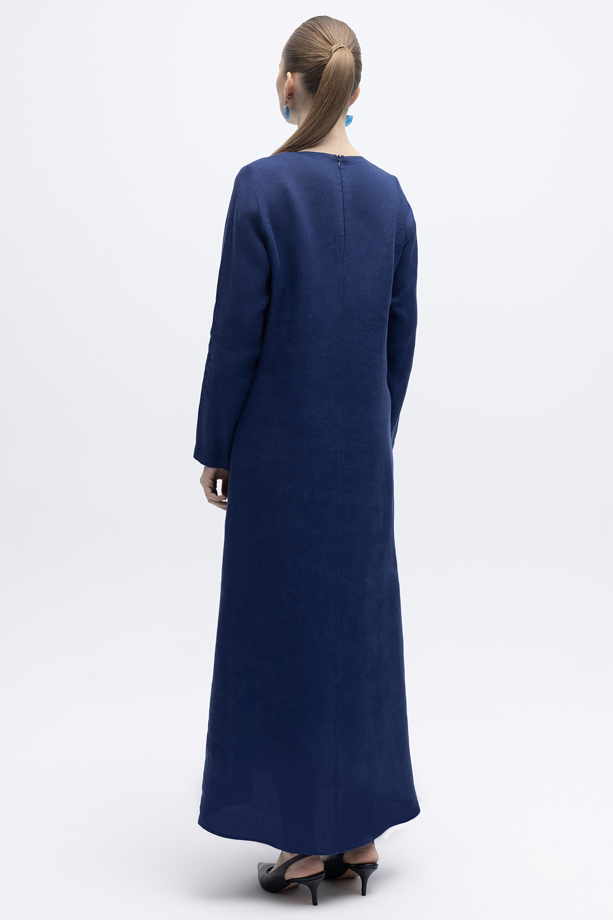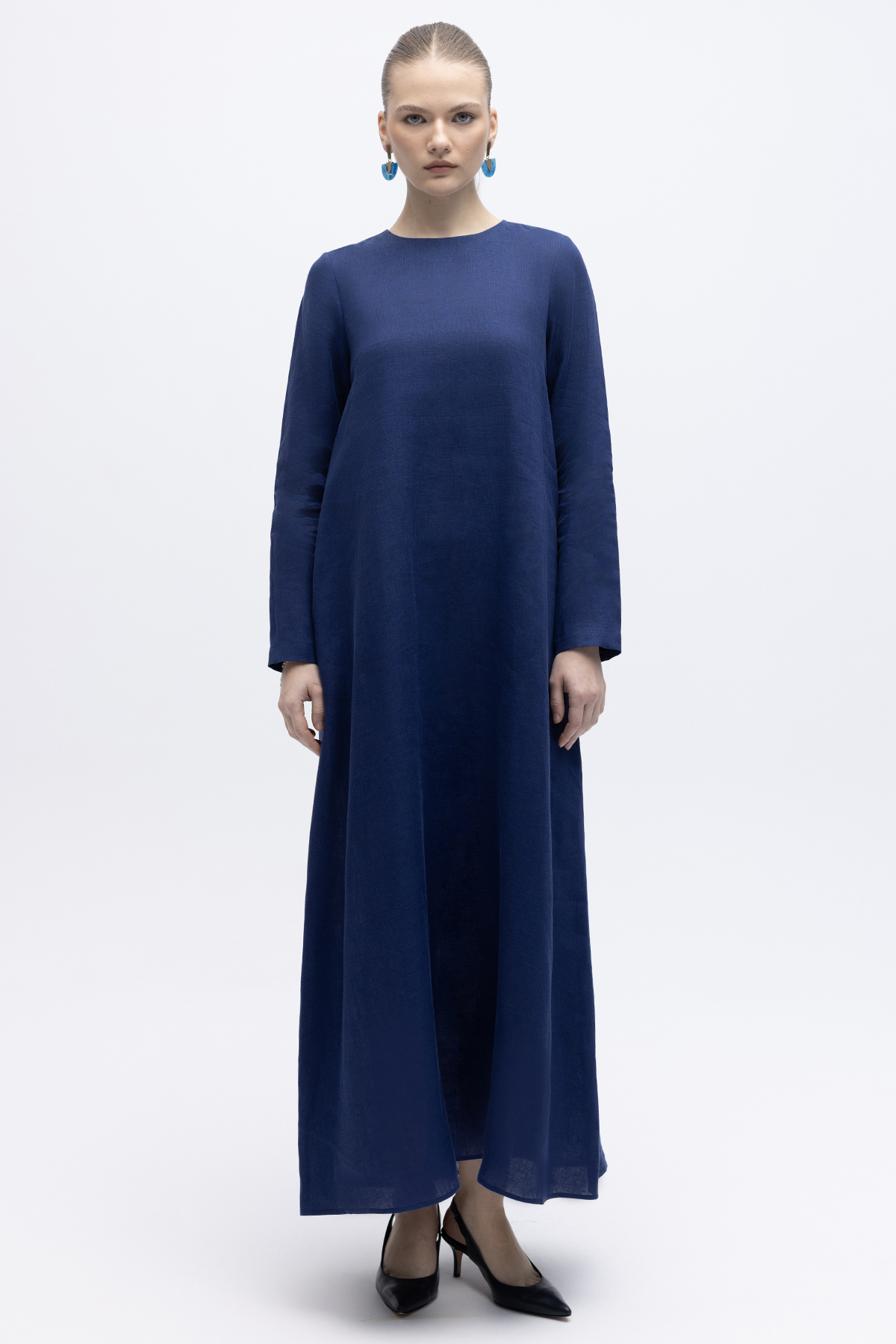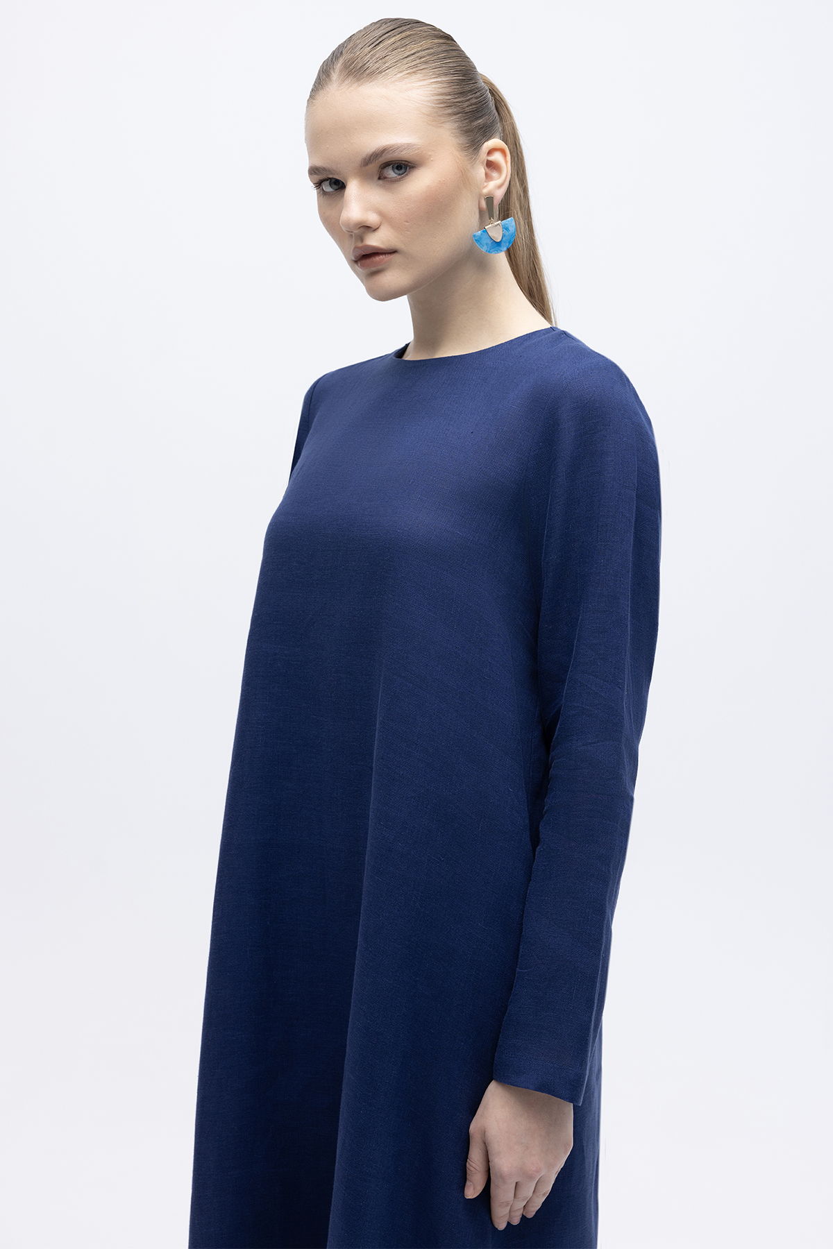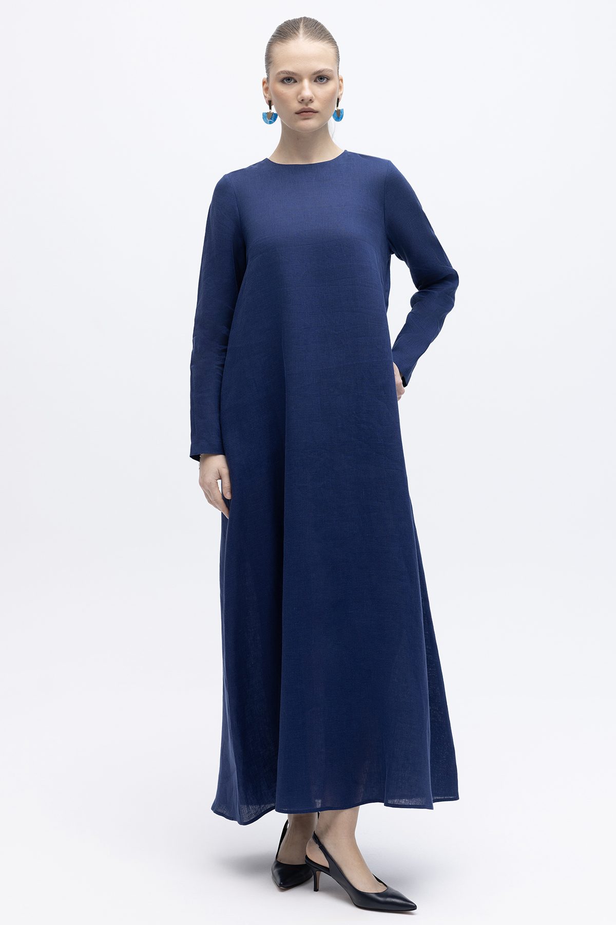 Uzun Kollu Düz Renk Keten Elbise Navy