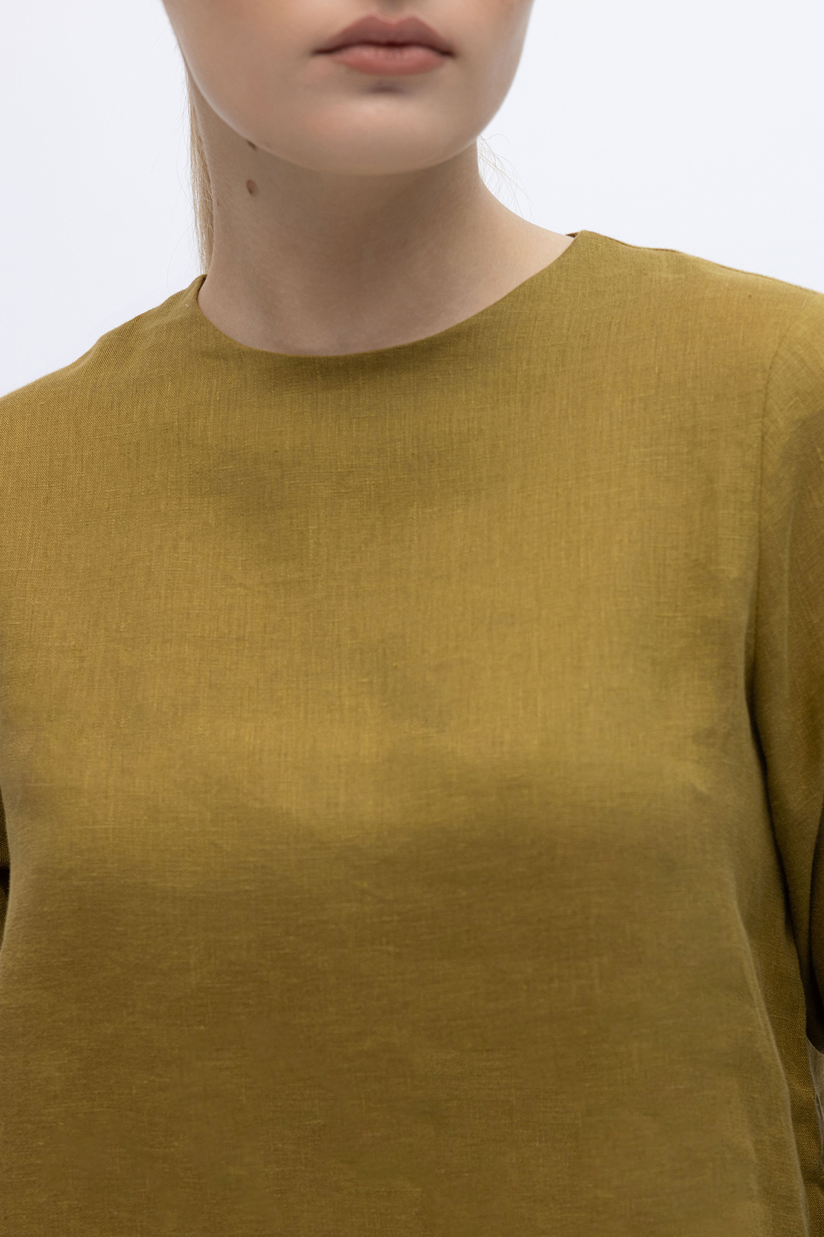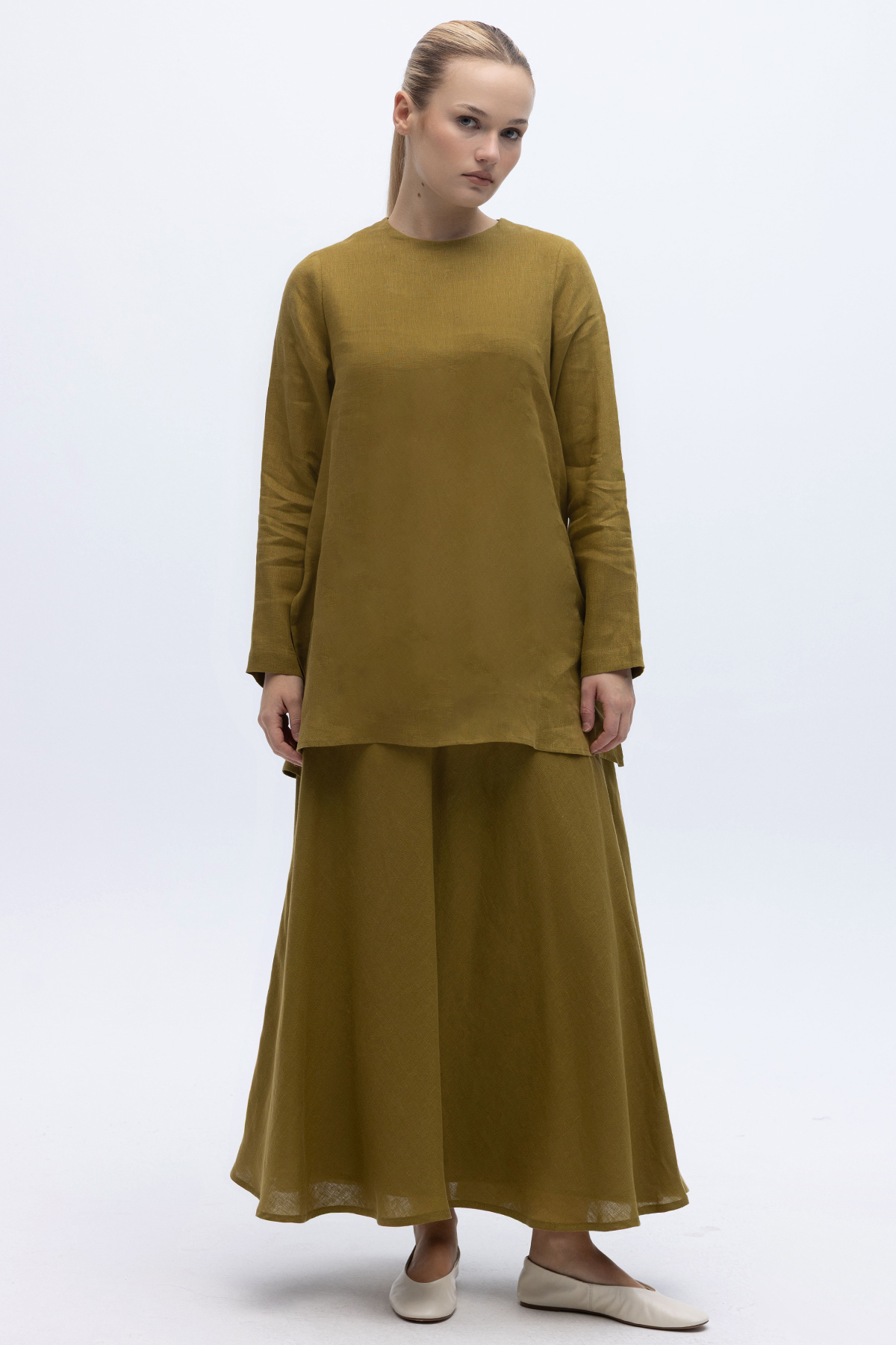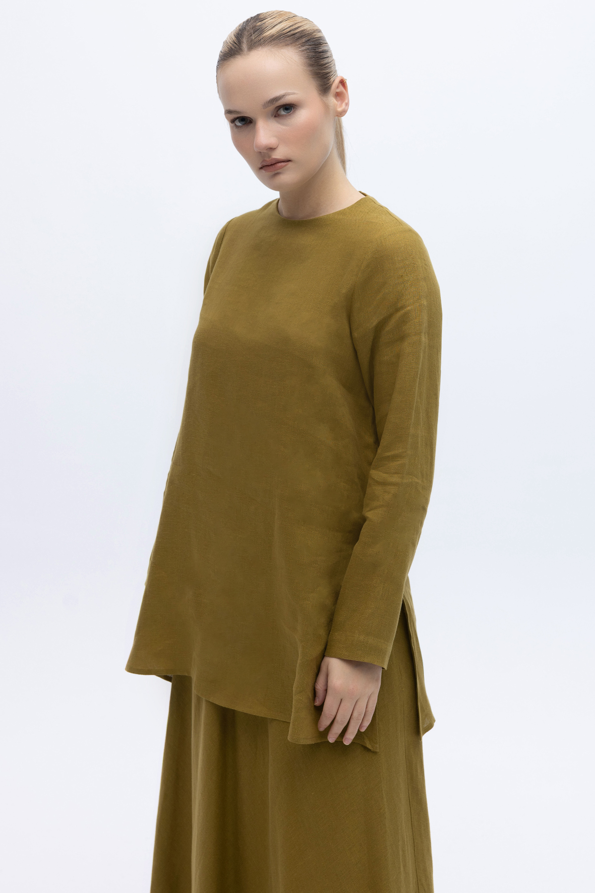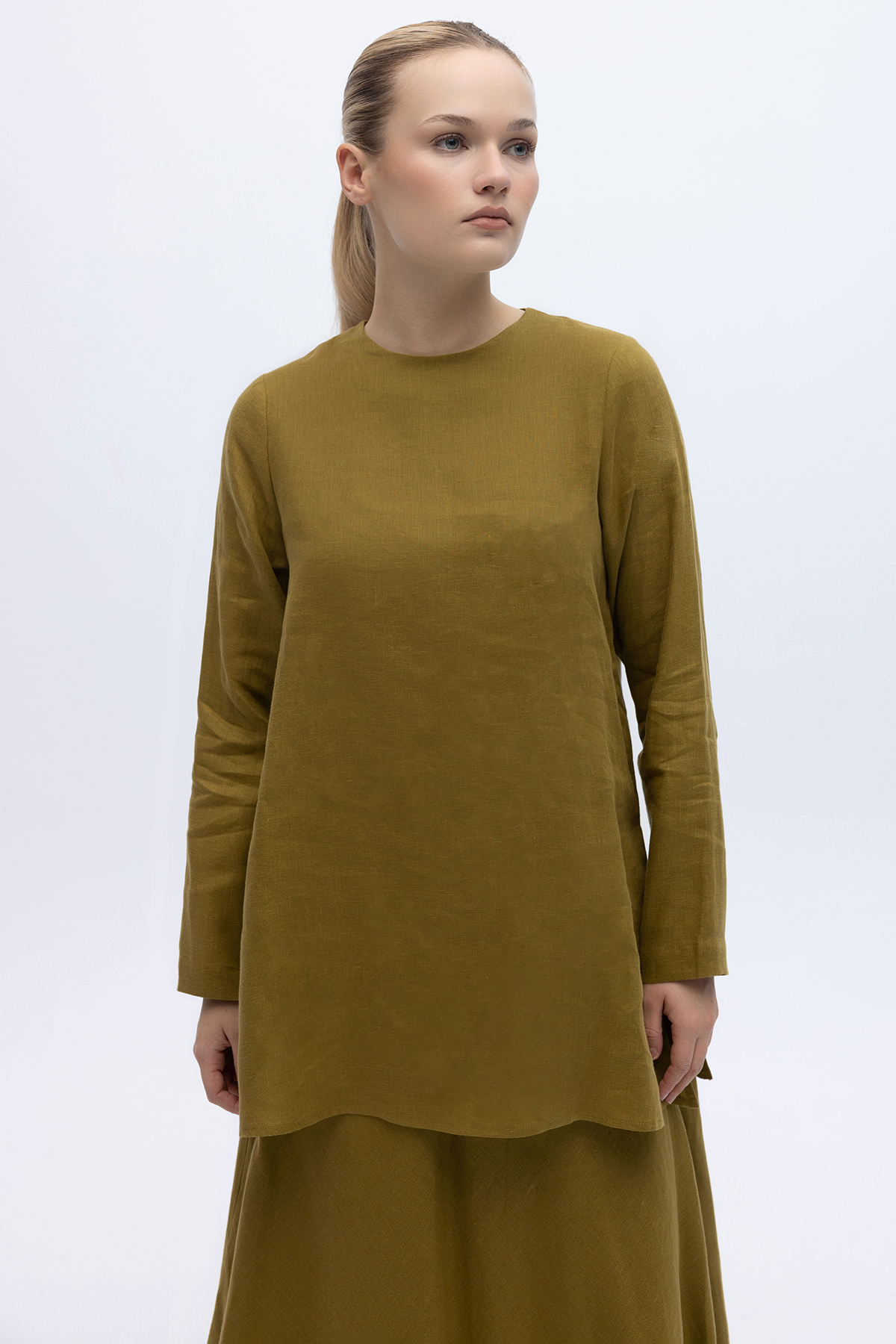 Uzun Kollu Düz Renk Keten Tunik Amber