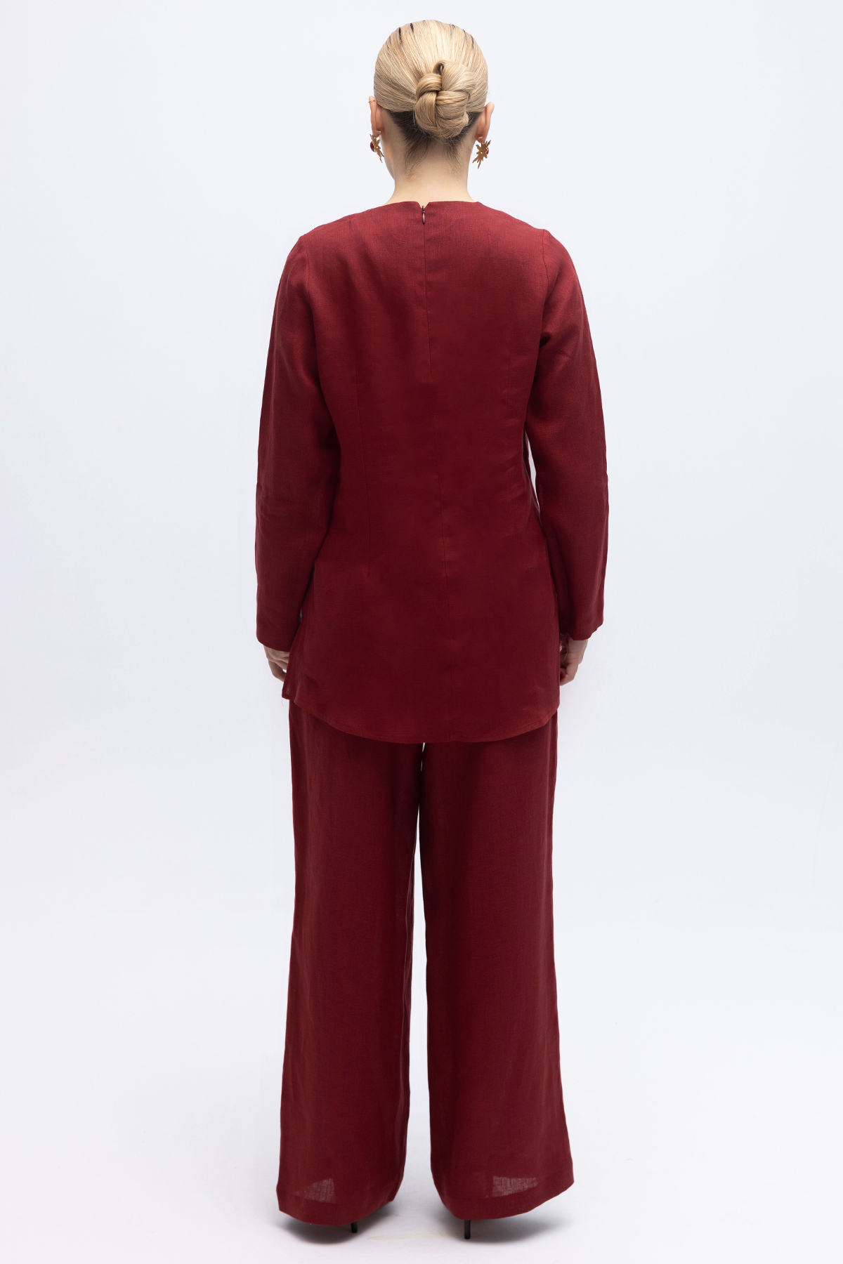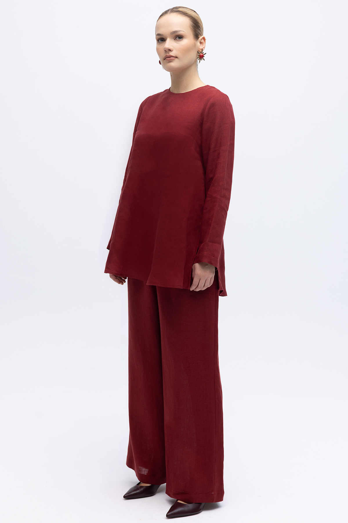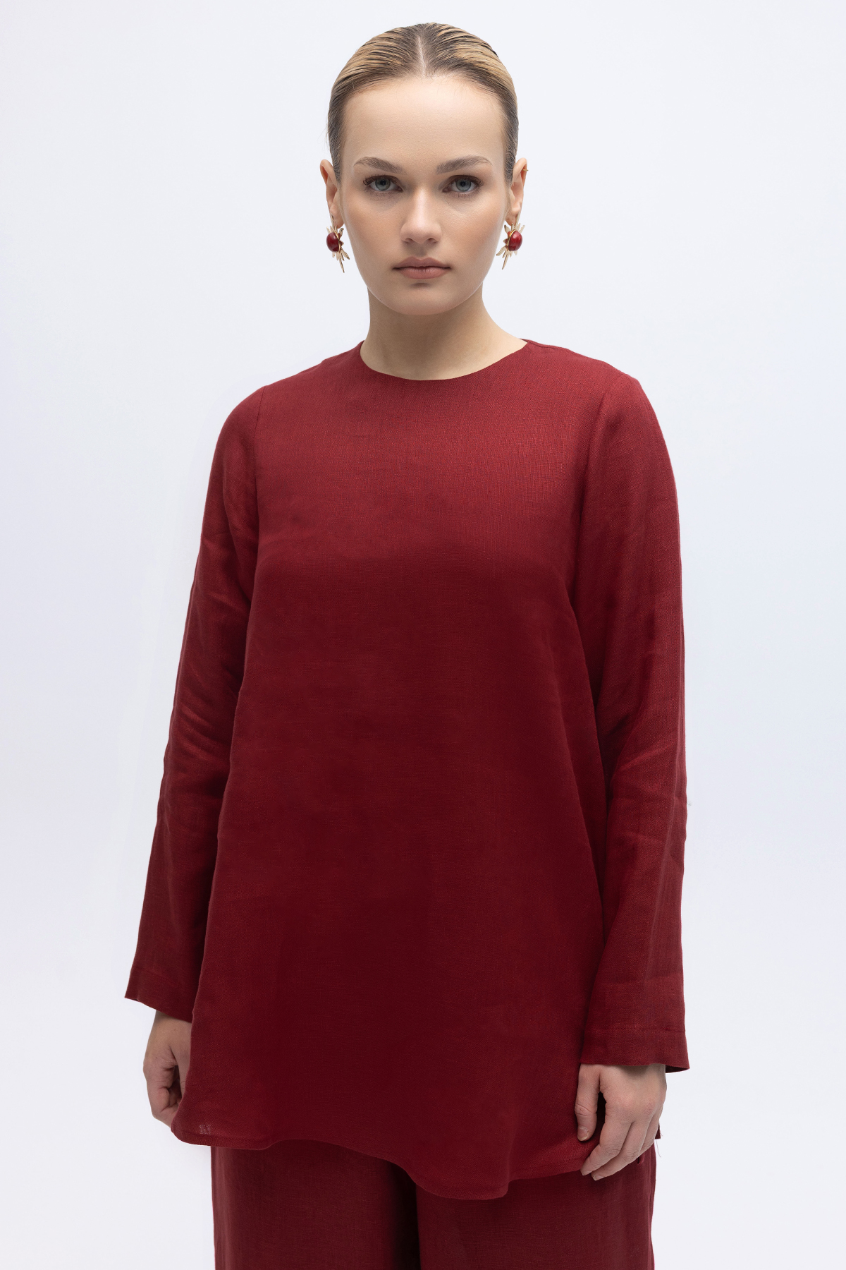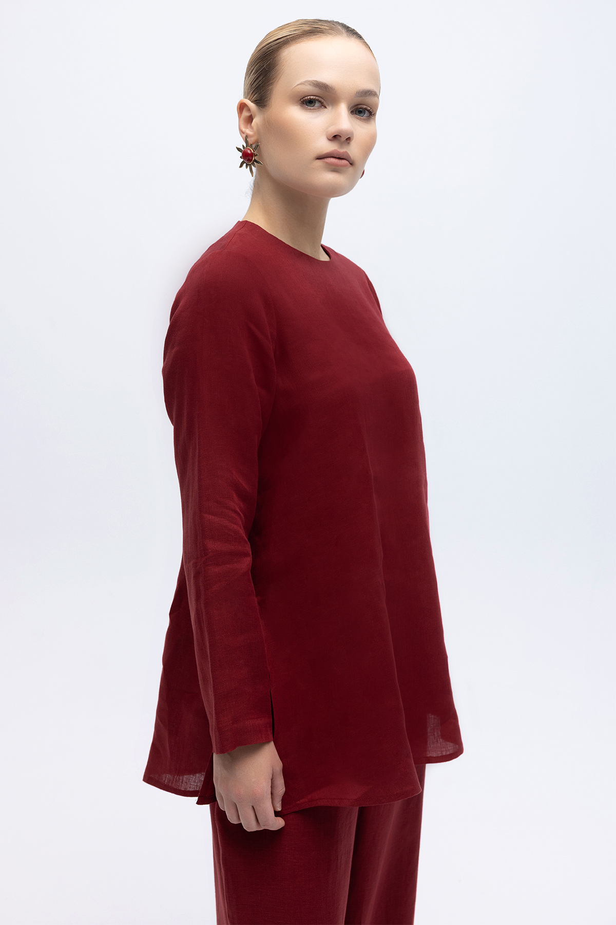 Uzun Kollu Düz Renk Keten Tunik Cherry