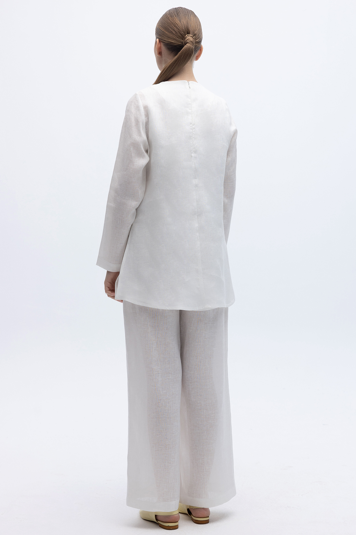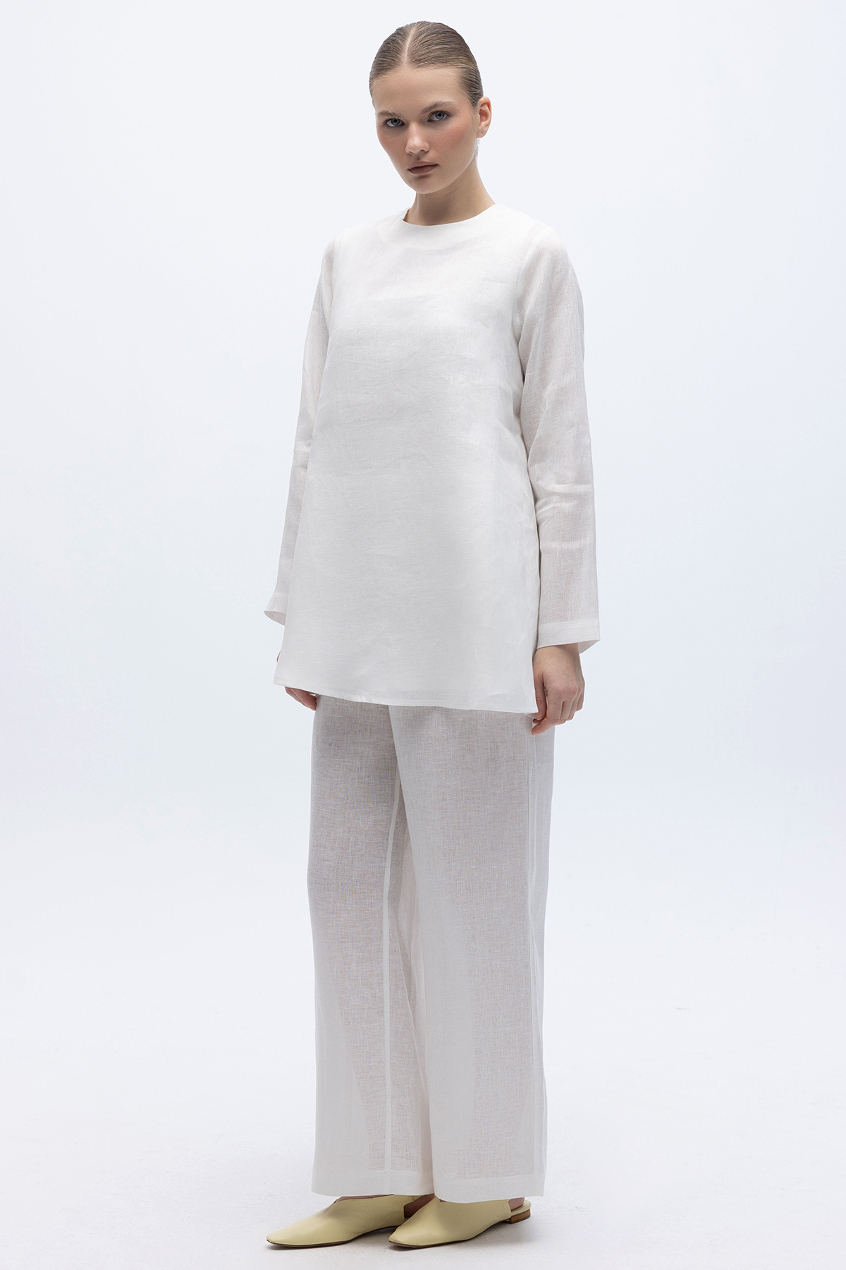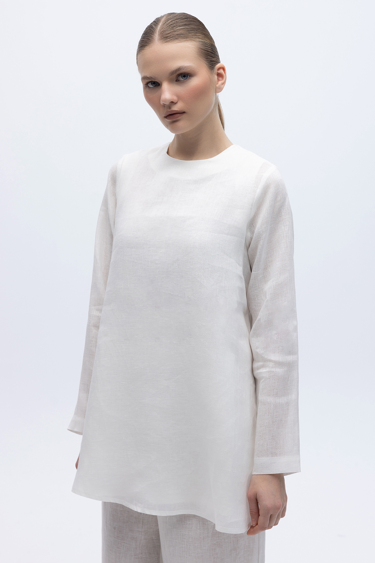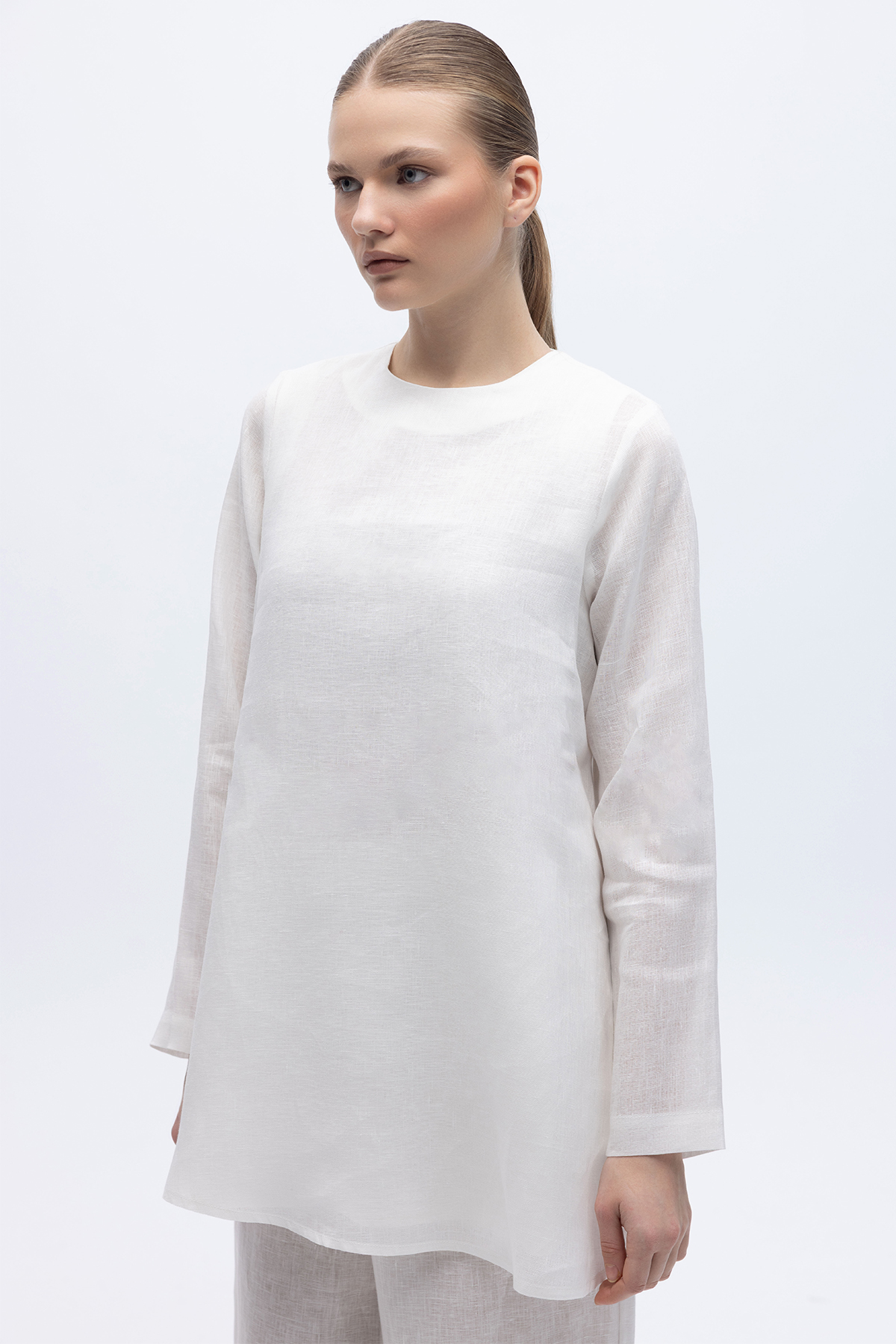 Uzun Kollu Düz Renk Keten Tunik Ekru