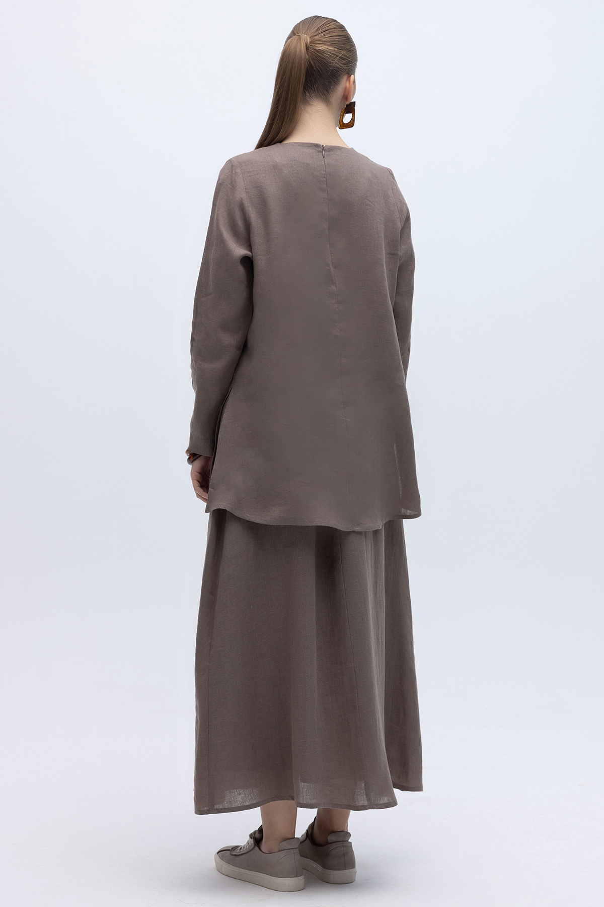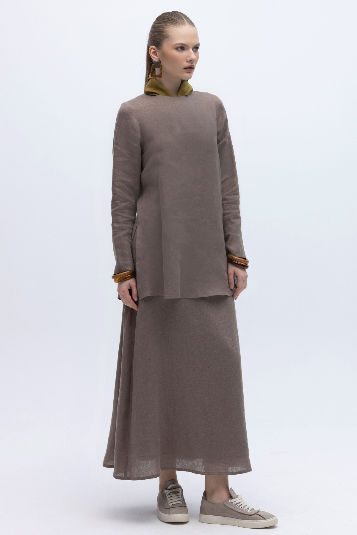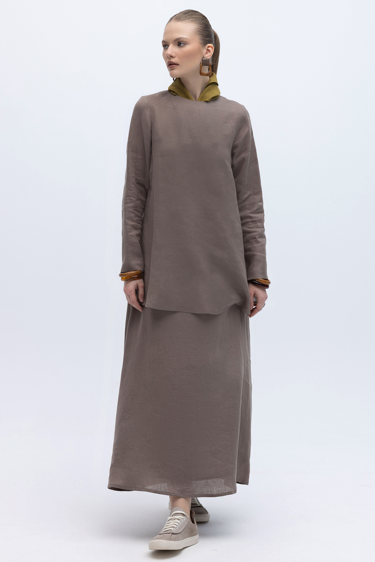 Uzun Kollu Düz Renk Keten Tunik Mink