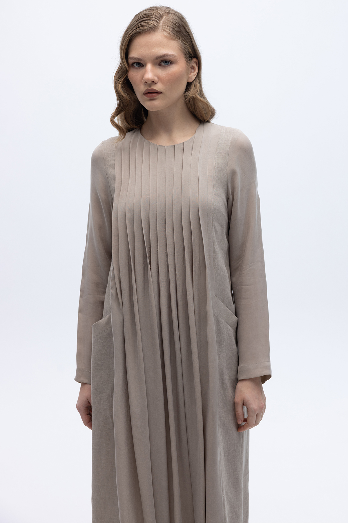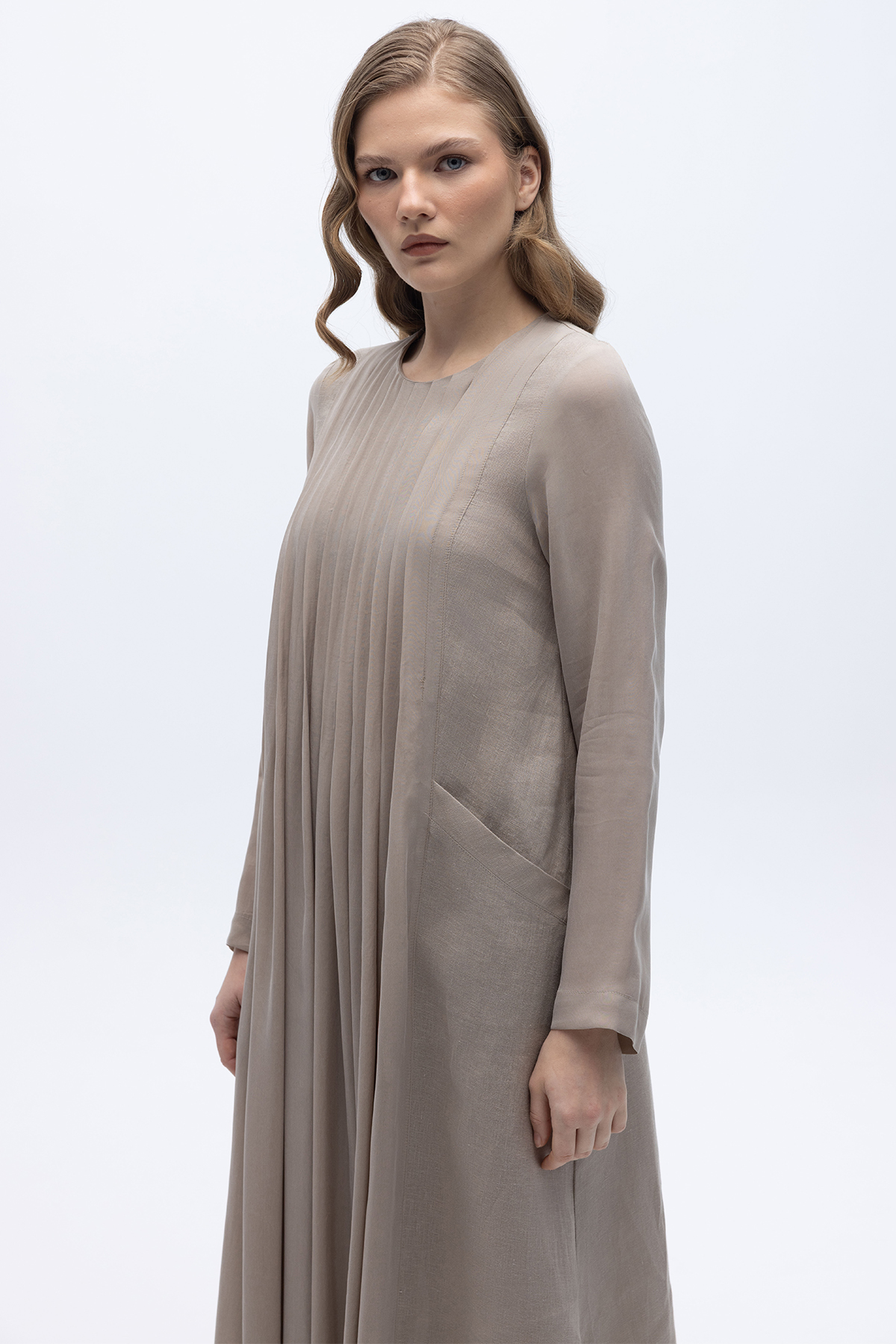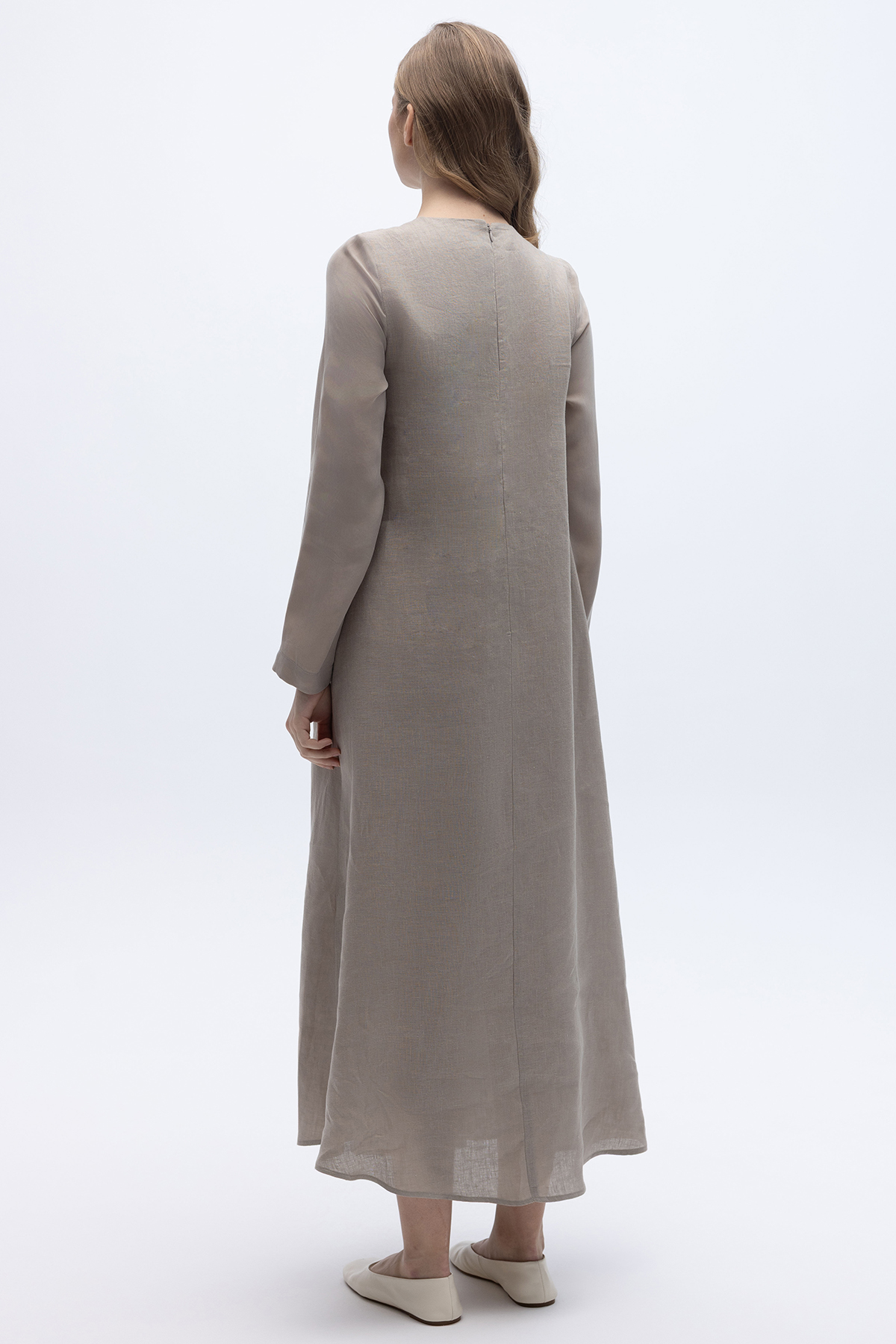 Uzun Kollu Keten Cupro Elbise Stone