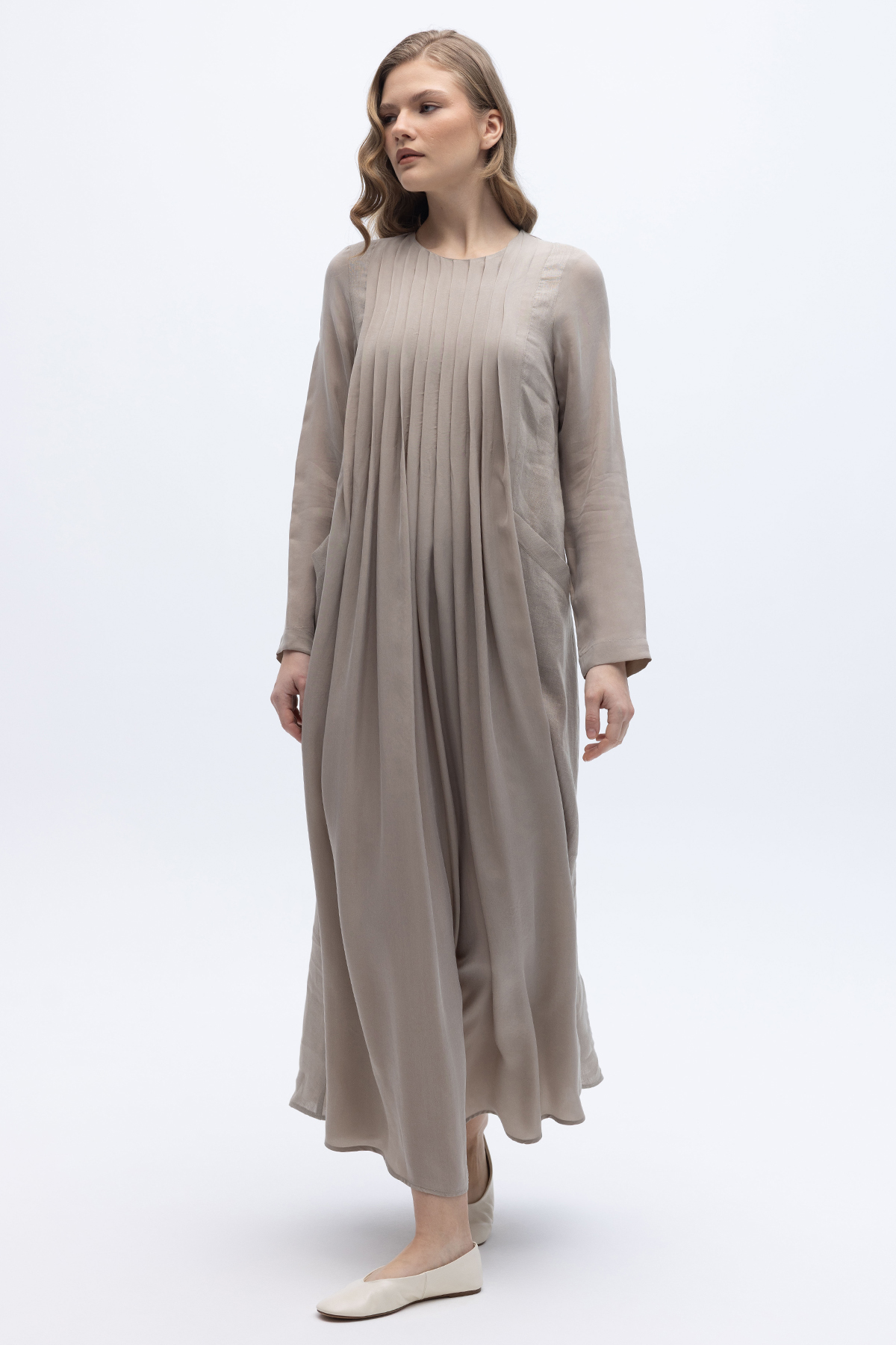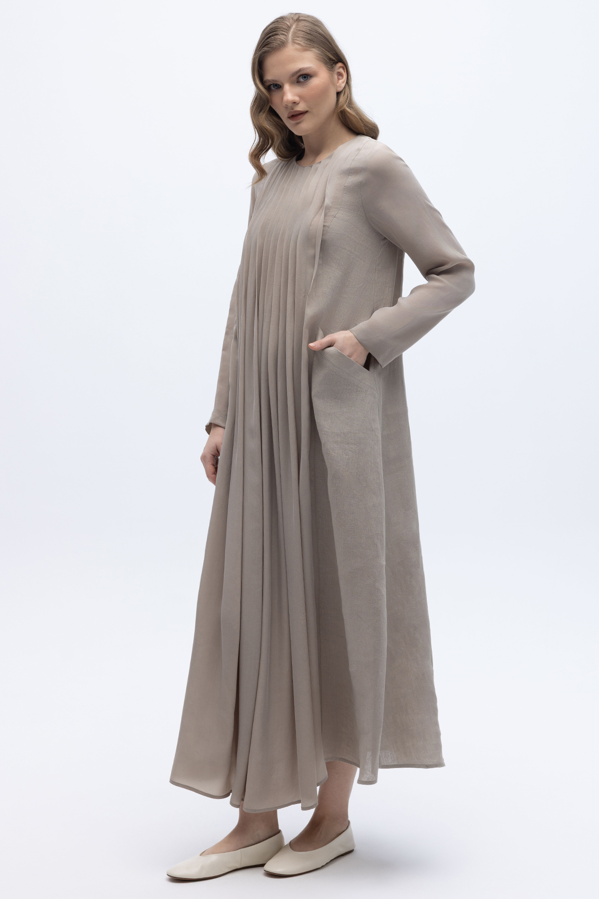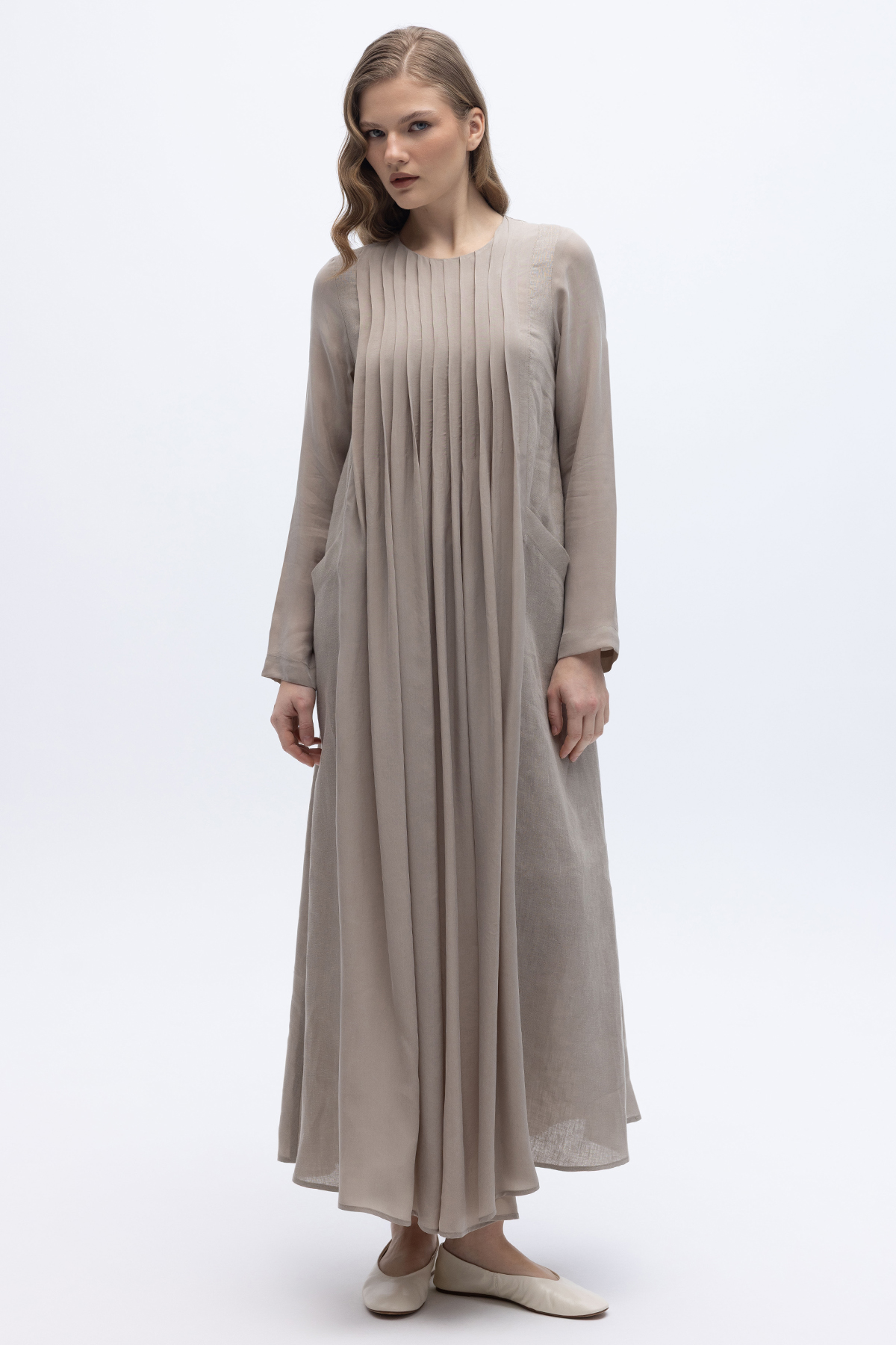 Uzun Kollu Keten Cupro Elbise Stone
