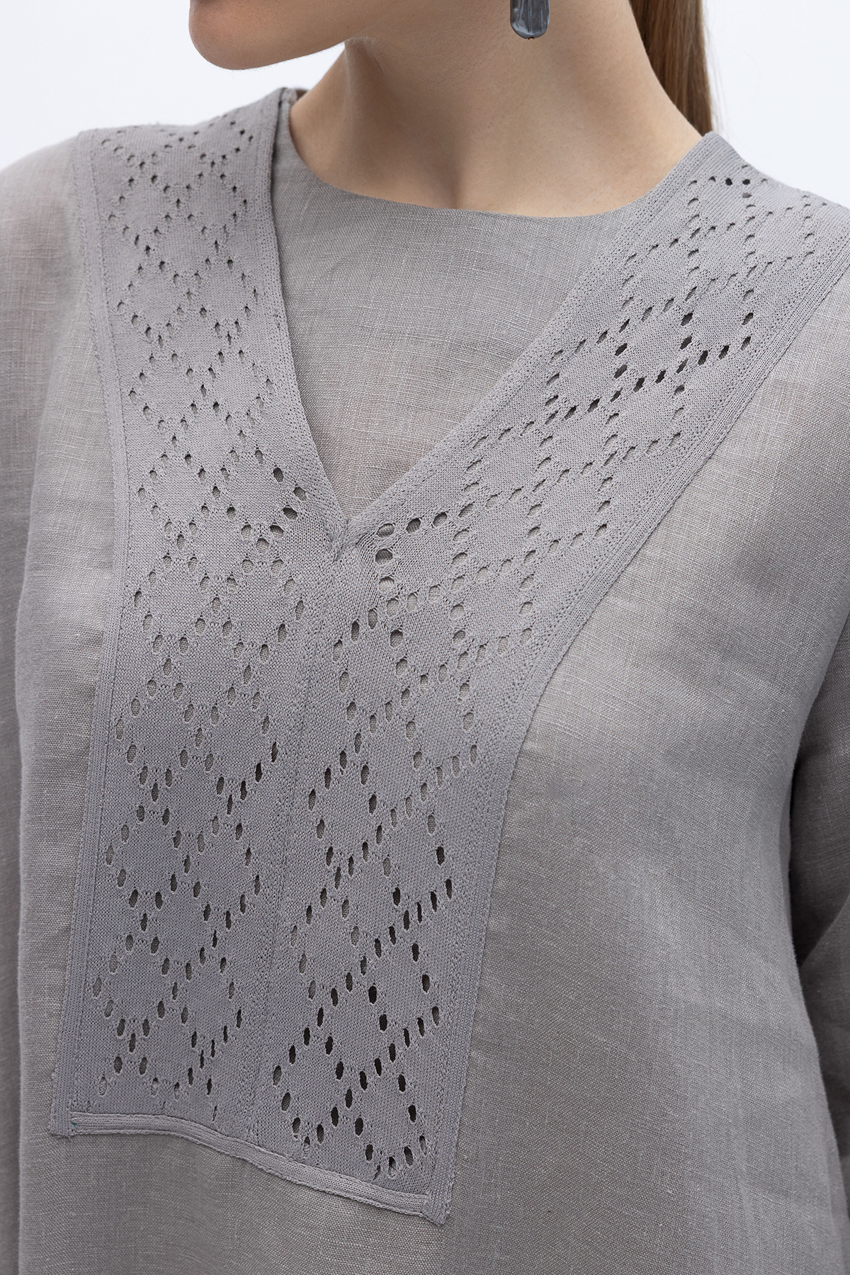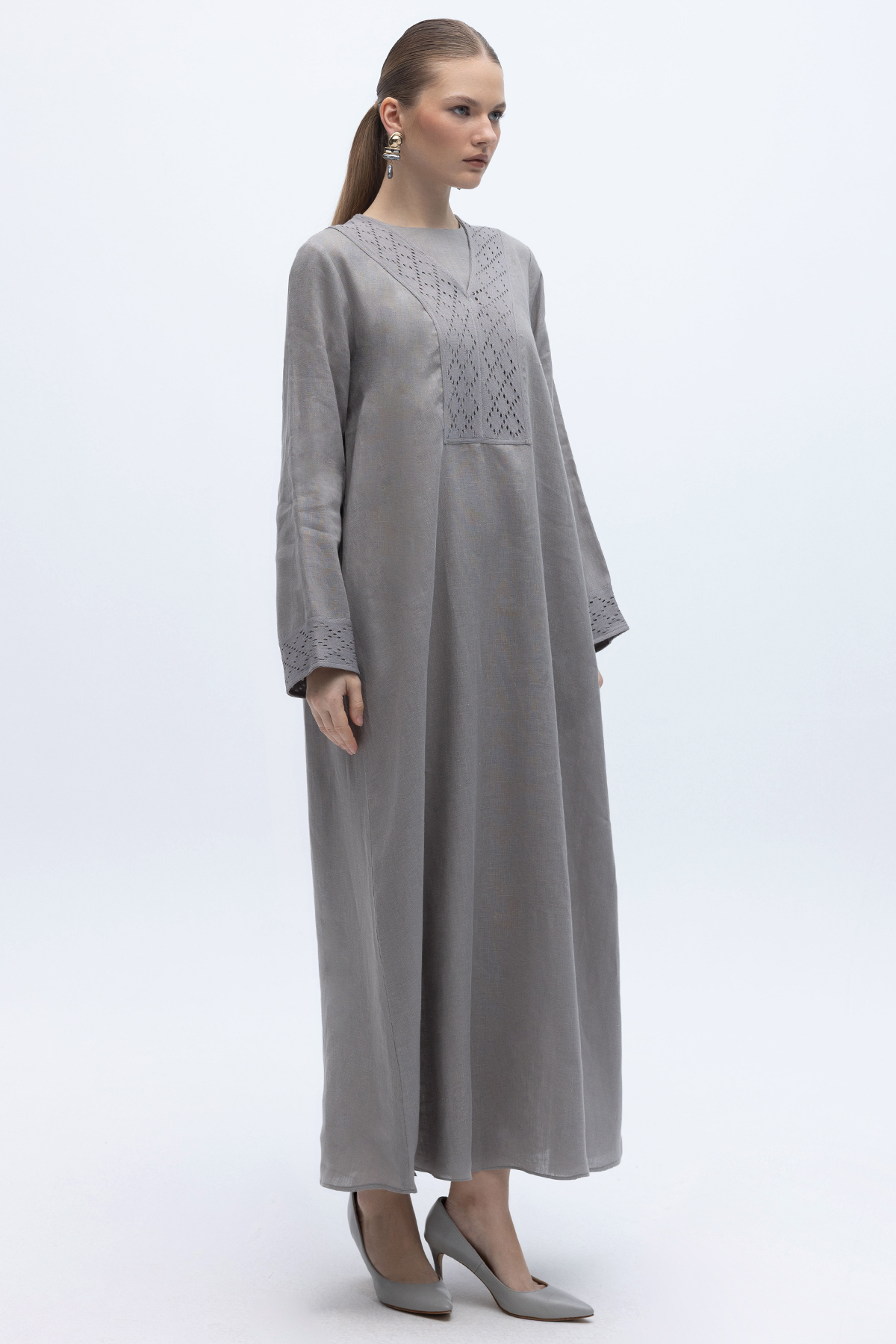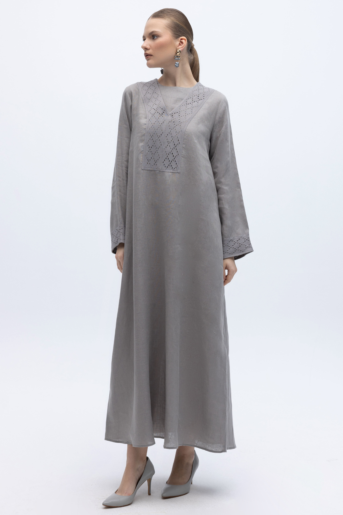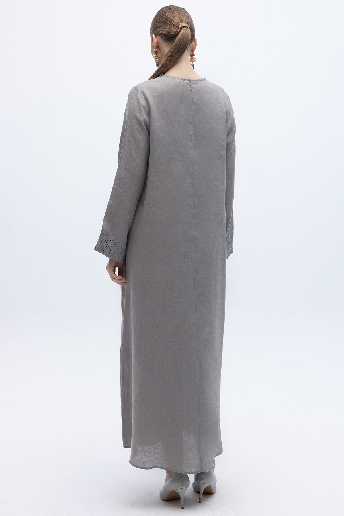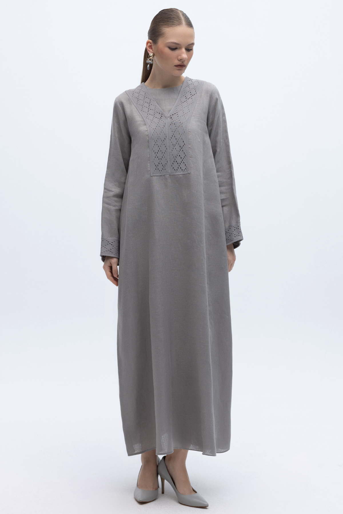 V Yaka Ajurlu Keten Elbise Gri