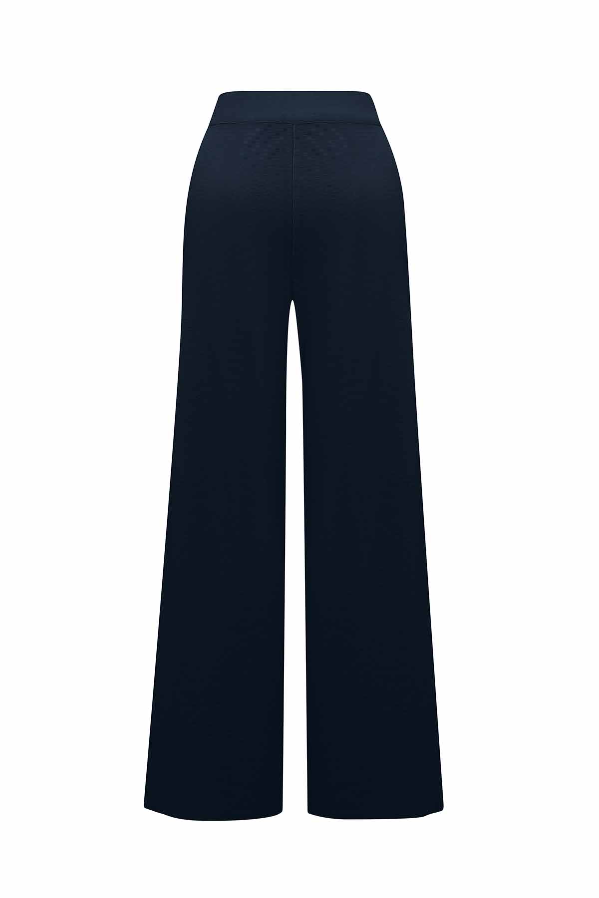 The Wide Leg Navy Knit Pants feature a relaxed wide-leg silhouette for modern comfort. Its soft knit fabric ensures all-day wearability. The classic navy color pairs effortlessly with various tops and accessories, ideal for both casual and office looks.
