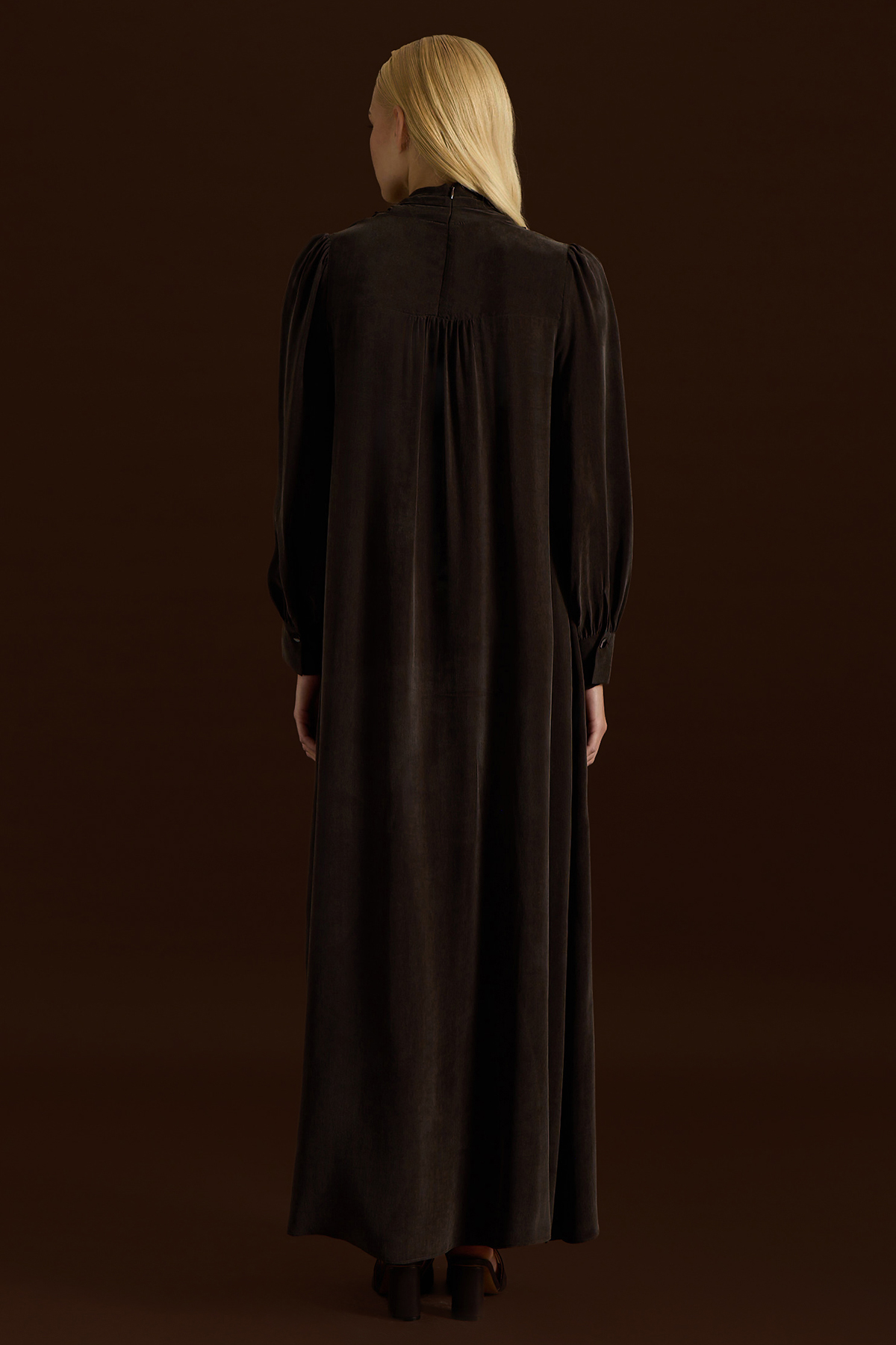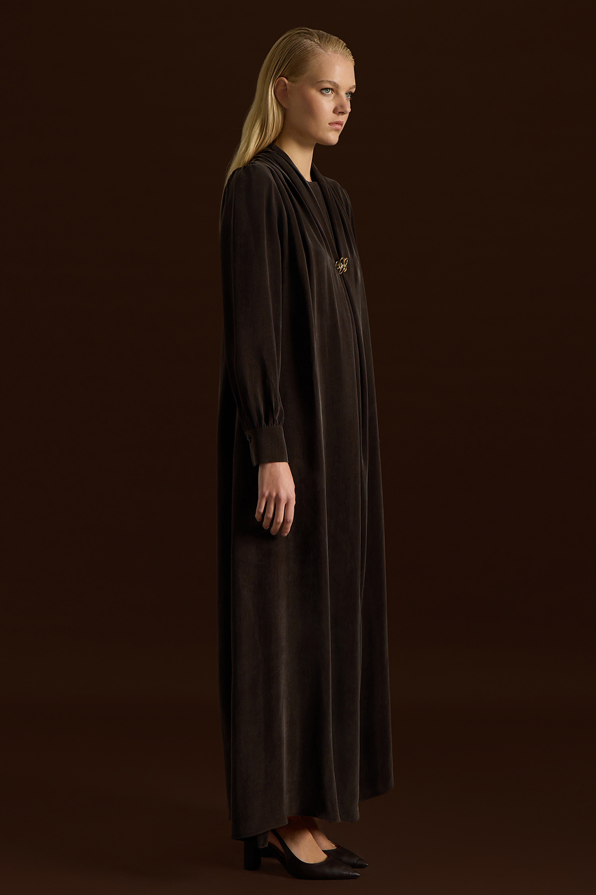 Yaka Detaylı Broşlu Cupro Elbise Kahverengi
