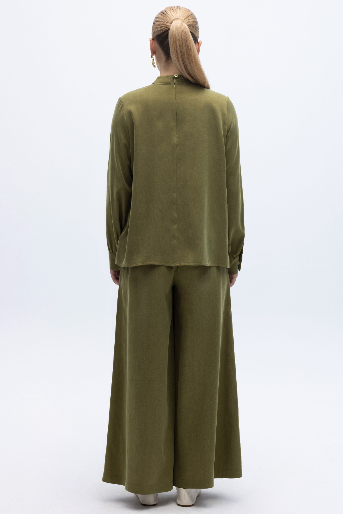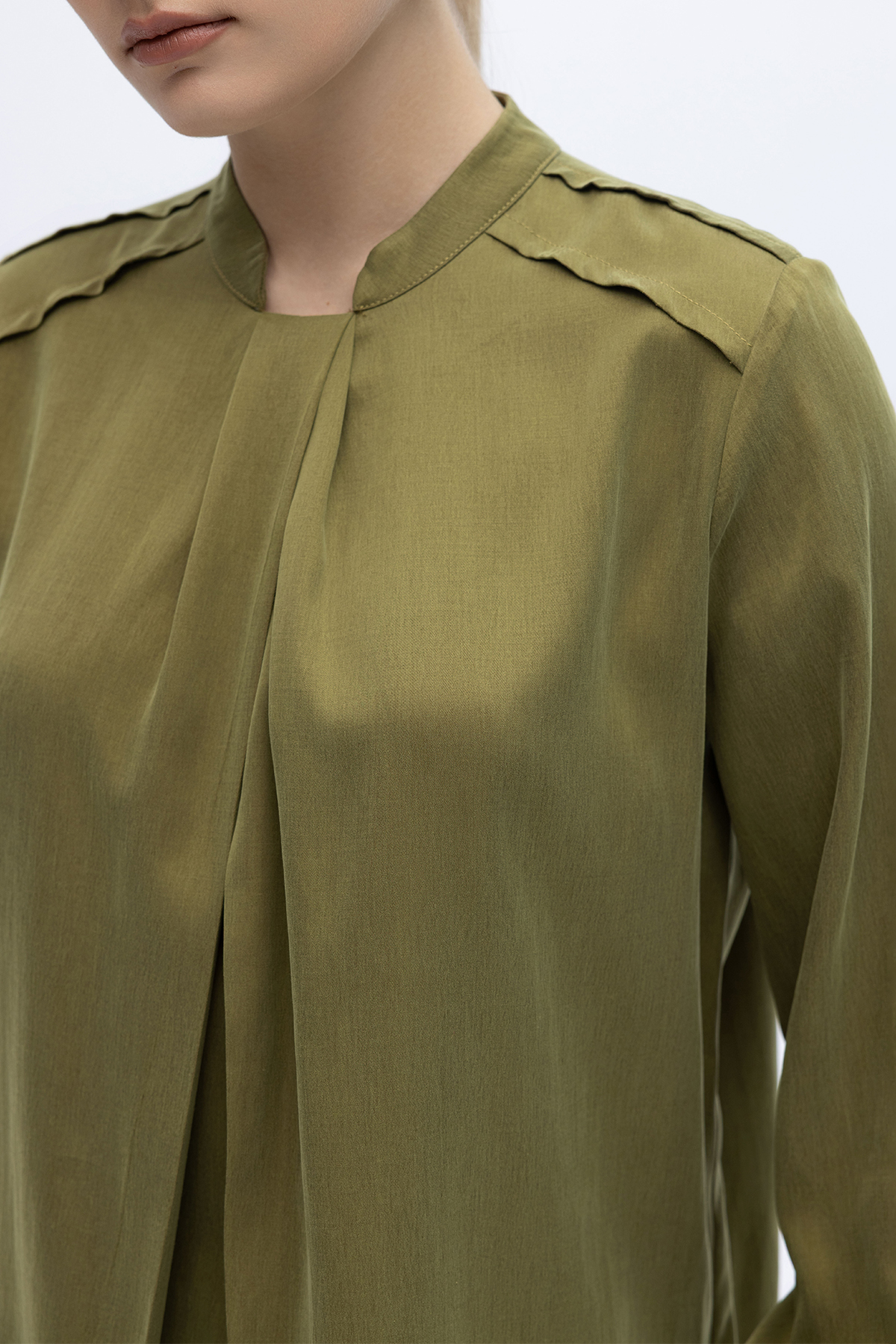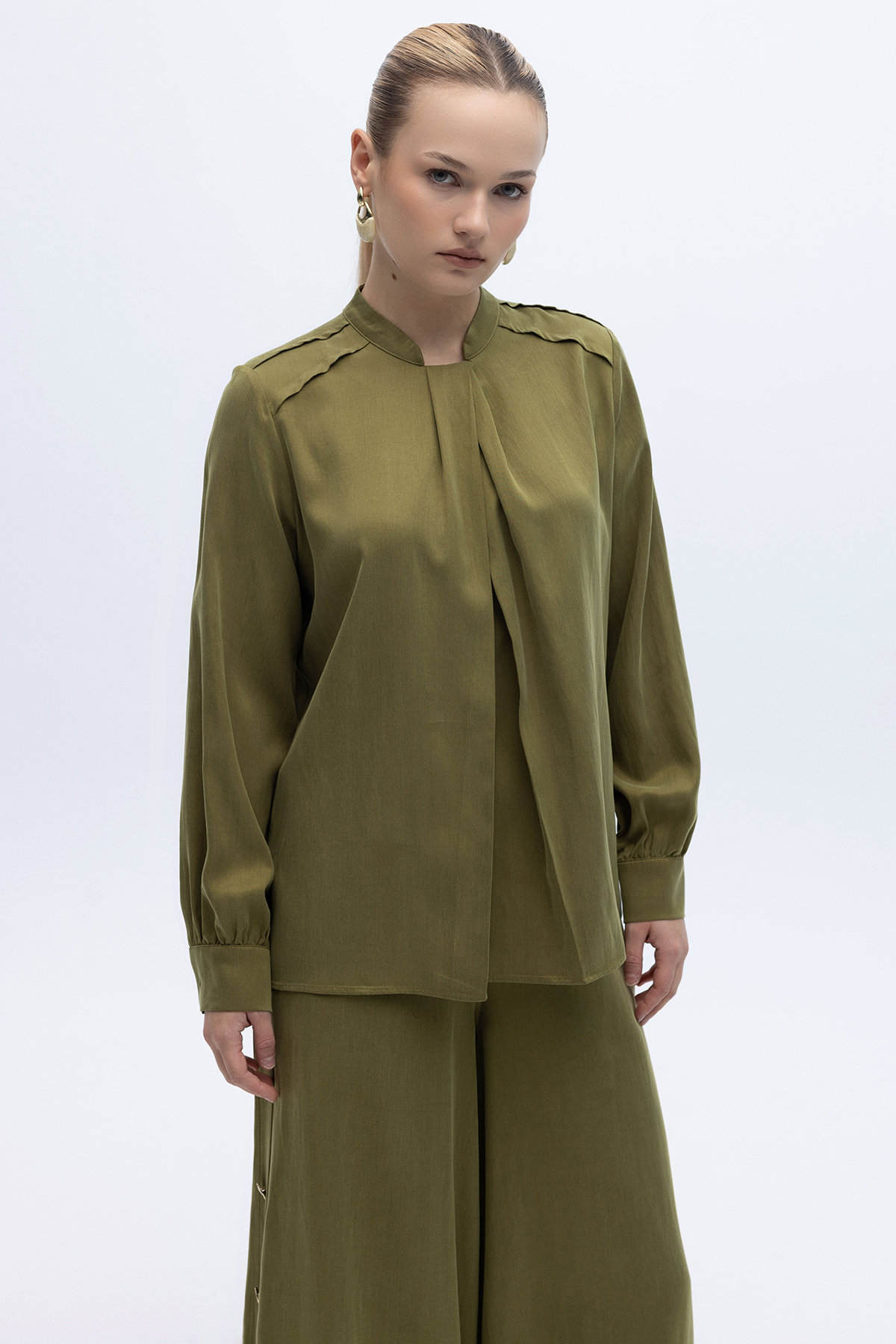 Yakası Hareketli İpek Cupro Gömlek Olive