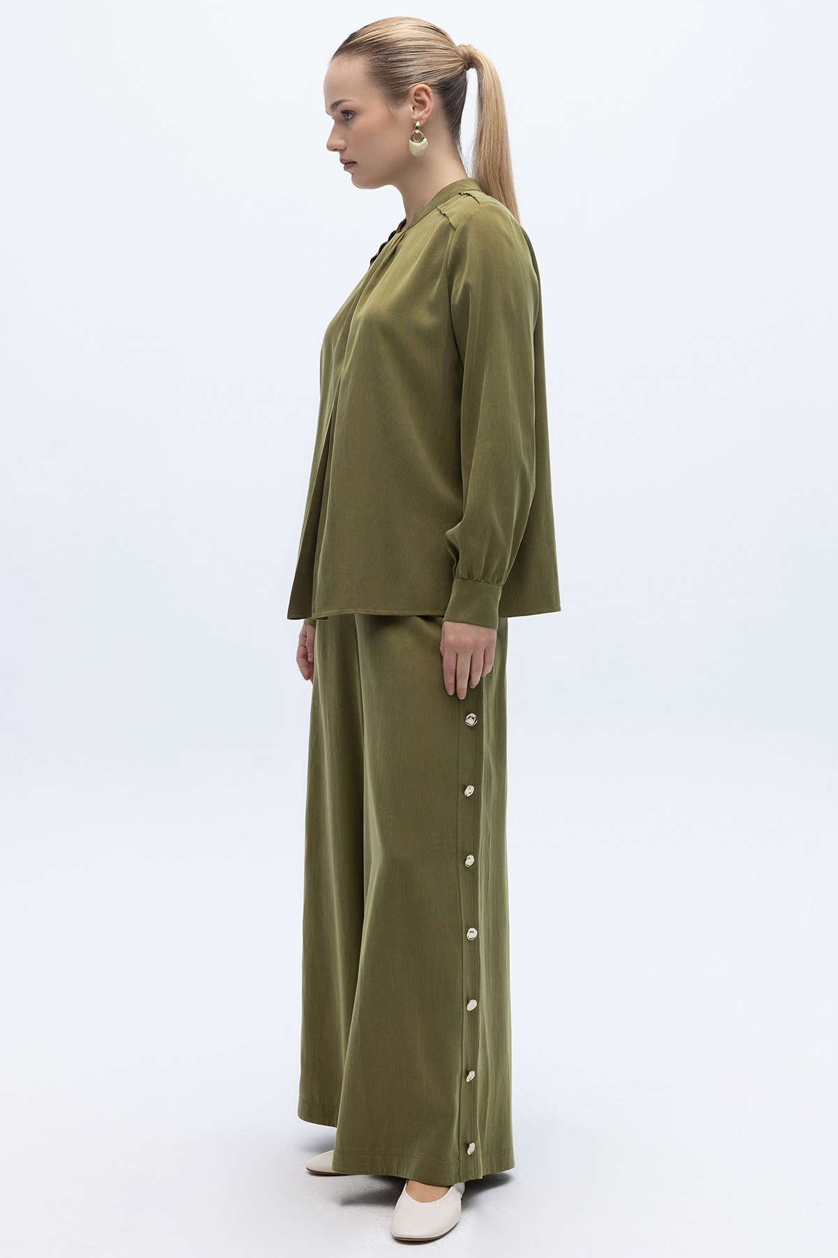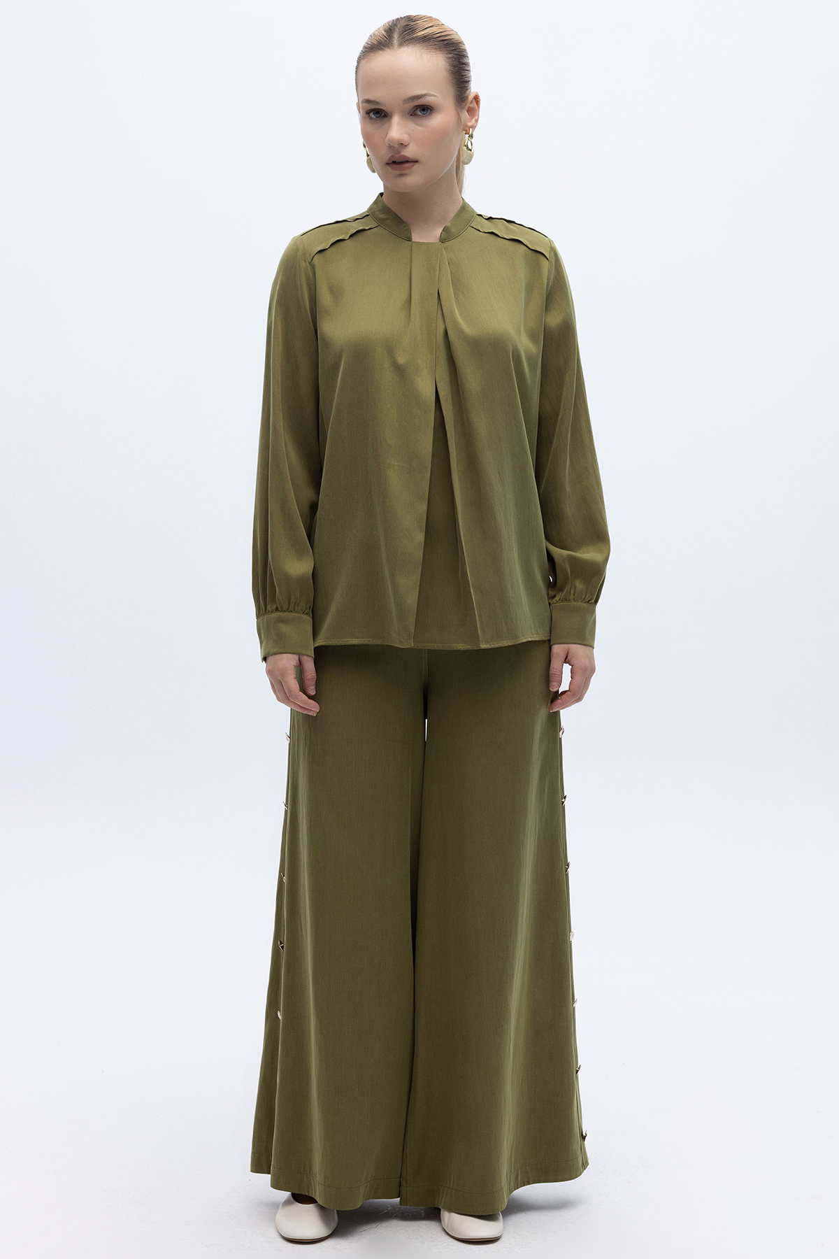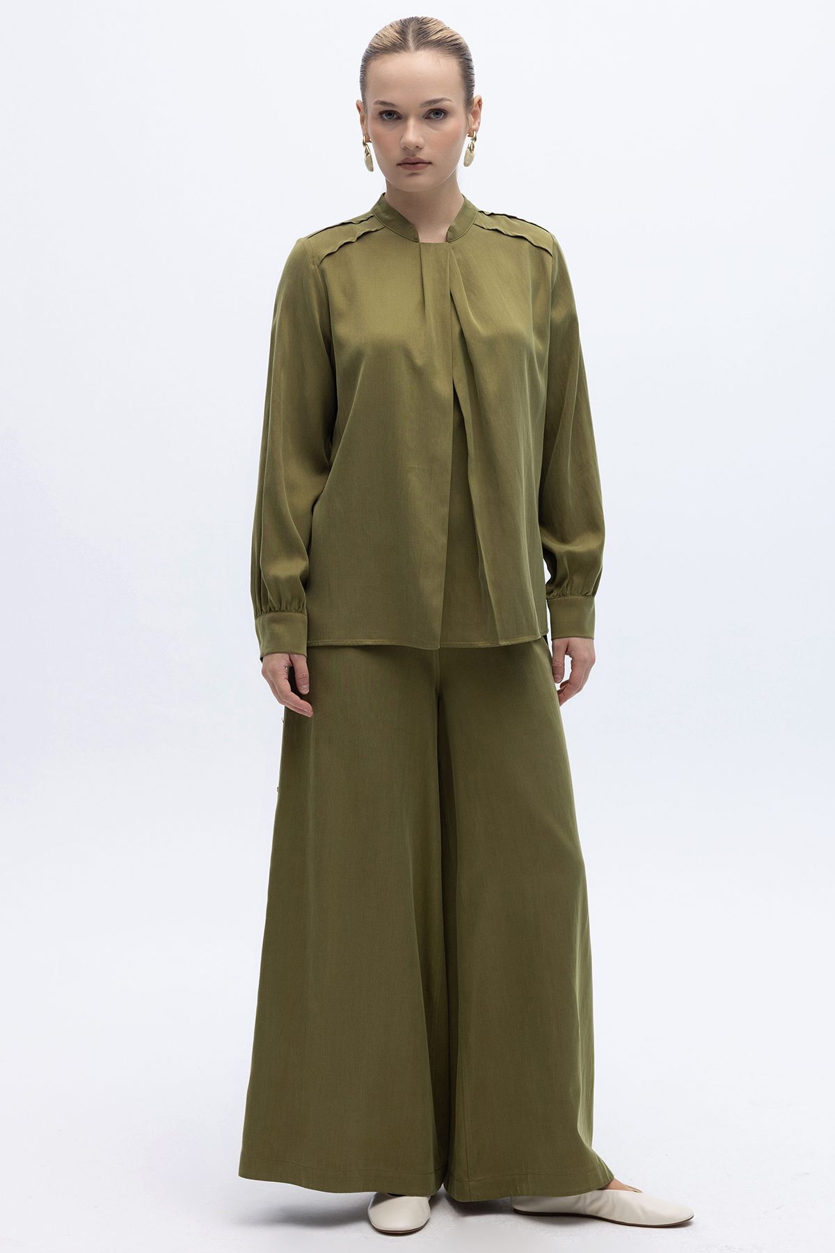 Yakası Hareketli İpek Cupro Gömlek Olive