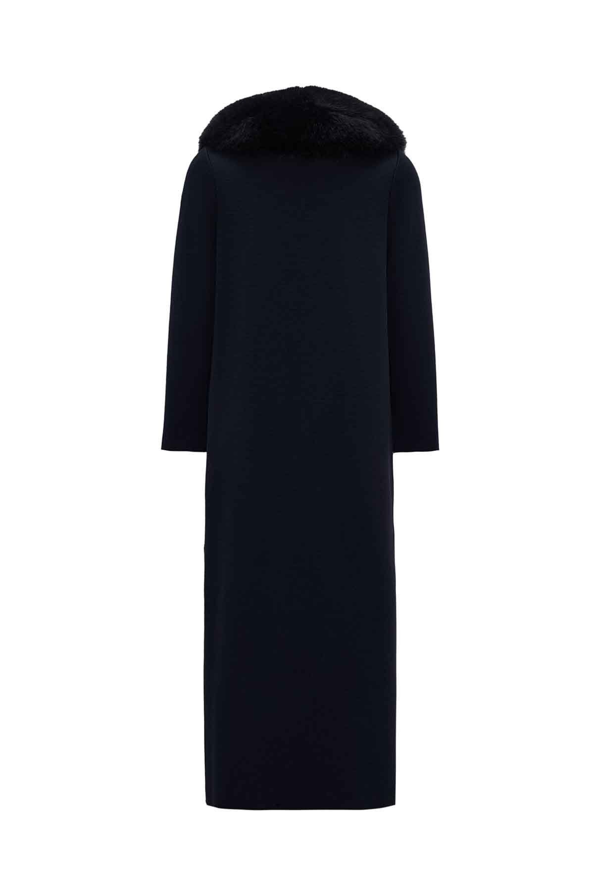 T26K-8001 Yakası Kürklü Uzun Kruvaze Triko Ceket OASI-DARK NAVY