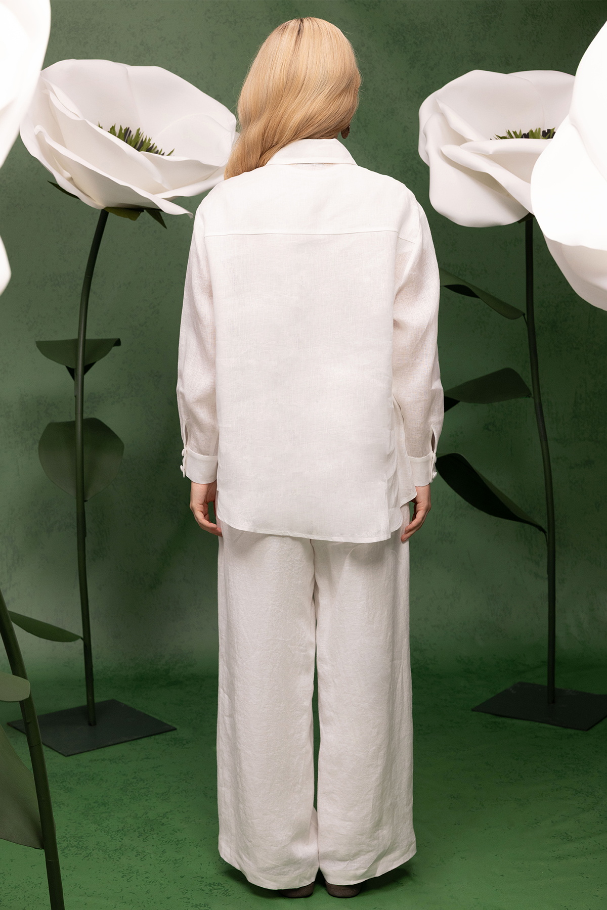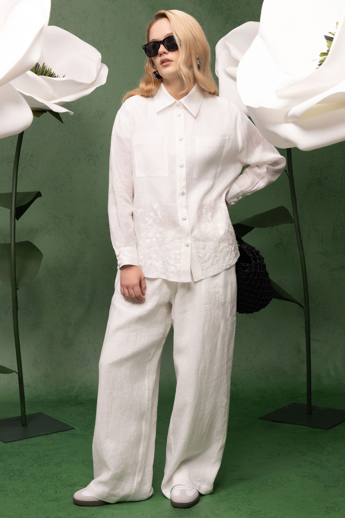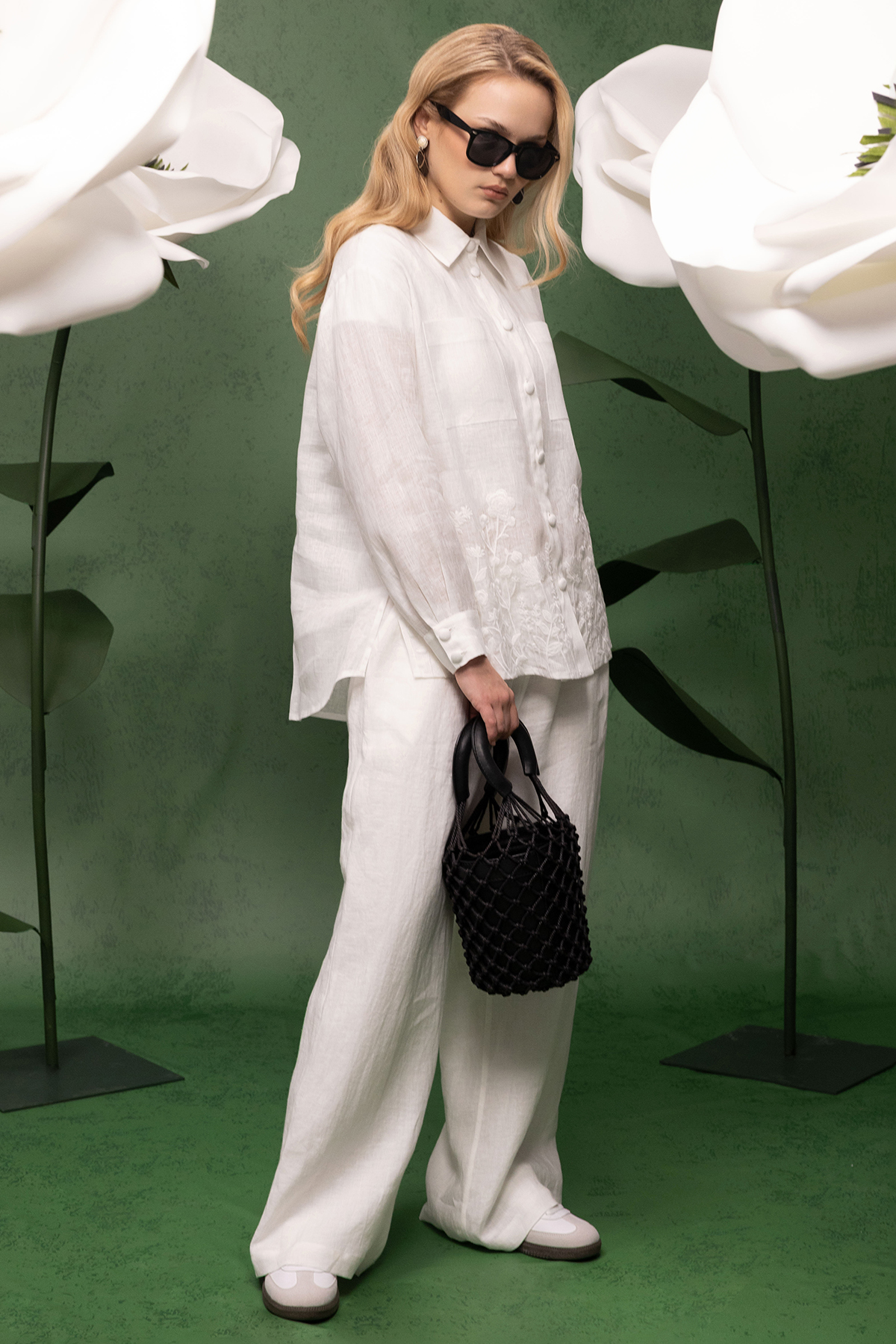 Yandan Cepli Bol Paça Keten Pantolon Ekru